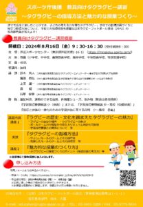 8月16日(金)に開催を予定しておりました、教員向け講習「タグラグビーの指導方法と魅力的な授業づくり」(東京会場)につきまして、台風7号接近の予報を受けまして、中止とさせていただきますのでお知らせいたします。