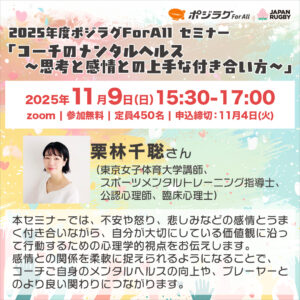 実は一線は退いたものの、まだレフリーはしています。プレーヤーを育てていくという観点で特に1年生のゲームはしっかりとレフリングしたいと考えています。ルールを知らない子供たちに正しいプレーを伝えることは勿論ですが、楽しさを伝えることも大切に一生懸命、笛を吹いています。