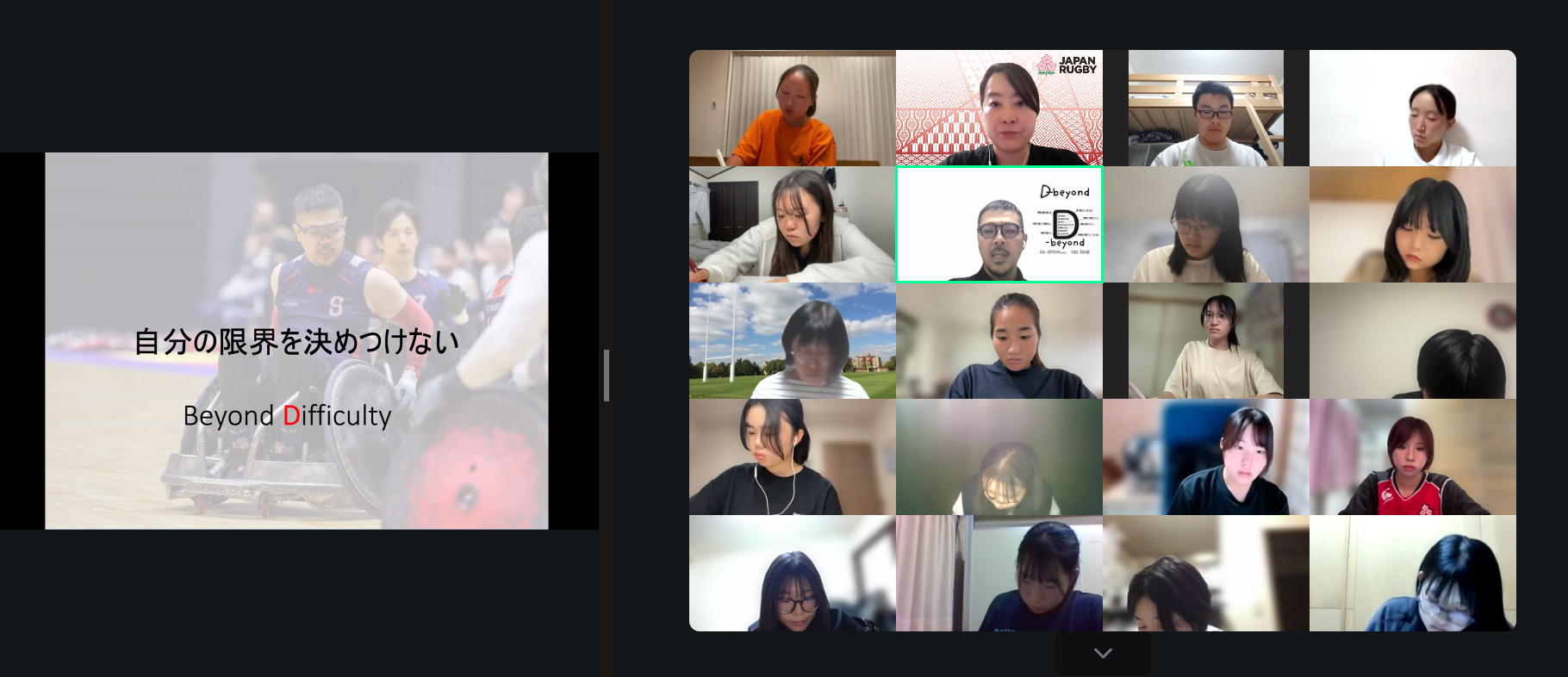 前半の講義に引き続き、三阪さんにも質問が相次ぎました。「選手とコーチで気持ちの変化はありますか」「教える立場になって変えたことは」といった内容から「選手時代は、どんな筋トレをしたのですか」といった選手目線の素朴な質問まで多岐にわたりましたが、こちらも分かりやすく答えてくださいました。参加者にとっては、ビジネスフィールドにおけるラグビーの存在、パラスポーツの魅力と、様々な知見を得られた第3回の講義でした。