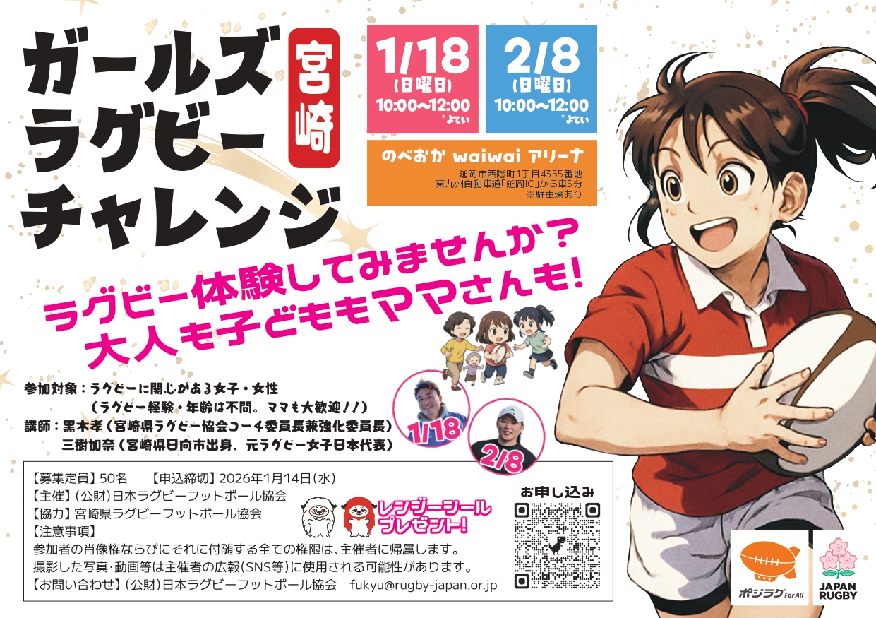 公益財団法人日本ラグビーフットボール協会(JRFU)は、女子ラグビーの普及を目的にガールズラグビーチャレンジ in 宮崎を開催いたします。
