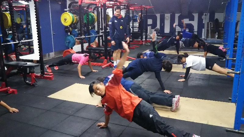 ARAでは、様々なスキルチェックを経てグラウンドでの練習も始まりました。もちろんコーチの指導はすべて英語で行われます。身振り手振りも交え、懸命にコミュニケーションをとる高校生。ウォーミングアップでは海外の男子選手とともにタッチフットに参加するなど、ラグビーを通じた国際交流を実践します。
