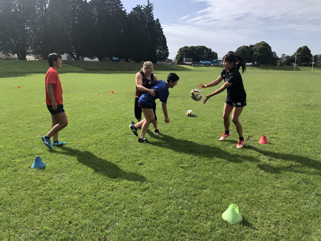 今週スキルトレーニングを担当するKendraコーチはBOPRUの女子普及担当でもあり、日本でもプレー経験のある現役の女子ラグビー選手です。なぜこのメニューに取り組むのか、何を学ぶのかが明確なトレーニングでは「ミギ!」「ヒダリ!」といった片言の日本語も交じり、ラガールの緊張も自然と解けていきました。