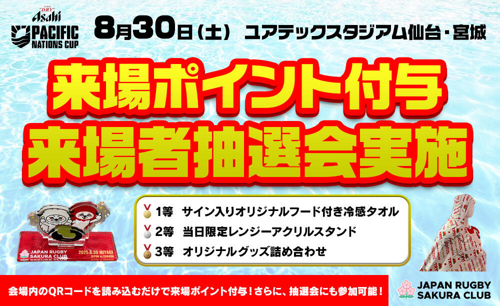 ラグビーワールドカップ(RWC)2007カナダ戦で歴史に残る同点ゴールを決めた元日本代表の大西将太郎さんをMCに迎え、先のウェールズの振り返りやアサヒスーパードライパシフィックネーションズカップ2025に臨む日本代表の展望、また翌日22時より開催される女子RWC2025イングランド大会のNZ戦の見所を、地元仙台出身の真壁伸弥さんと福島県出身の大野均さんの元日本代表コンビに加え、釜石出身で女子RWC2017に出場した平野恵里子さんで囲む試合前必聴のトークライブ。人気急上昇中のラグビー芸人しんやさんも飛び入り参加します。