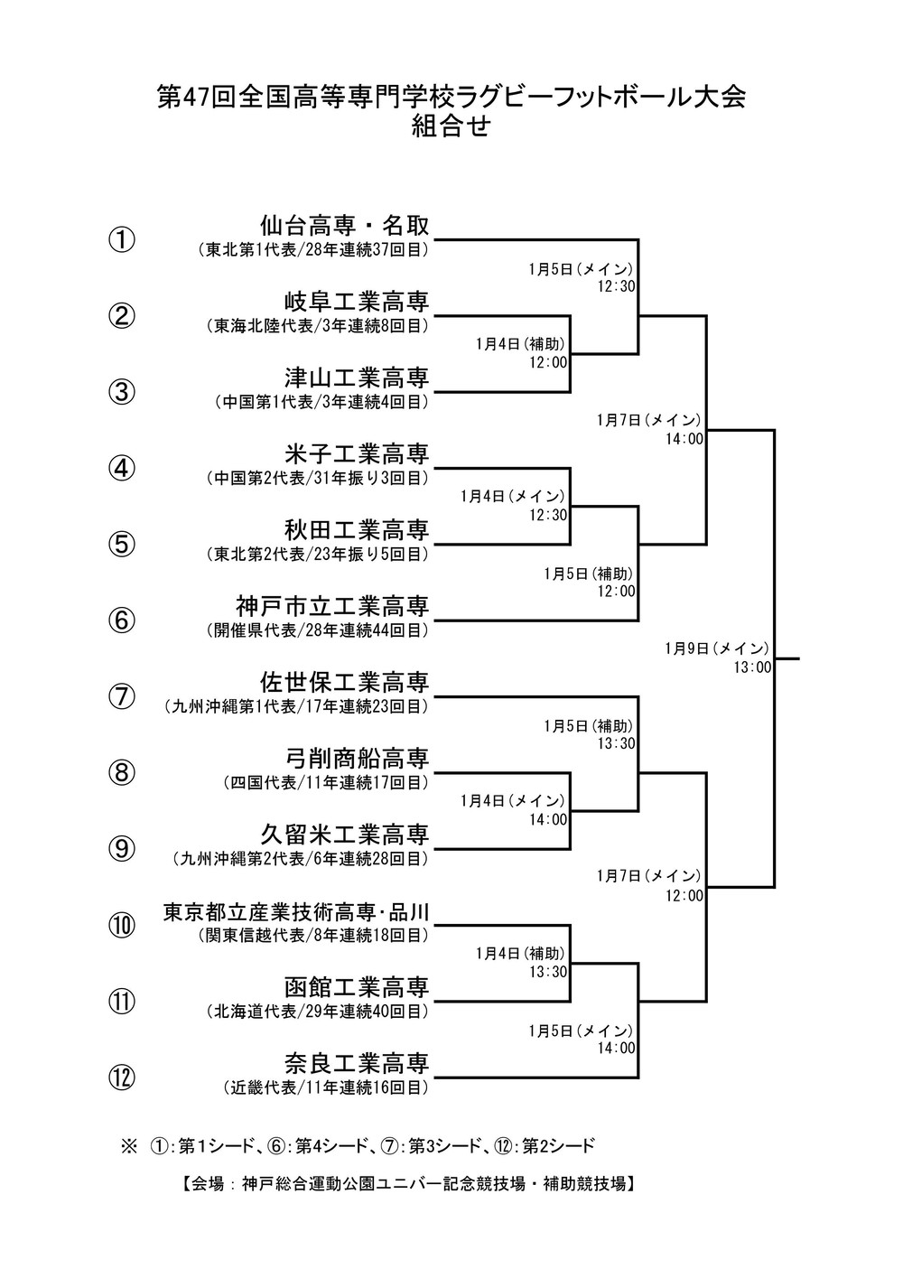 2017年1月4日から9日まで兵庫県・神戸市で行われる 「第47回全国高等専門学校ラグビーフットボール大会」の組み合わせが決定いたしましたのでお知らせいたします。