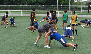 午後はRugirl-7のコーチで、ニュージーランドでラグビーでは州代表レベル、タッチでは国代表経験のある、ウィサン・ダニエル・パーカ氏と、Rugirl-7の監督である元日本代表増保輝則氏の指導により、日体大女子タッチ選手とRugirl-7合同での7人制ラグビー体験クリニックが行われました。 普段は全くコンタクトする機会がないタッチプレーヤーたちは、初めかなり躊躇していましたが、経験したことが無い感覚に次第に新鮮さを感じ、中には「ラグビー、面白い!」と興奮する選手もいて、新しい発見があったようです。仕上げにラックでのプレーヤーの「はがし」を想定した練習も行いましたが、一回一回のセッションが終わるたびに、お互い顔を見合わせて思わず大笑いする姿などが見られ、とてもよい刺激になったようです。 最後は、「タッチ」と「タックル」の中間として「ホールド」によるゲームが行われ、ラグビーとタッチラグビー、どちらの選手にとっても、非常に良い経験となったクリニックが終了しました。 最後のあいさつでは、ウィサンコーチが自らの経験から「ラグビーとタッチラグビー、両方経験することでお互いにプラスになるはず」「同じプレーヤーがラグビーとタッチラグビー両方のゲームを楽しむ環境ができれば素晴らしい」とコメント。 今回はトライアル的な取り組みでしたが、広い意味での「ラグビーファミリーの増大」へ向け、今後も他競技団体との交流を図ってゆければと考えます。 最後になりましたが、今回このような機会をご提供していただいたジャパンタッチ協会へ感謝申し上げます。
