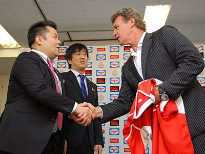 6月22日(水)、日本ラグビーフットボール協会にて、日本代表の新ジャージがお披露目されました。 オフィシャルサプライヤーの、株式会社カンタベリーオブニュージーランドジャパン提供の、新機能を備え、新素材となった新ジャージの発表とともに、よしもとクリエイティブ・エージェンシーに所属するブラックマヨネーズ(小杉竜一、吉田敬)のお二人を、ラグビーファミリーとして認定。 新ジャージを身にまとまった日本代表のこれからの活躍と、ラグビーファミリーとして一緒にラグビー界を盛り上げていただく、ブラックマヨネーズのお二人の活躍にもご注目ください。 ◎日本ラグビー協会 矢部達三専務理事 「本年9月に開幕する、ラグビーワールドカップまで、気が付けばすでに80日を切りました。日本代表オフィシャルサプライヤーである、株式会社カンタベリーオブニュージーランドジャパン様より、きたる26日のチャリティーマッチからお披露目となる、日本代表新ジャージをご提供いただけることになりました。このたび、選手たちの能力を最大限にサポートし、誇りある日本代表にふさわしい装いの新ジャージが完成しました。 新しいジャージの開発にご協力いただいた、カンタベリー社様にこの場を借りて、感謝申し上げます。新ジャージを身にまとった日本代表選手たちが世界の舞台で、今の日本に勇気を届けられる素晴らしい活躍をしてくれることを期待し、また、信じたいと思います」 ◎株式会社カンタベリーオブニュージーランドジャパン 瀬川博一社長 「今回の新ジャージは着用時の運動面、機能面の向上を目指して開発してまいりました。日本代表選手ら、多くの意見をいただいて、今回のジャージが完成いたしました。ご協力いただいた皆様、ありがとうございました。 これからワールドカップに向けて、新しいジャージを着た日本代表が世界の強豪と渡り合い、勇気を与えてくれ、なおかつ、結果をもたらしてくれると確信しています。今回発表のジャージに満足することなく、より進化したジャージを提供できるように、努力をしてまいりたいと思います」 ◎日本代表ヘッドコーチ ジョン・カーワン 「ジャージは、選手と同じようにあるべきものです。強くて、フィットして、勝たなければならない。だから、ジャージにも勝ってもらいたい。ですので、カンタベリー社には感謝申し上げます。その感謝を示すには、ワールドカップで結果を残すことだと思います。勝つためには、チームも最先端をいかなければなりません。あとは勝つことしか残されていません。今週末、チャリティーマッチから、ワールドカップへ向けての旅路が始まったのだと思っています」 ◎日本代表 菊谷主将 「新しいジャージの、この色は好きです。シルエットが体のパーツにフィットしていて、着心地がよく快適です」 ◎日本代表 畠山選手 「以前着ていたものより、軽く感じます。(グリップパネルのように)ポジションを考慮して作っていただき、大変ありがたいです。カンタベリー社の方にも感謝いたします」 ◎日本代表 吉田選手 「着ていてフィット感があり、動きやすい。スクラムハーフは、つかまれるのが嫌なので、(スリップパネルの)こういった機能は助かります」 矢部専務理事からラグビーファミリー認定証を受け取るブラックマヨネーズの吉田さん ジョン・カーワン ヘッドコーチから日本代表のジャージを受け取るブラックマヨネーズの小杉さん ◎ブラックマヨネーズ 小杉竜一氏 「感無量です。高校3年間ラグビーをやり、そこで何かに向かって頑張る、自信を持つということを学ばせてもらいました。芸人として、ラグビーで培ったものを生かして、今現在があると思っています。そんな僕がラグビーファミリーとして迎えてもらえるということは、恩返しのチャンスだと思います。世間にラグビーの良さを広められるように頑張りたいです。 …まさか、日本代表のヘッドコーチからジャージを渡されるなんて…最高です」 ◎ブラックマヨネーズ 吉田敬氏 「すみません、タックル、という言葉しか知らなかったんですが、このジャージを着た途端、タックルをしたくなりました!」 全員で記念撮影