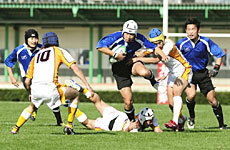 C:2008, JRFU(Photo by A. HASEGAWA) 近畿大学ラグビー同好会ドルフィンズ 38-65 早稲田大学こんぷれっくすラグビーチーム(2008年12月20日 at大阪・近鉄花園ラグビー場) こんぷれっくすの先蹴で始まったゲームは、ドルフィンズが積極的にオープンプレーで揺さぶりをかけるが、こんぷれっくすの堅守に阻まれ、ゴールラインを割れない。8分、攻勢に転じたこんぷれっくすは敵陣ゴール前ラックから右展開、最後はFL7番 新ケ江がトライ。ここから12分、23分と立て続けに、こんぷれっくすが加点(2トライ・1ゴール)。ドルフィンズは、攻めながらも最後の詰めが甘く、前がかりになった分、こんぷれっくすに容易に逆襲される展開が続き、前半を終わって17-29。 セットプレーの安定度に差が見受けられ、後半はこんぷれっくすの一方的な展開になるかと思われた。 ところが後半開始から、ドルフィンズがラッシュをかけ、44分、こんぷれっくすゴール前ラックからHO2番 小西-CTB13番 高橋とつなぎトライ。ゴール成功で22-29。ドルフィンズのBKディフェンスラインが、前で効果的に止めるのに対し、こんぷれっくすBKのタックルが甘く、ボールキープもドルフィンズが上回るようになる。55分、自陣22mライン付近でこぼれたボールをFB15番 佐古が拾い、そのまま75mを走り抜け中央にトライ。ゴールも決まり、逆転に成功する(31-29)。直後の57分、ハーフウェイライン付近で相手キックをキャッチした、こんぷれっくすFB15番 田中がカウンターアタック、巧みなステップでDFをかわし、HO2番 安岡につなぎトライ。ゴールも決まり再逆転に成功(31-36)したあたりから、こんぷれっくすが落ち着きを取り戻し、4トライの追加に対し、ドルフィンズは1トライを返すに留まり、ファイナルスコアは38-65で、早稲田こんぷれっくすの2連覇となった。 結果は大差となったが、フィットネスを不安視されたドルフィンズが、後半一旦ゲームをひっくり返す場面もあり、BKを中心とした堅守を見せた。一方こんぷれっくすは体格差を生かし、安定したセットプレーでラインブレイクを繰り返す場面は見事であったが、前半中盤からBKのタックルが甘くなり、一時チームが混乱するなど、チームが未完の域を脱していない印象を受けた。ゲーム内容は昨年より格段に詰まっているが、次のステップ(地区対抗選手権)へ進むには、ゲームマネジメントで未熟な面が多々見受けられ、タイトなゲームの経験を積む必要性を感じた。 早稲田大学こんぷれっくすラグビーチーム ○安永準一監督 「点差ほどチーム力に差がなかった。プレッシャーをかけられた場面でBKの脆さが出た。前半終了頃から後半序盤にかけチームが勢いを失い、逆転を許す展開になってしまった。ハーフタイム時の調整に工夫が必要だ。 週4回の練習で、フィットネスに自信を持っていたが、終盤までドルフィンズに食い下がられ、まだまだ練習不足だと痛感した。 地区対抗出場校とは、フィットネスで追いつきつつあるが、展開力、スキルで依然差があり、どう埋めていくかが課題だが、まずはフィットネスから活路を見出したい」 ──東西対抗試合の意義について。 「学生がシーズン中、一番幸せな顔してプレーするステージであり、それだけ"花園"は学生に高いモチベーションを与えてくれる。次回もこの地に戻ってプレーできるよう、努力したい」 ○寺西宏之キャプテン「アタックは及第点だが、個々はよかったものの組織としてのディフェンスに課題が残った。後半は、焦りから意思疎通が図れず相当苦戦したが、セットプレーの安定でなんとか勝利につなげられた。 今日の優勝は部員全員で勝ち取ったものであり、フィットネス強化等苦しい練習の積み重ねであるだけに格別である。来年について、3連覇はもちろん地区対抗出場も果たすべく、練習を重ねていきたい」 近畿大学ラグビー同好会ドルフィンズ ○吉川正規監督「昨年大敗した経験を糧として、負けはしたが、点差以上にいいゲームができた。体格差にめげず低いタックルでよく対抗し、後半に一度でも逆転した経験は次に活きるはずだ。 次年度へ向けては、個々のスキル及びフィットネスの向上と同時に、得点パターンのバリエーションを増やしたい」 ──同好会の存在意義について。 「自分たちで何をすべきか責任を持って考え、プレーする場であり、失敗すればそれを糧に次に活かすような場であって欲しい」 ○佐古聖仁キャプテン「体格差があったとはいえ、タックル力に現れた通り、BKのディフェンス力が弱い。攻めているにも係わらずミスで取り切れない精神的な弱さも含め、タイトなゲームを多く経験するなかで、次回に雪辱を期したい」