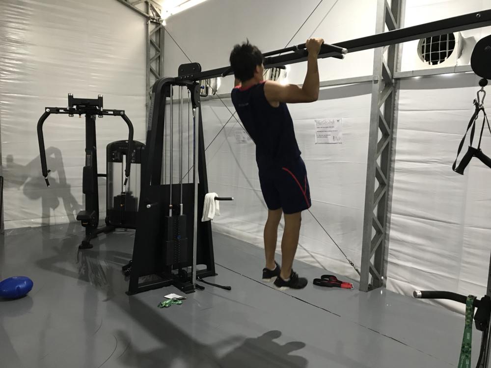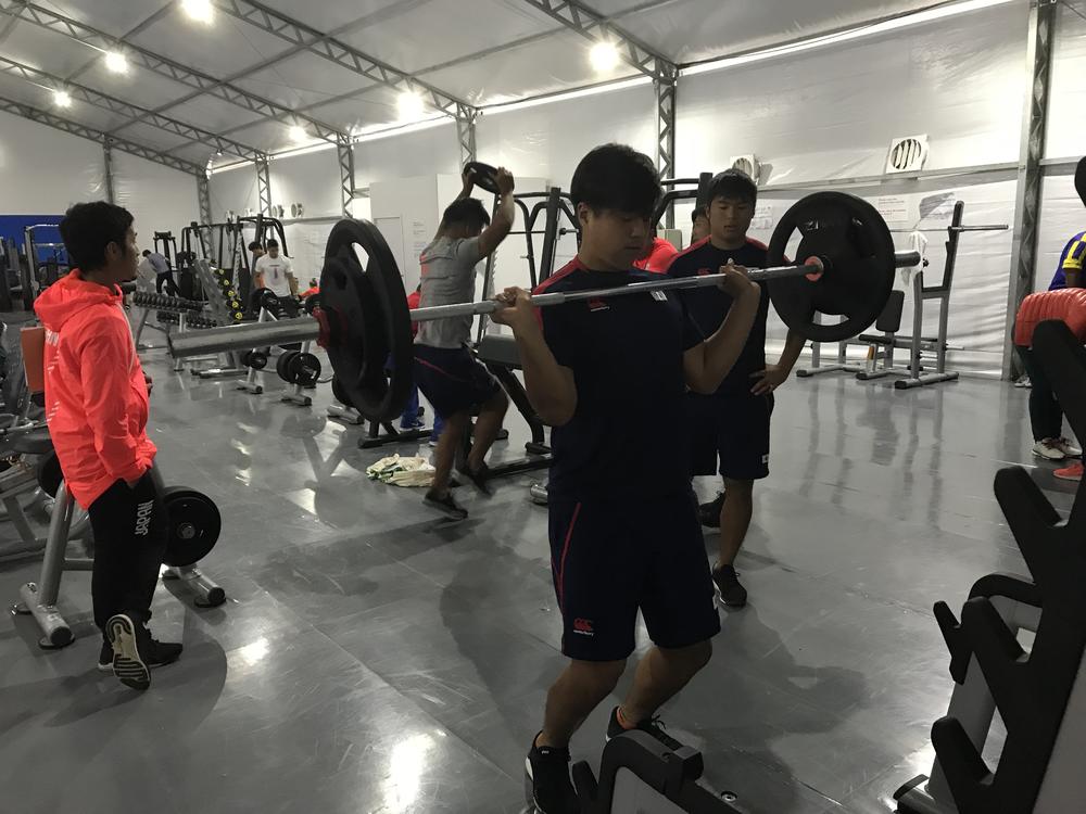 その後、選手村内のジムでウエイトトレーニング。目標を達成するため、意識高く取り組みます。