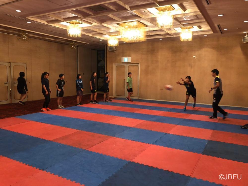 午後は試合でのフィードバックプレー(仕掛け/判断)とベーシック/スペシャルスキルを行いました。フィードバックでは2対2、3対3を実施し、ボールキャリアとサポートプレーヤーの狙い の共有や判断を意識し、べ―シック/スペシャルスキルではハイボールキャッチ/ドロップ キックの基本練習をしました。