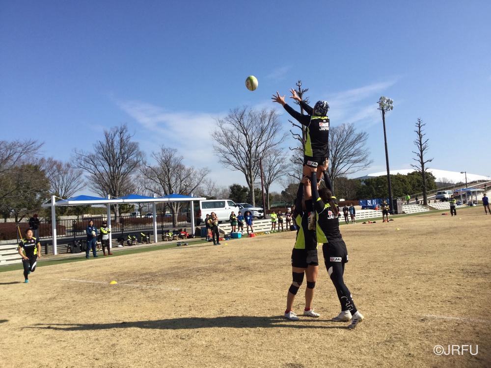 まずは、今朝習ったルーティンを各自で行い、チームウォームアップでしっかり身体を動かします。その後、前半は2グループに別れてパスとボールキャリーのスキルトレーニングを行いました。また、後半は、3チームに分かれてゲーム形式のトレーニングを行いました。スキルトレーニングで習得したことをゲームに活かそうと、しっかり1人1人が勝負し、ボールを繋ぐ場面が多々ありました。