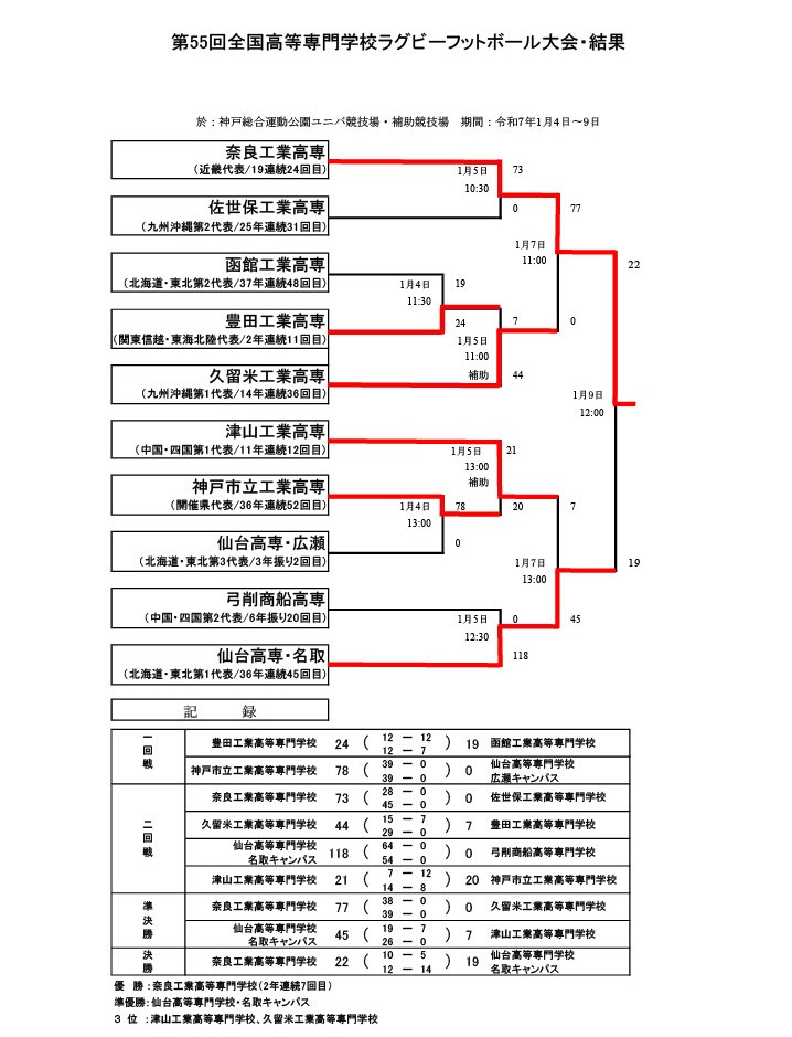 試合結果をお知らせいたします。「第55回全国高等専門学校ラグビーフットボール大会」は、奈良工業高等専門学校が2年連続7回目の優勝となりました。