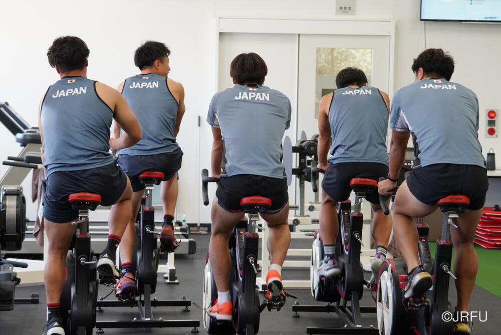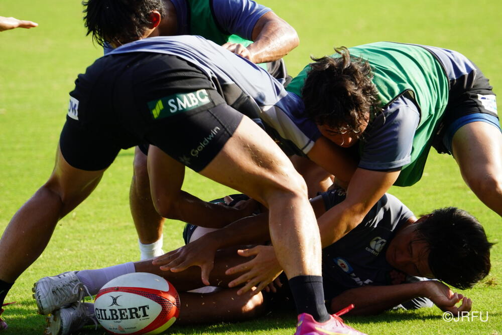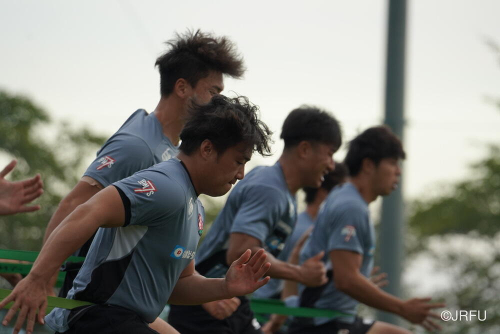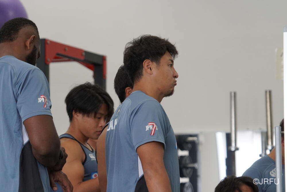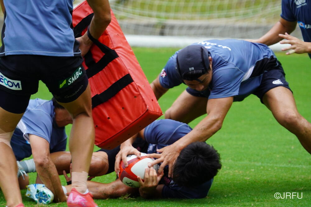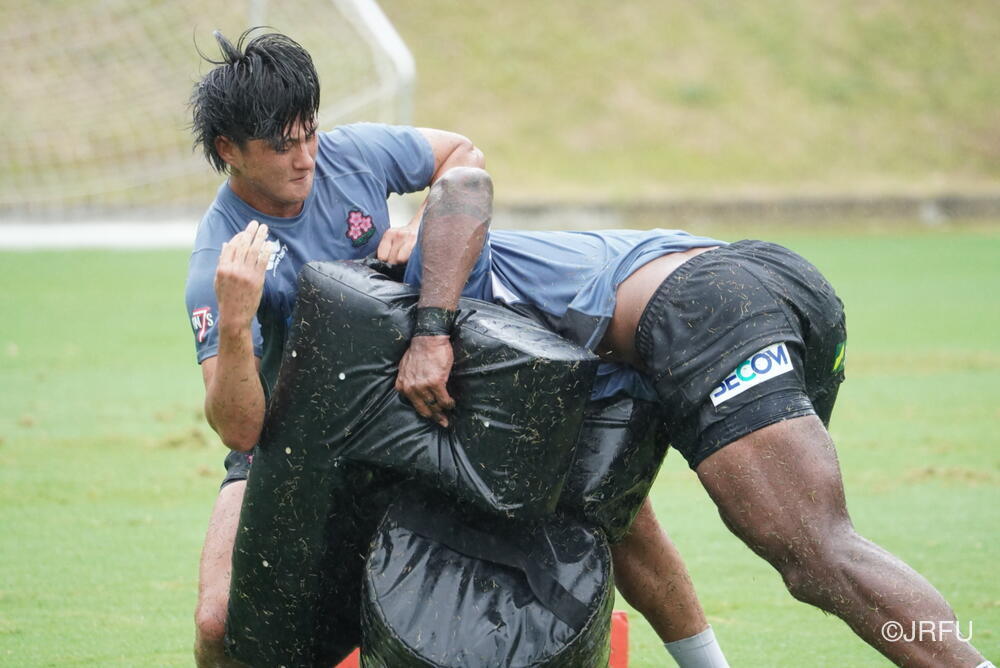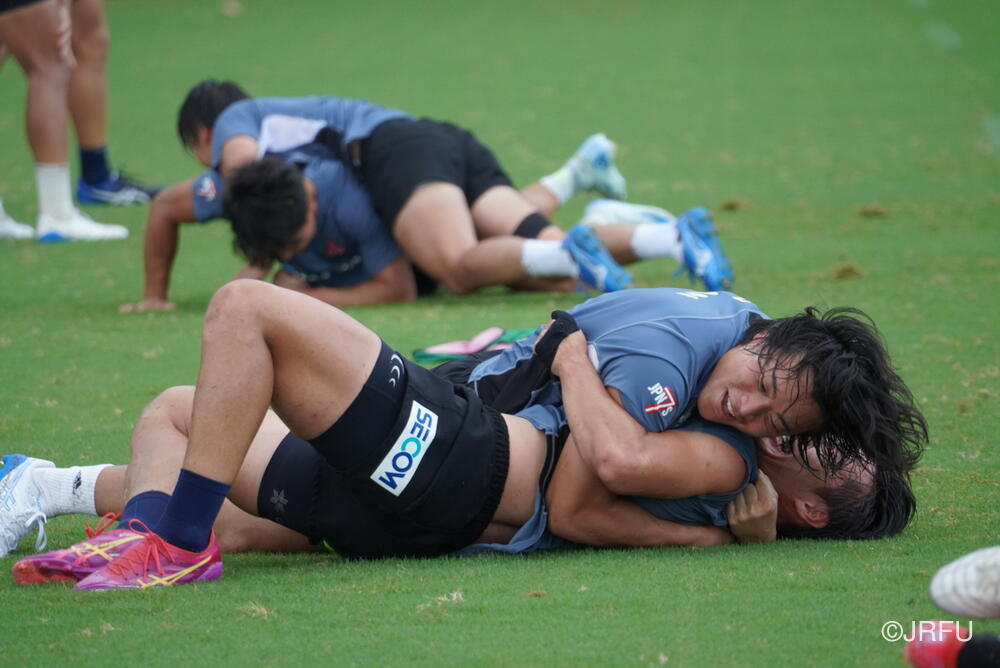 午前中はジムで下半身を中心にトレーニングを行い、その後のフィールドでは、時折雨の降る中でブレイクダウンやディフェンスの基礎に取り組みました。