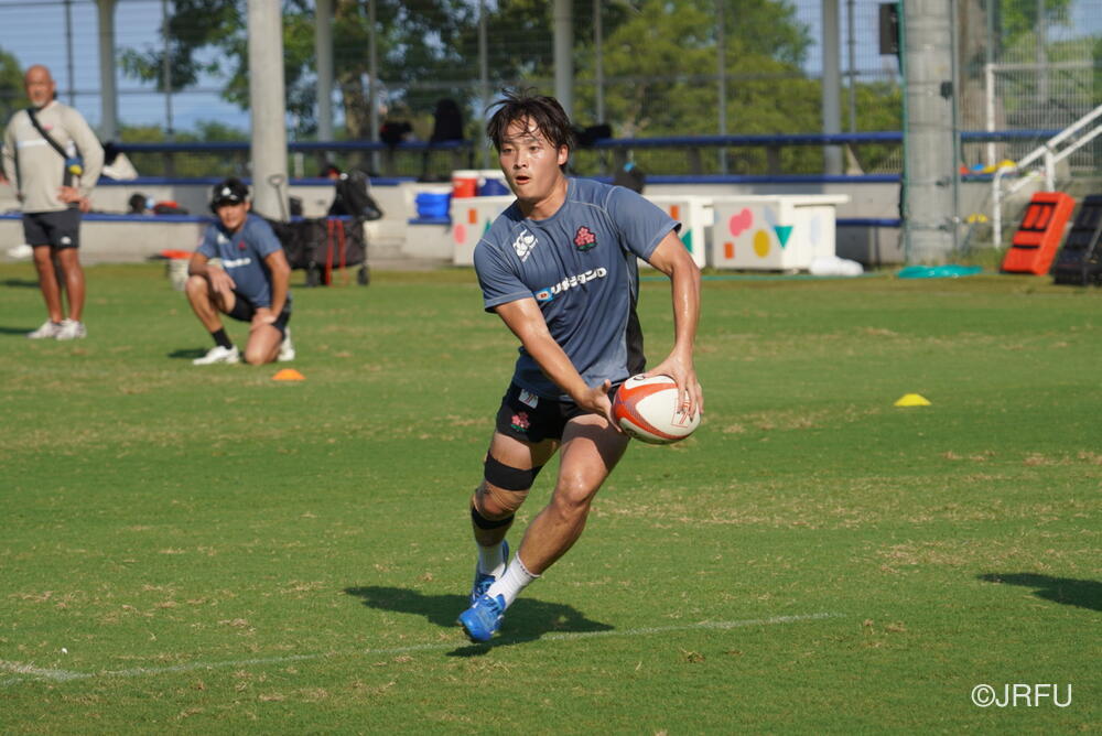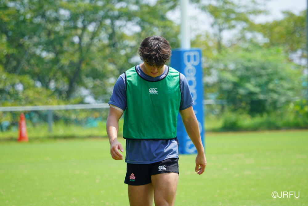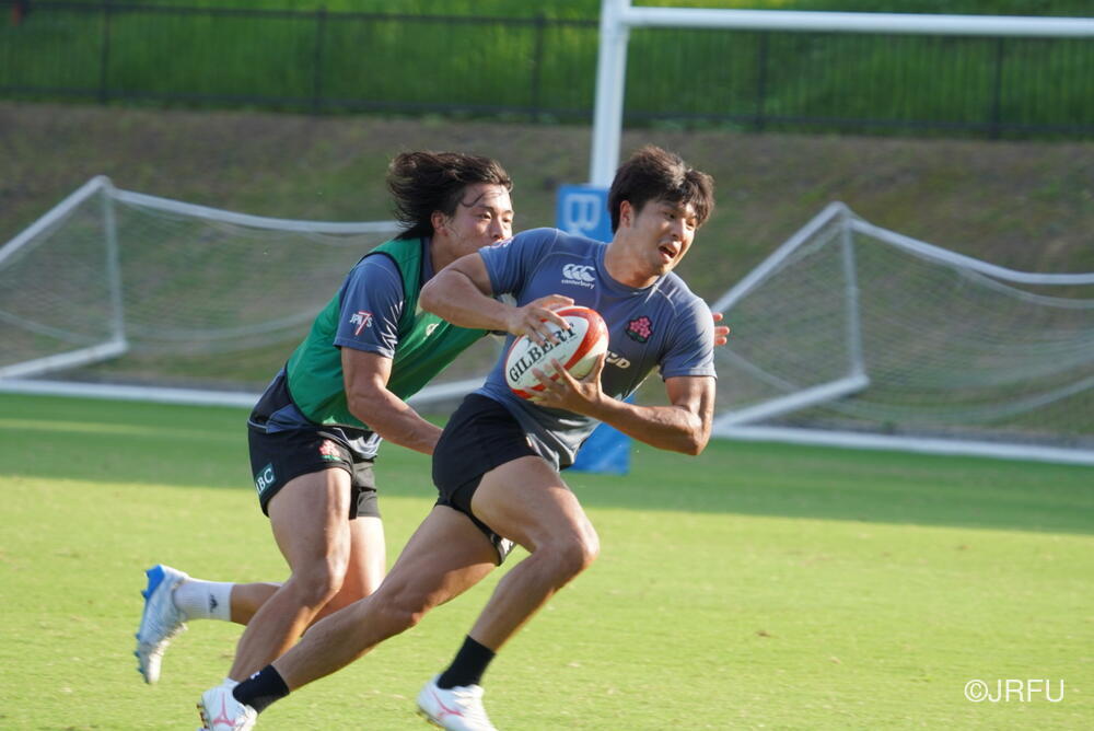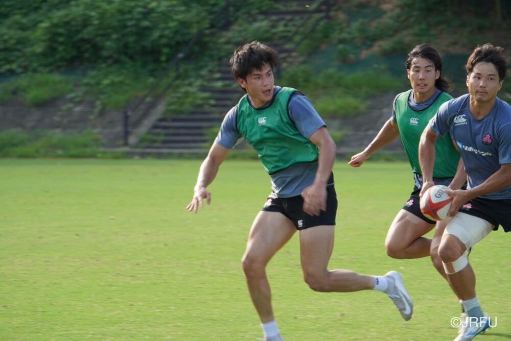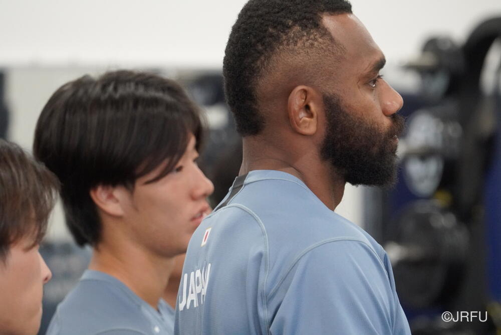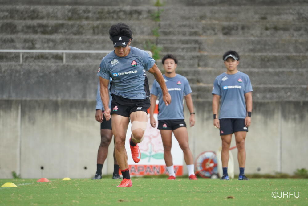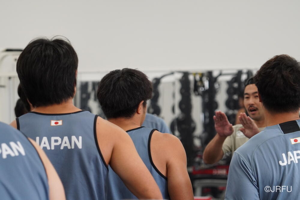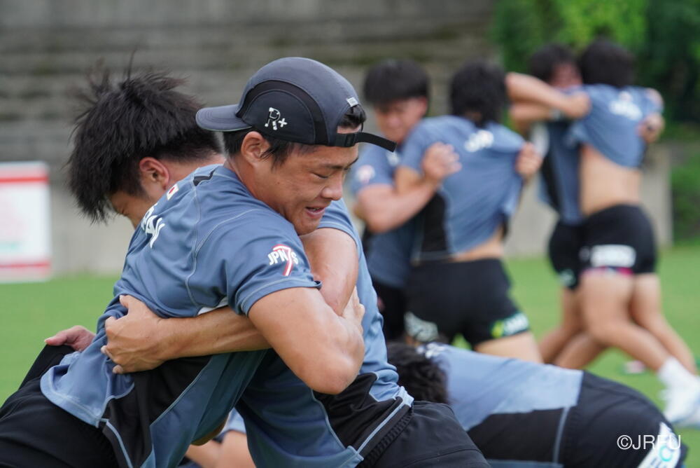 午前中はジムで下半身を中心にトレーニングを行い、その後のフィールドでは、時折雨の降る中でブレイクダウンやディフェンスの基礎に取り組みました。