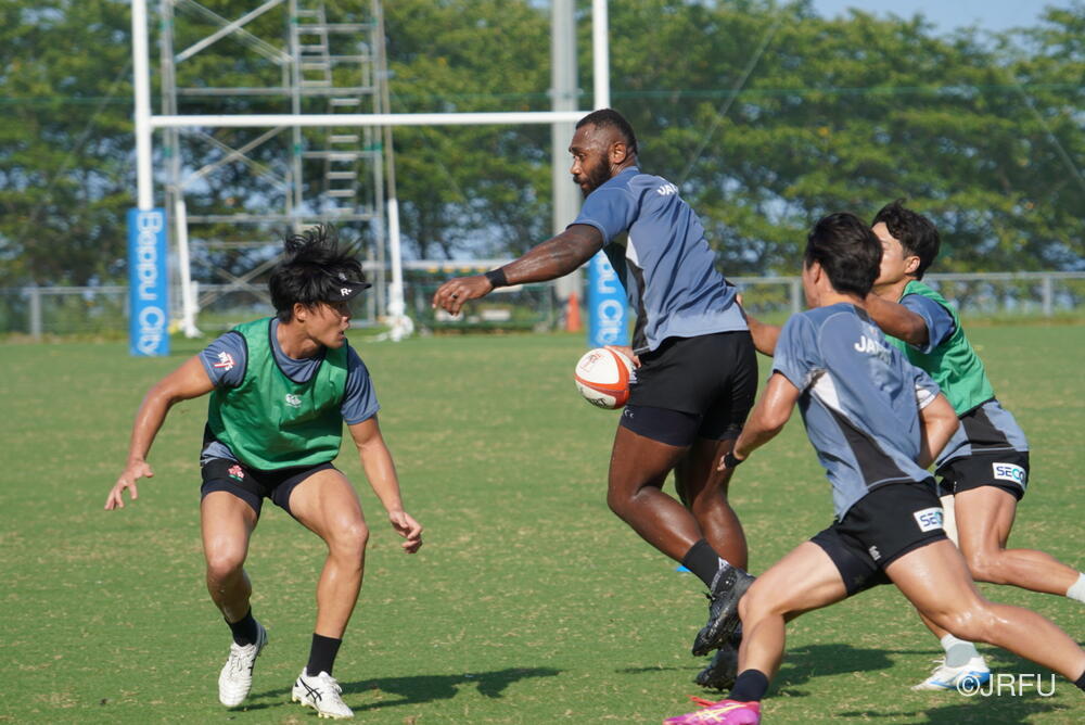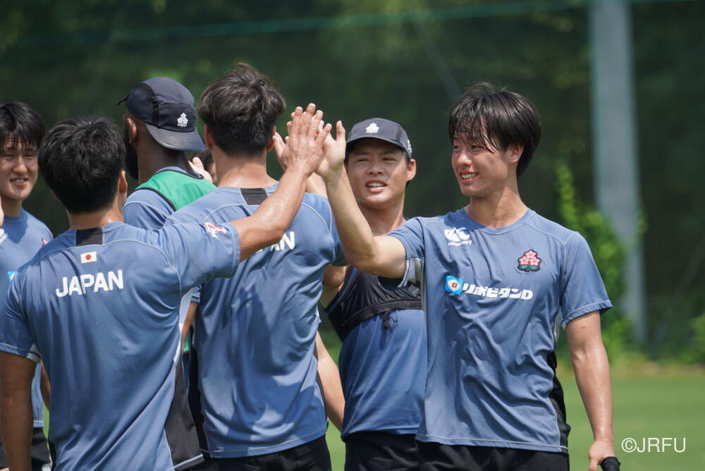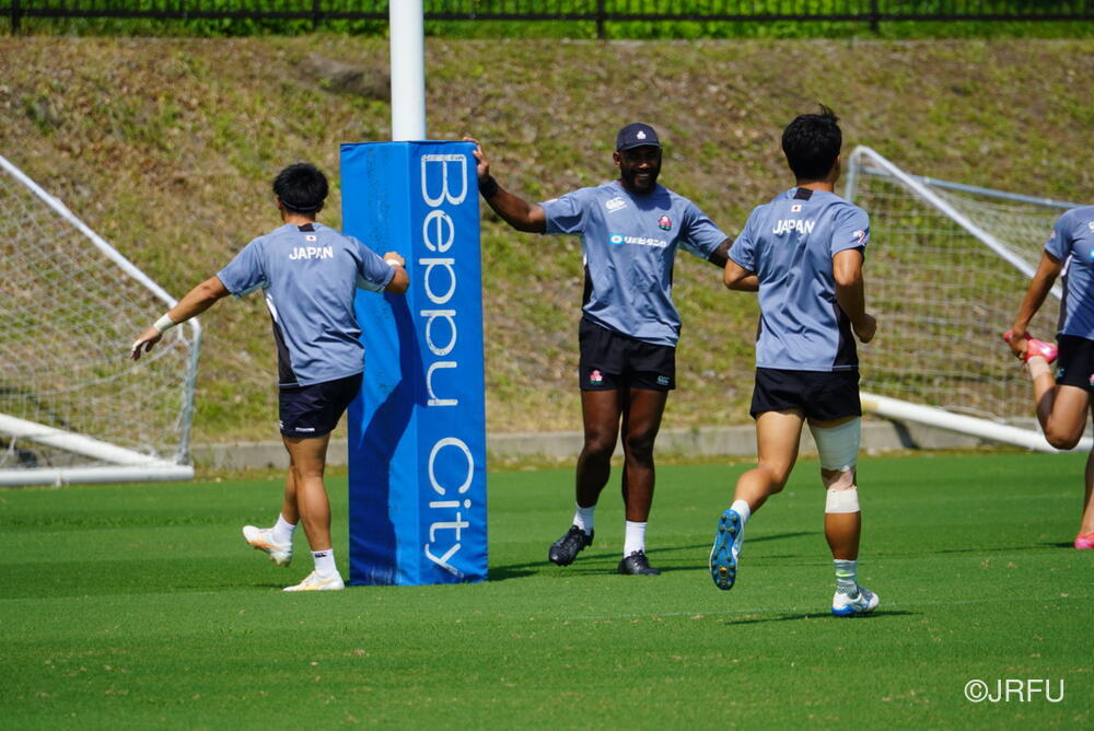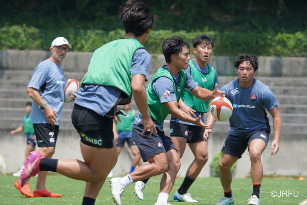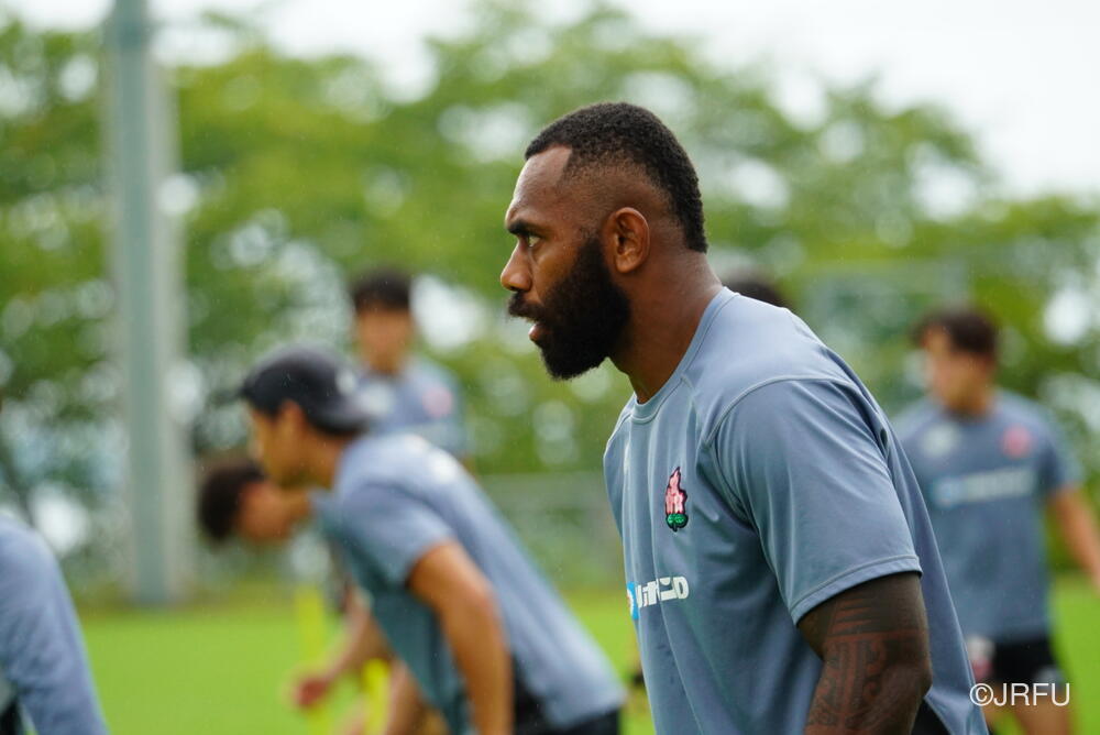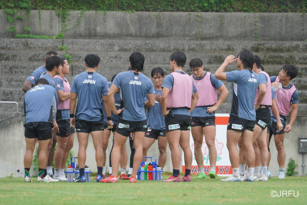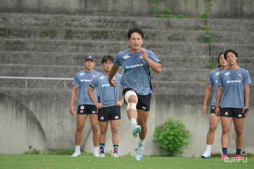 午前中はジムで下半身を中心にトレーニングを行い、その後のフィールドでは、時折雨の降る中でブレイクダウンやディフェンスの基礎に取り組みました。