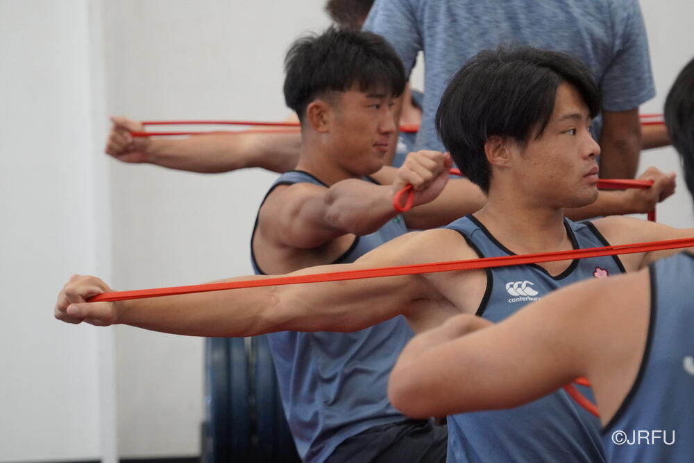 午前中はジムにて、それぞれの課題に応じた補強や可動域を広げるトレーニングからスタート。