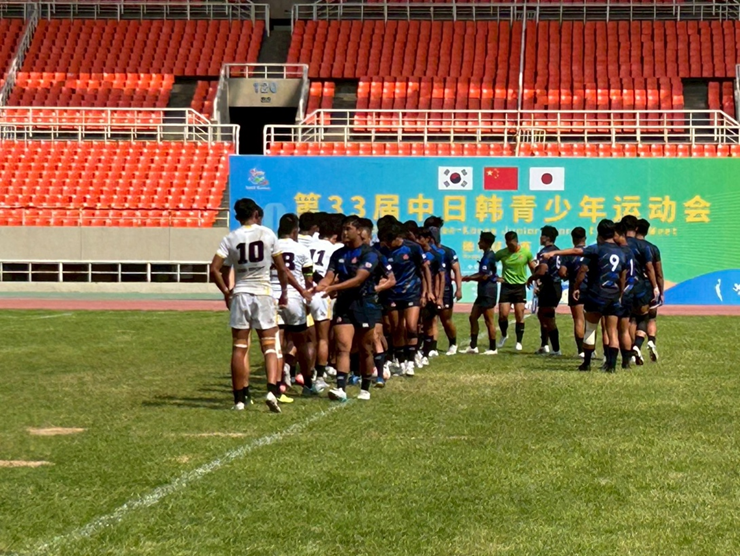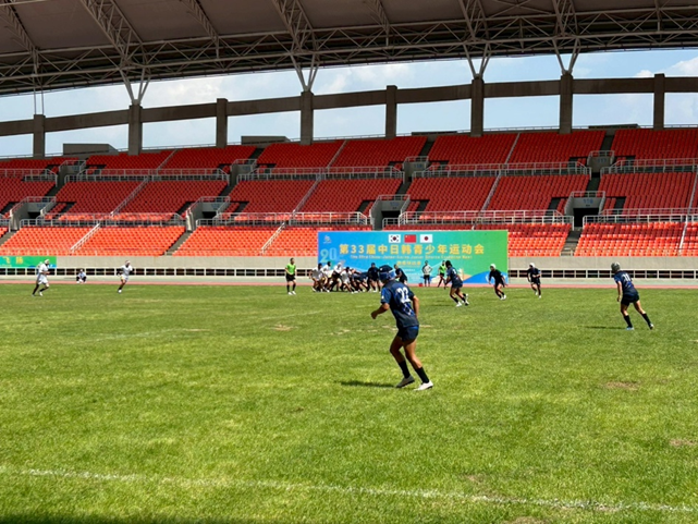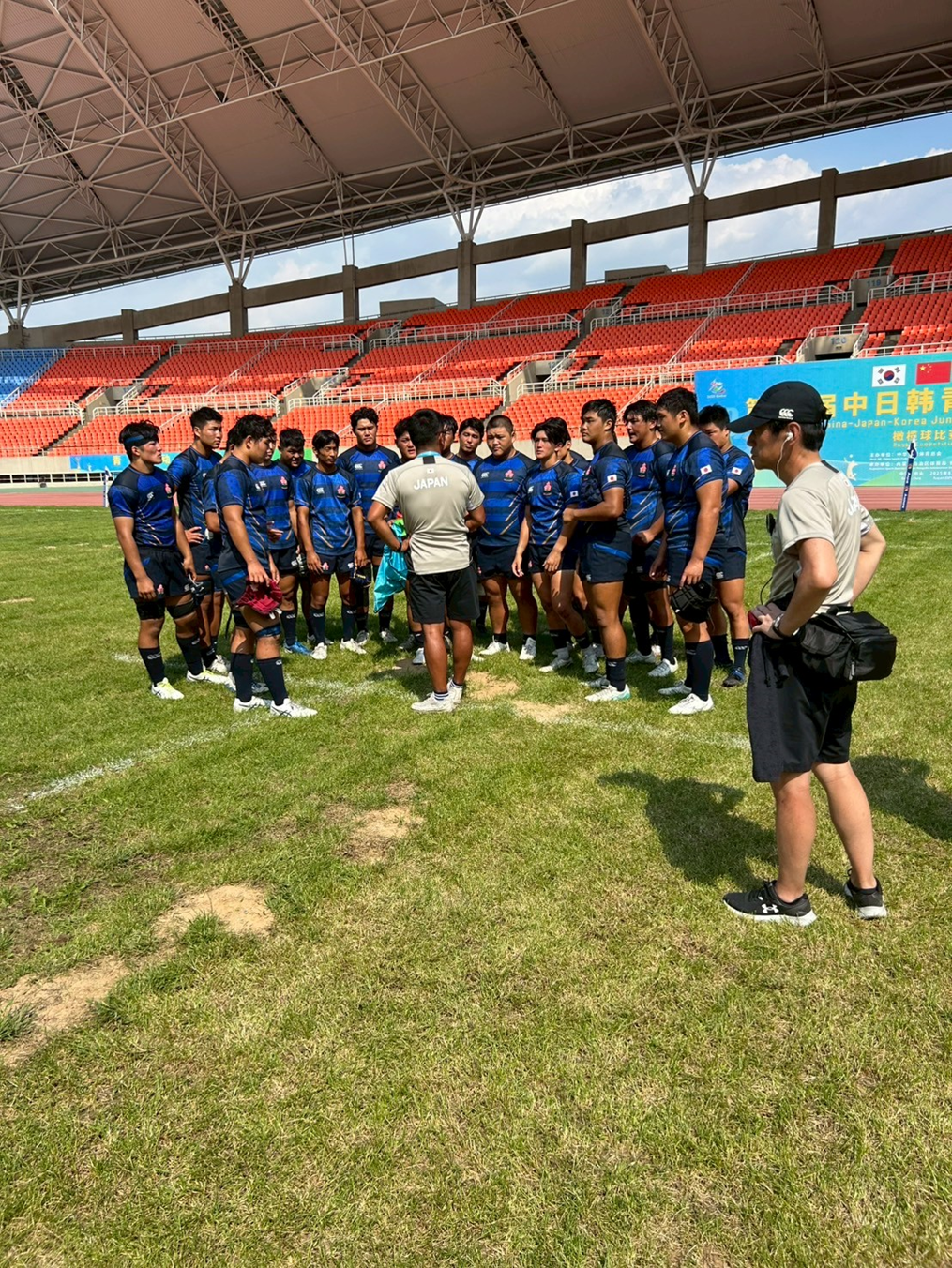 前半はチームが始まって初めてのフルコンタクト試合ということもあり、韓国代表の圧力にスコアをしなければならない場面でミスが続き、流れをつかめずに前半20分にトライを先に取られてしまう展開となりました。その後も、9分間こう着状態が続きましたが前半29分のL Oで出場した本田選手(佐賀工)のトライとS Oの川添選手(東福岡)のゴールキックも決まって前半を7対7の同点で折り返すことになりました。ハーフタイムでは大島監督から「JAPAN CYCLE」を丁寧に体現しようと声がかかりました。