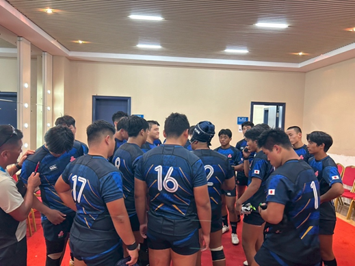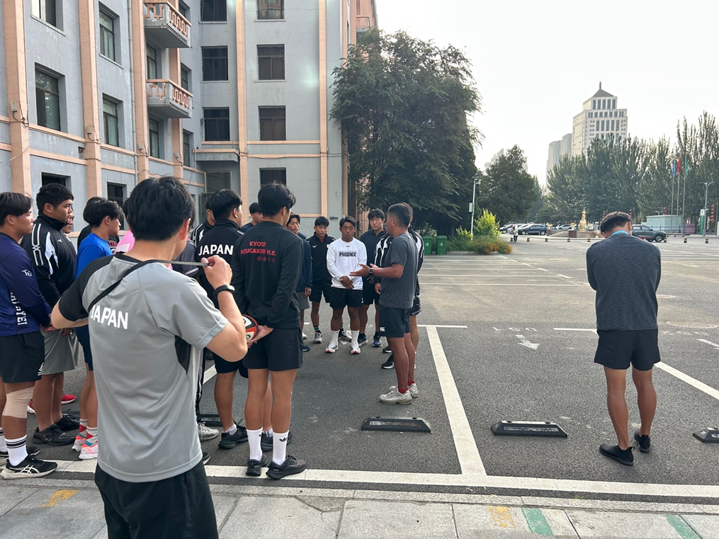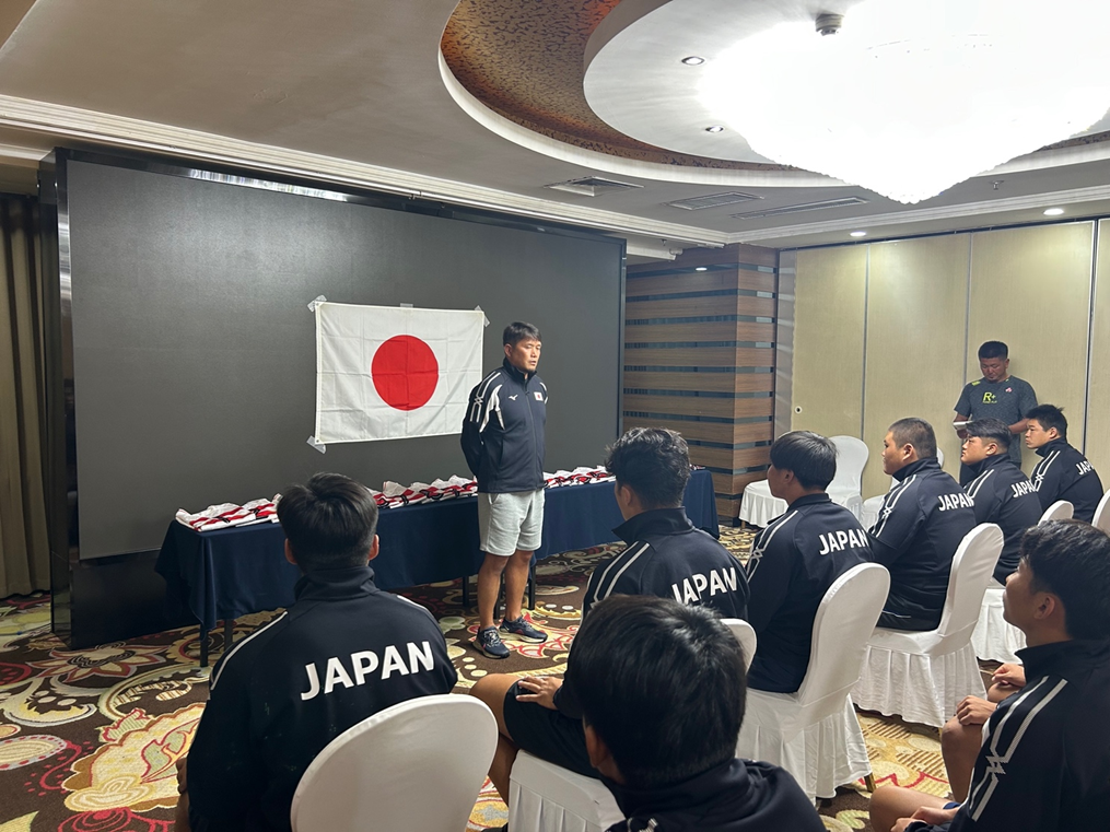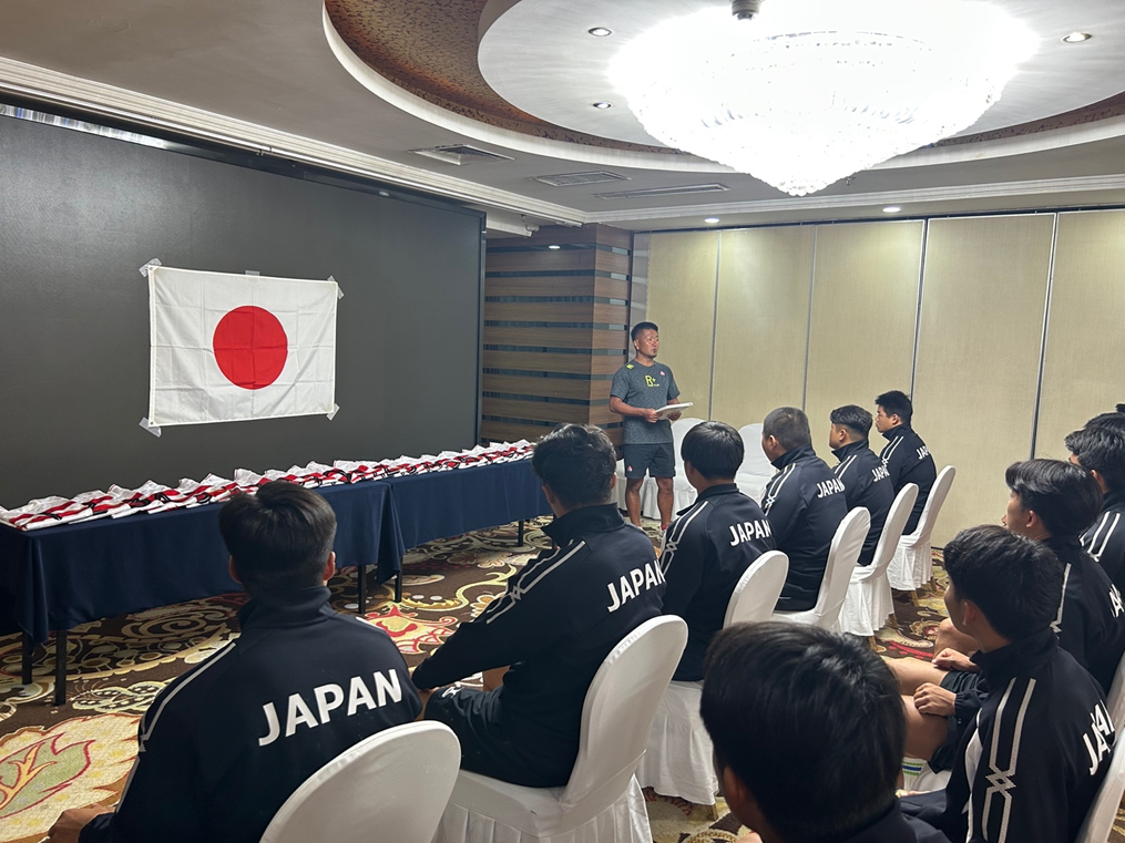 朝は6:30から昨日の長時間座った状態での移動で固まった筋肉、関節をほぐすMobilityを行いました。朝食の後、日本ラグビーの最初の日本代表カテゴリーに位置つけられるU17 J A P A Nにセレクトされた選手達へ、山口団長と大島監督から日本代表1stジャージーが授与されました。選手達の表情は昨日の移動疲れを感じさせない、一層引き締まった戦う男の顔になりました。