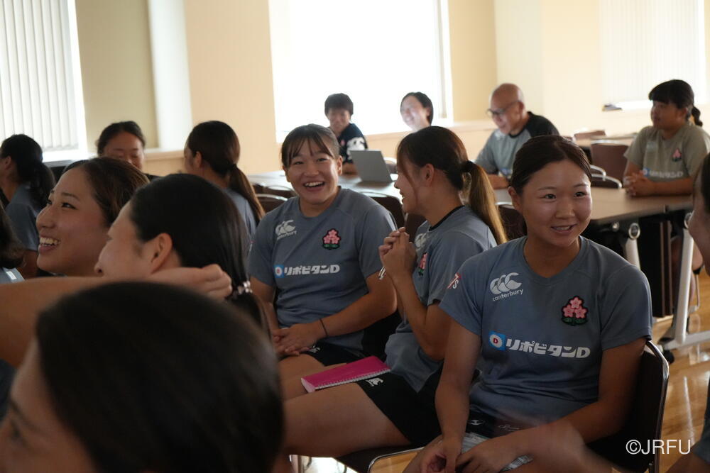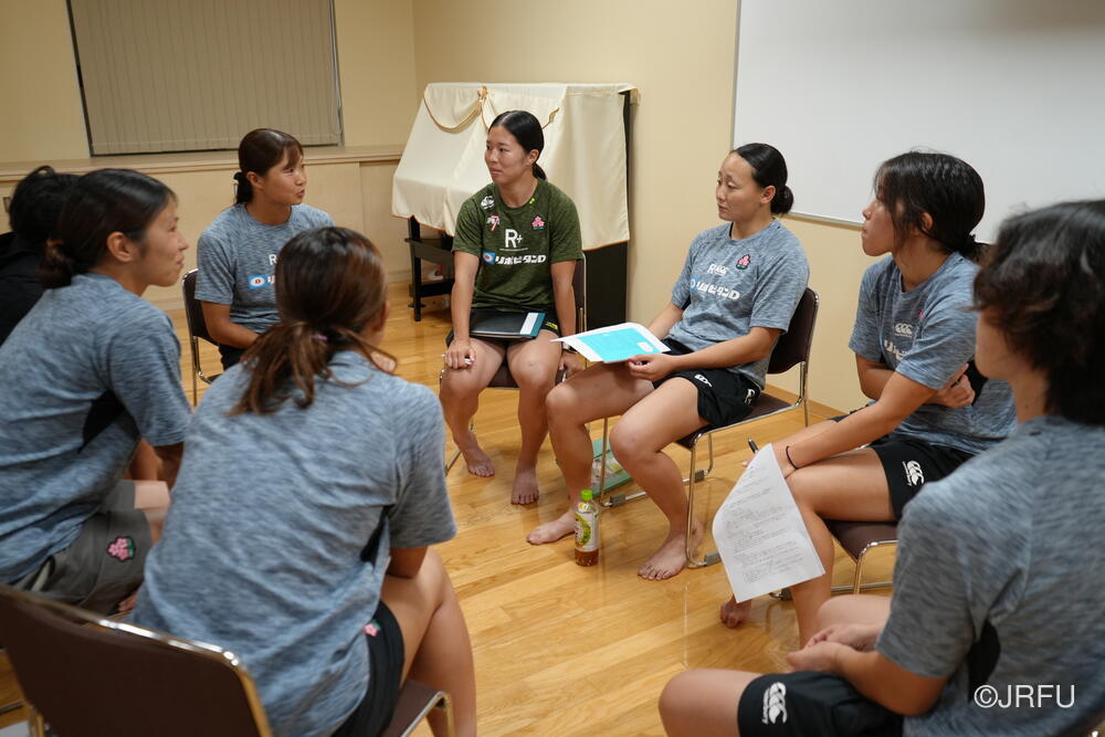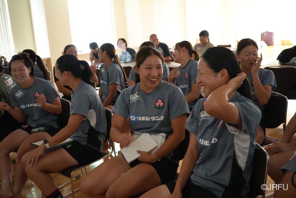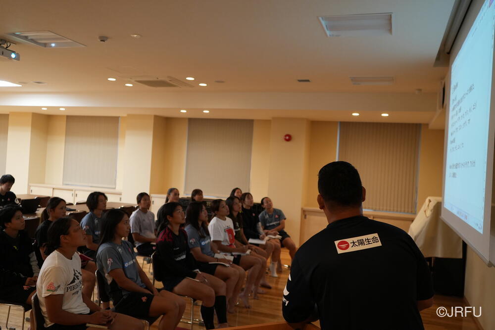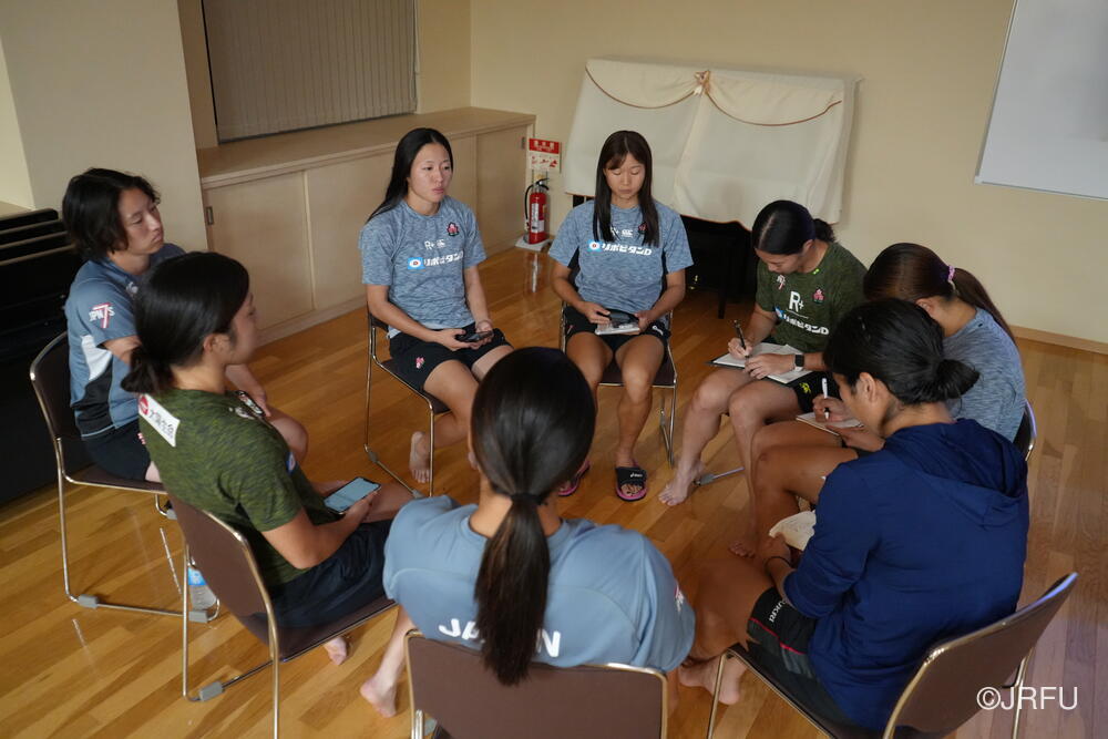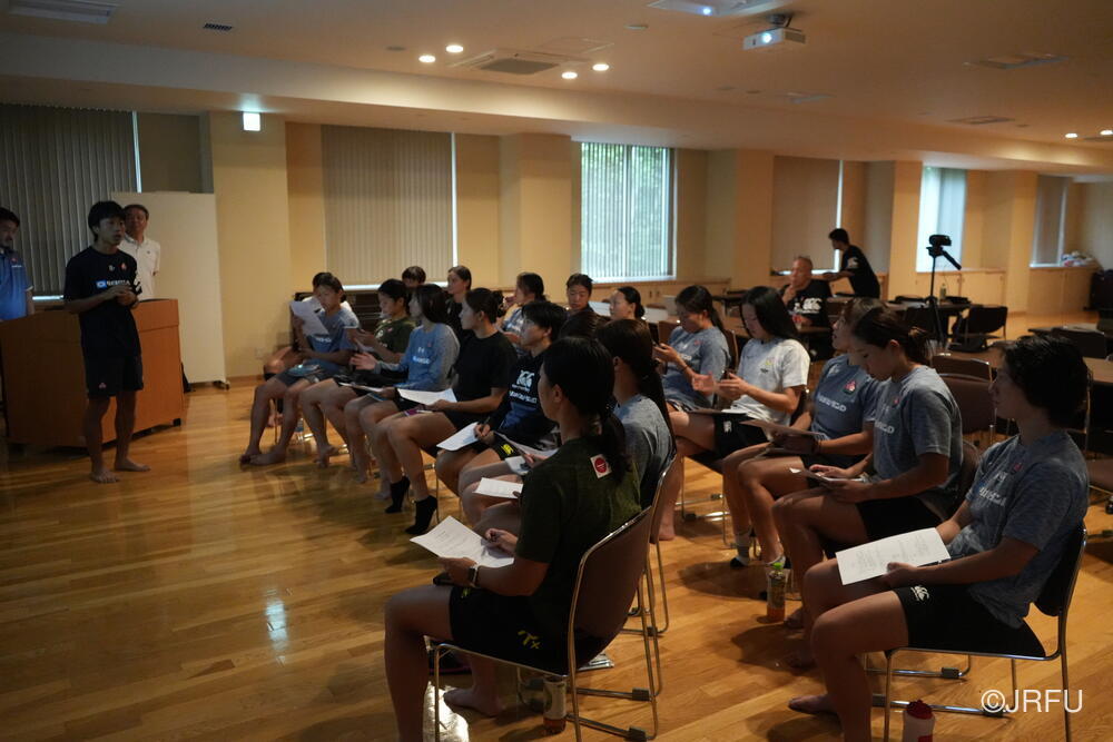 夕方、すっきりした表情で集合し、チームミーティングを行いました。本日合流された荻原コーチからFWについて、アナリストの中島さんからタックルについて、最後に兼松ヘッドコーチから合宿後半の目的とサクラセブンズの文化についてお話しがありました。