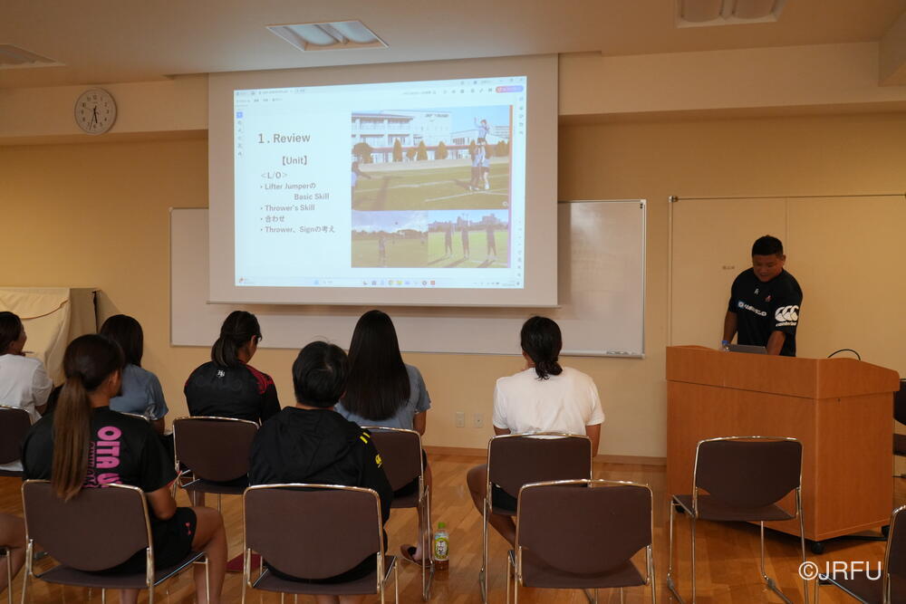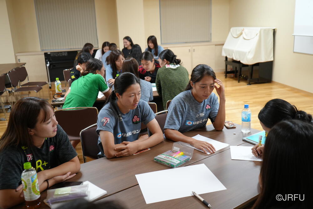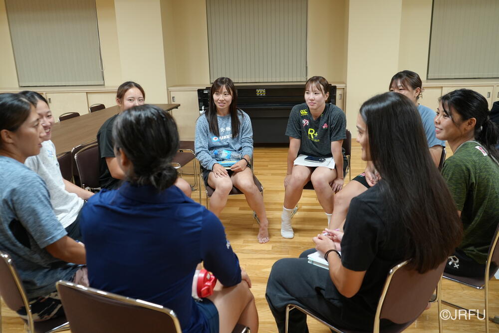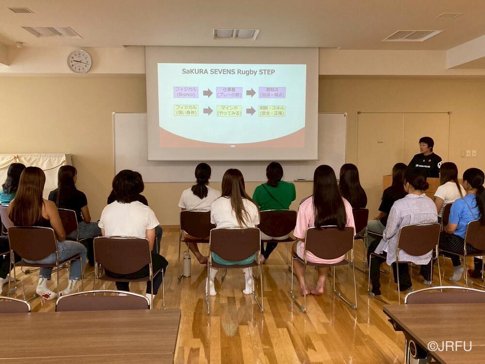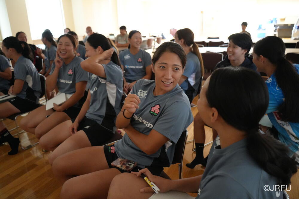 夕方、すっきりした表情で集合し、チームミーティングを行いました。本日合流された荻原コーチからFWについて、アナリストの中島さんからタックルについて、最後に兼松ヘッドコーチから合宿後半の目的とサクラセブンズの文化についてお話しがありました。