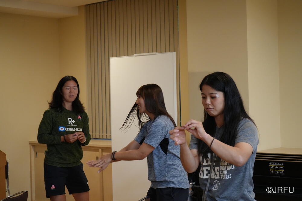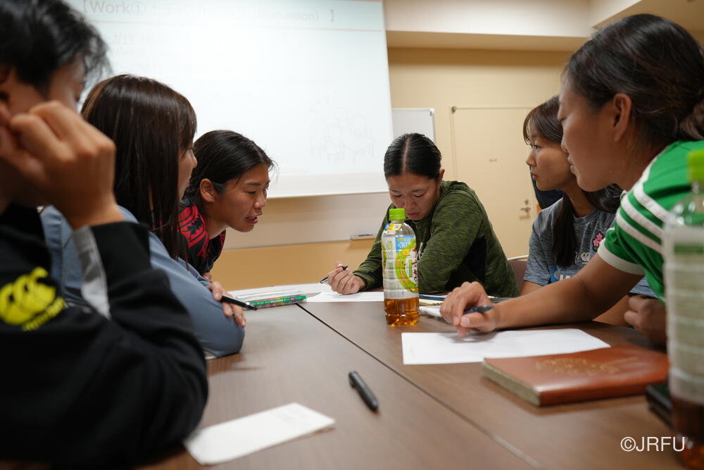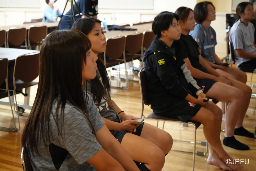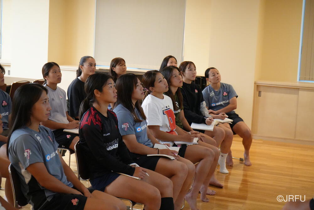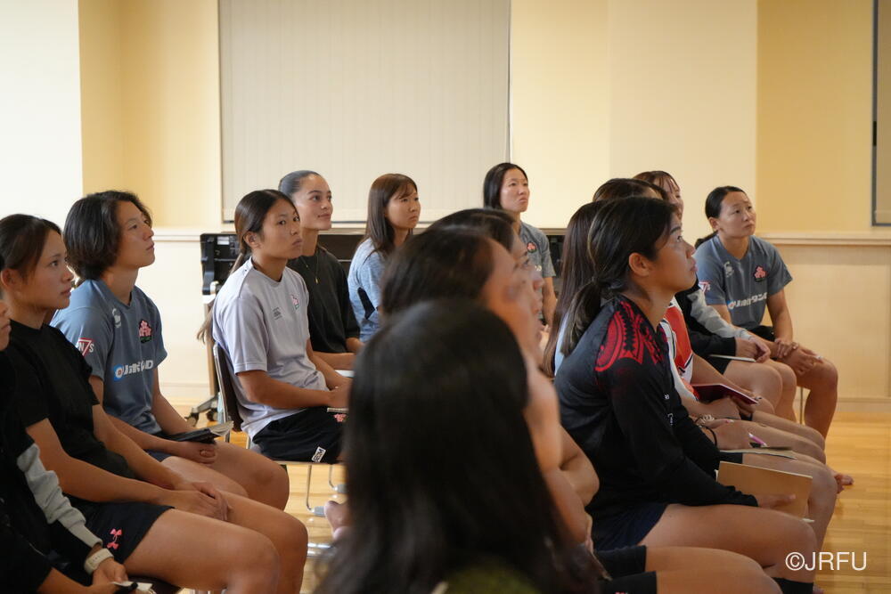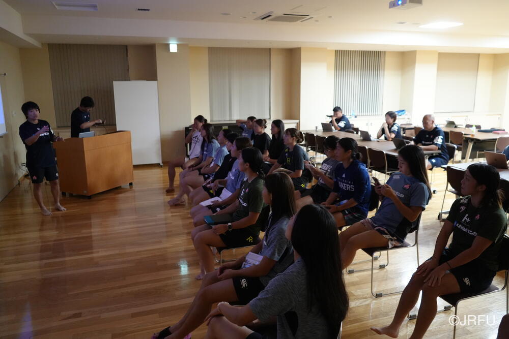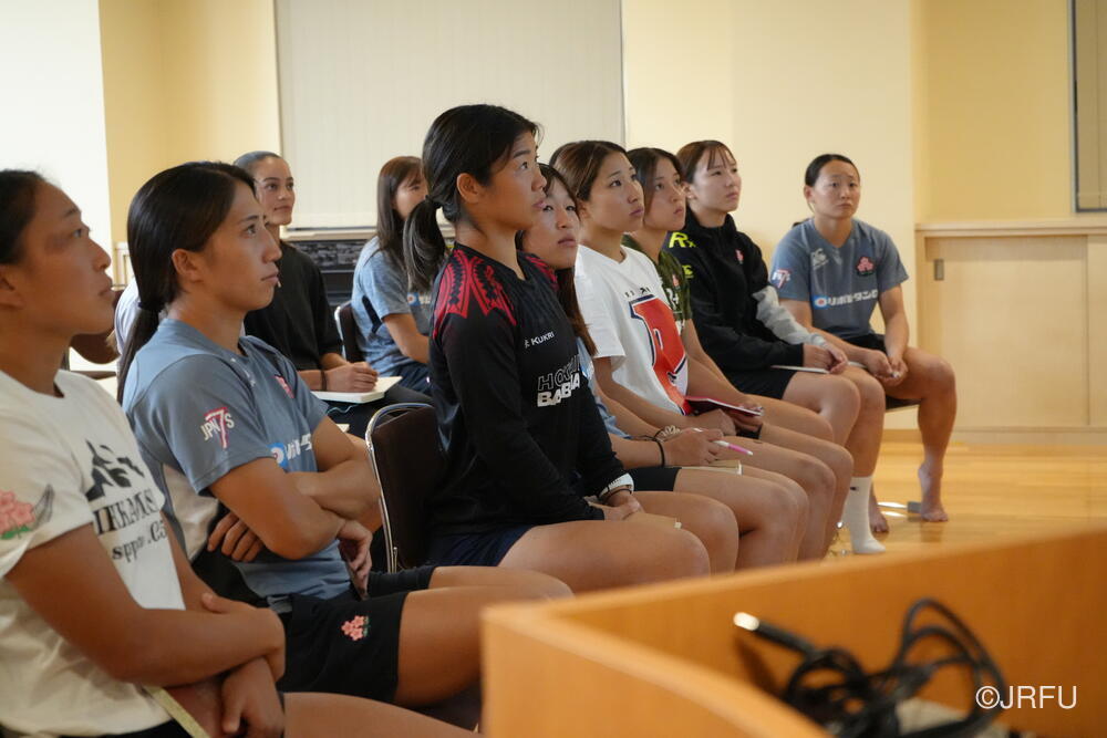 そして、昨シーズンの振り返りと今シーズンの取り組みについて確認しました。太陽生命ウィメンズセブンズシリーズ4大会を終え、久しぶりの招集や長いリハビリ期間を経て復帰した選手もいます。緊張感のある中、兼松ヘッドコーチの話にうなずきながら耳を傾けていました。