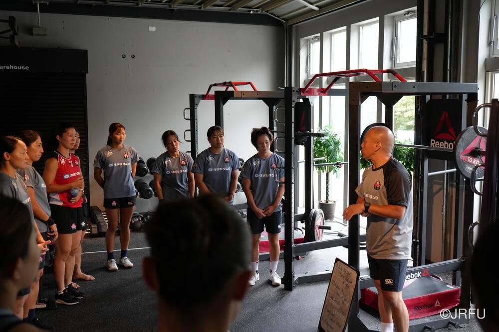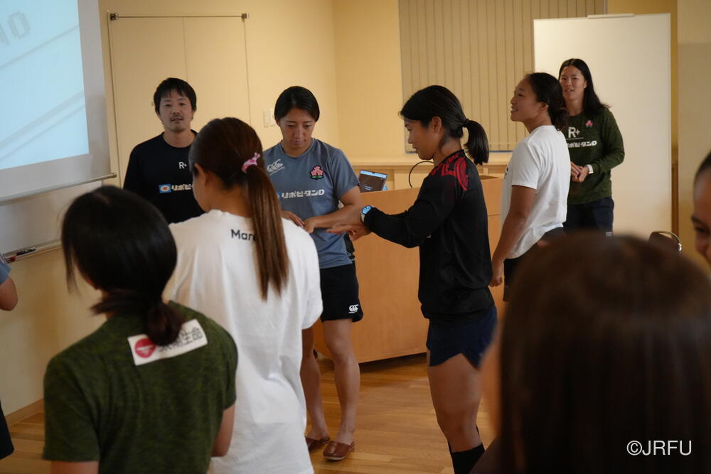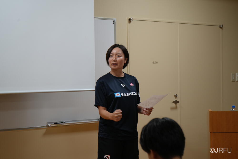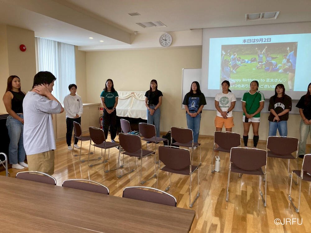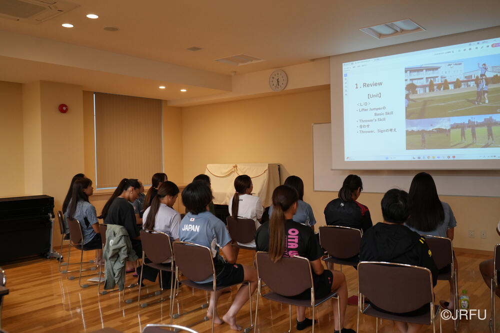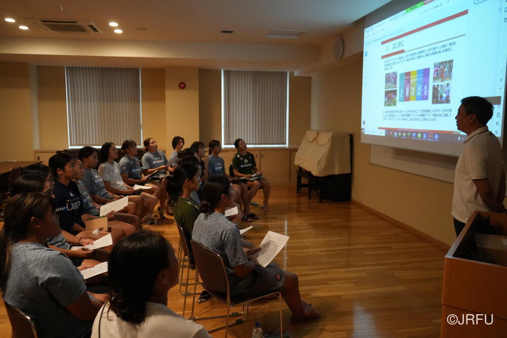 そして、昨シーズンの振り返りと今シーズンの取り組みについて確認しました。太陽生命ウィメンズセブンズシリーズ4大会を終え、久しぶりの招集や長いリハビリ期間を経て復帰した選手もいます。緊張感のある中、兼松ヘッドコーチの話にうなずきながら耳を傾けていました。