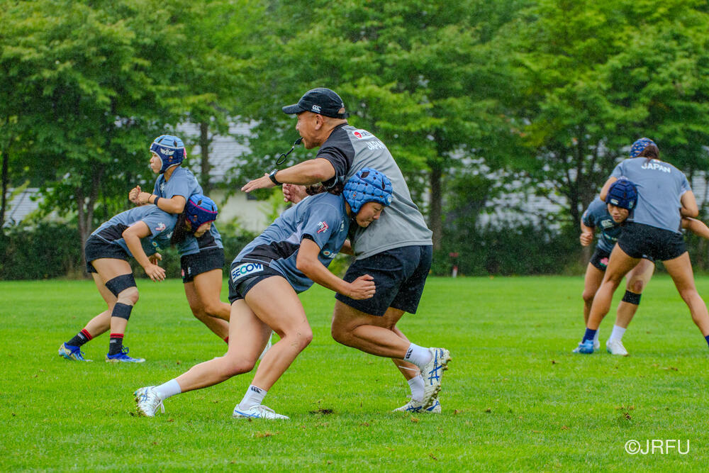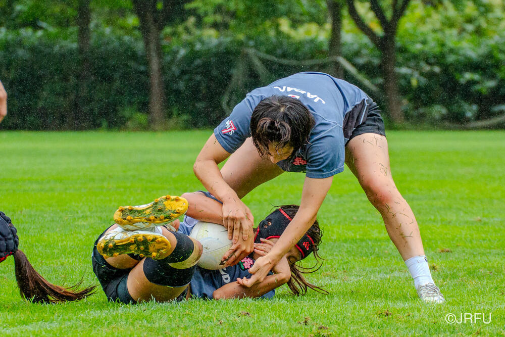 午後になると雨が大降りになりました。FWセッションから始まり、ディフェンスの確認、ロータックル、スティール、カウンターラックを細かい動作にもこだわって一つ一つ集中して取り組みました。最後にセットプレーから7対7を行いました。