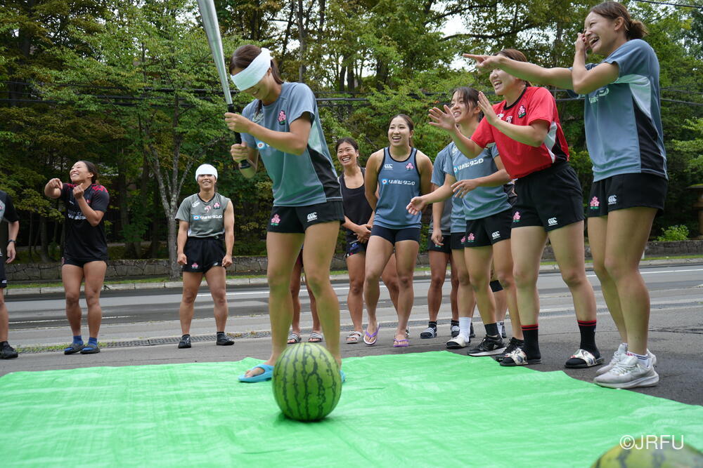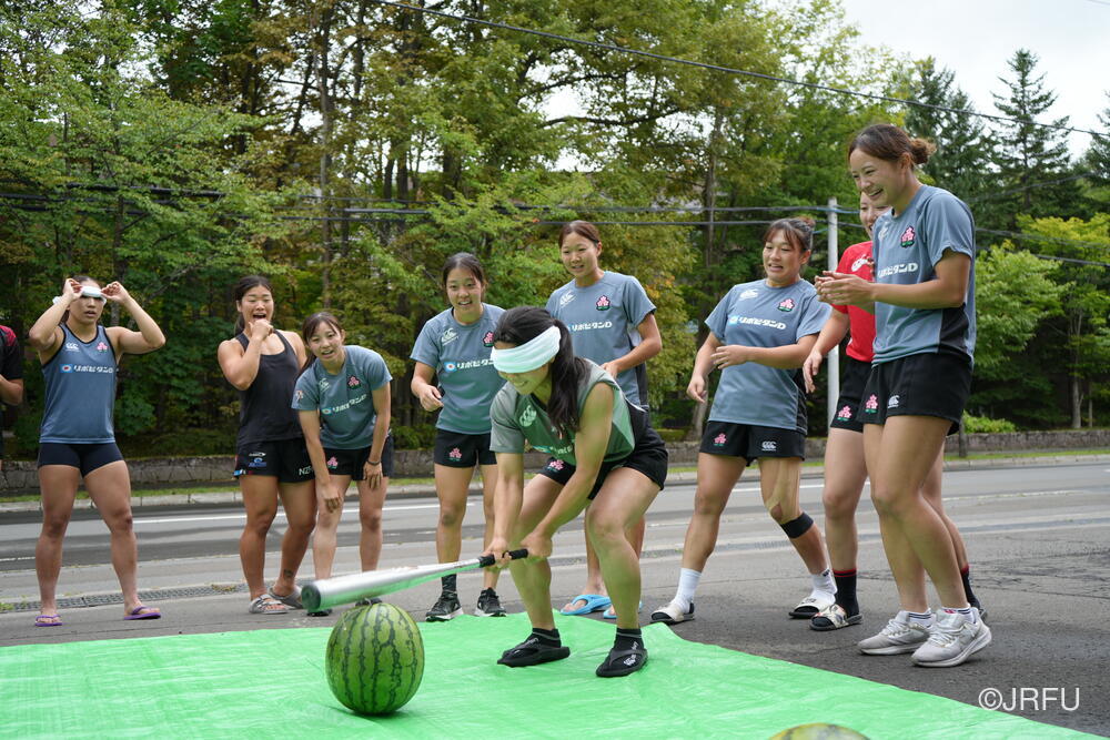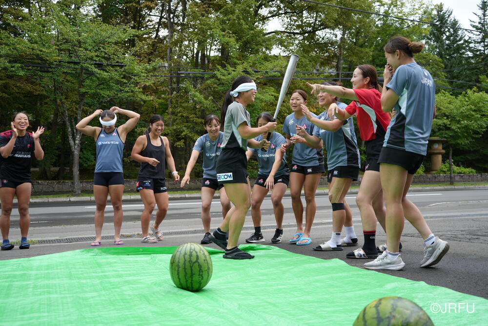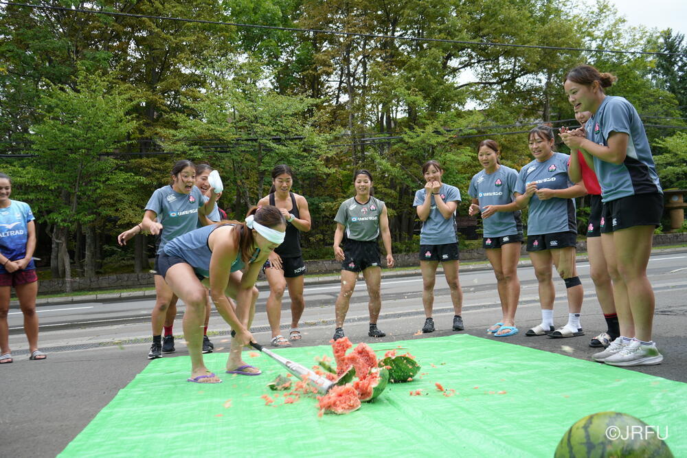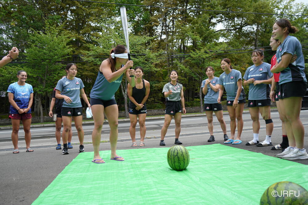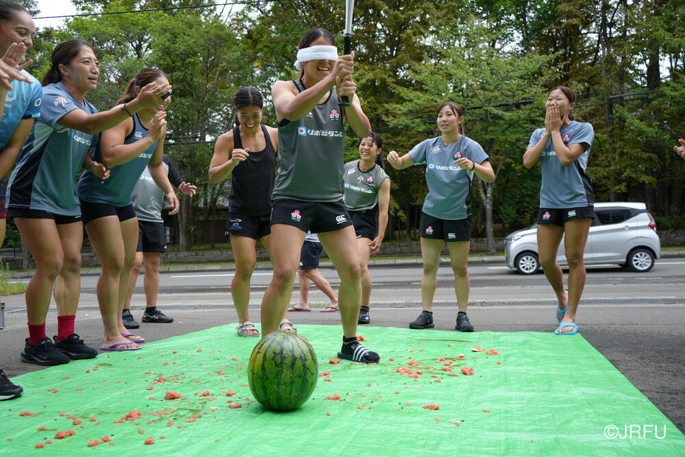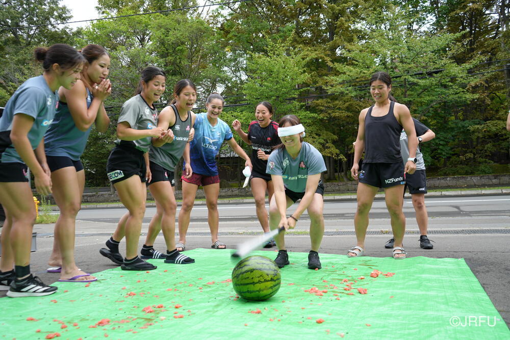 ジムセッションが終わる頃には晴れてきたので、北海道バーバリアンズ様から差し入れでいただいた大きなスイカ2玉を使って、チーム対抗戦のスイカ割りをしました。目隠しした状態で、仲間の声を聞き分けて、スイカに触れずにスイカの位置を探します。2玉を見事に割り、みんなで美味しくいただきました。疲れた身体にスイカの甘さがしみ、あっという間に完食しました!