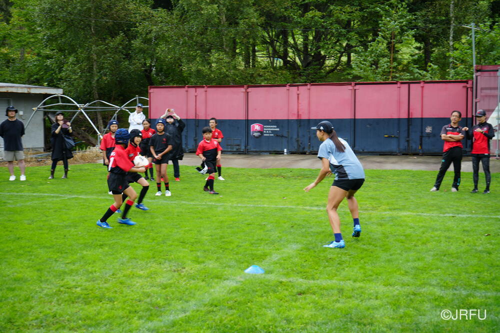 午前中はキャッチ、パス、キックを中心に行い、6対3でそれらを活かしました。最後に全員がそれぞれ3ヶ所の位置からドロップゴールを決めて終了しました。