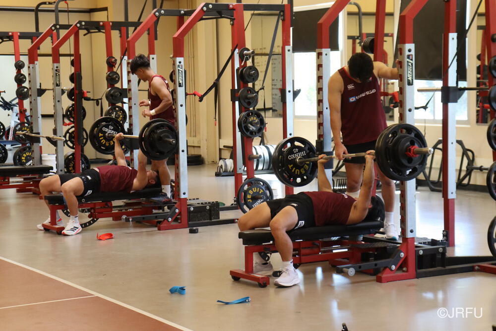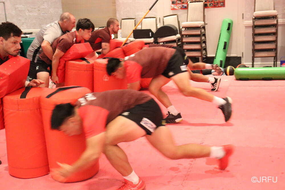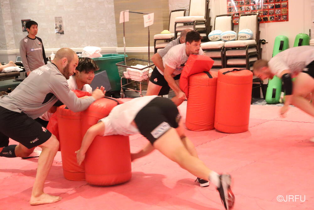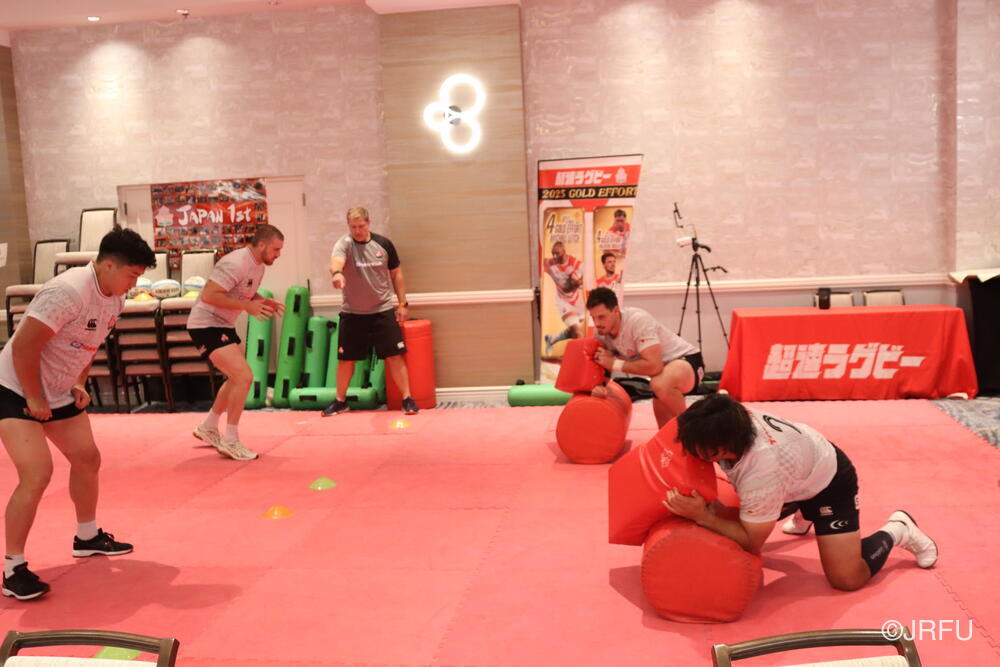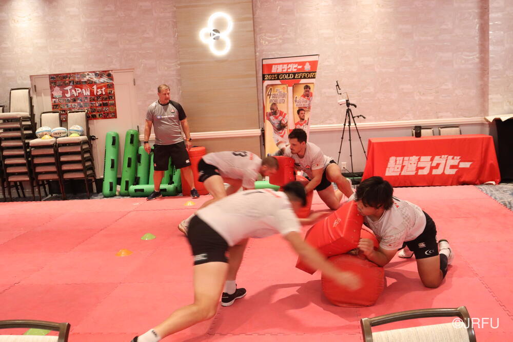 写真ではフォワードだけですが、バックスでも同様のトレーニングを別の部屋で行なっています。