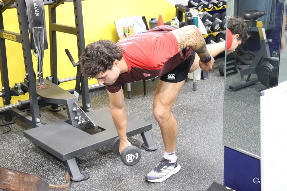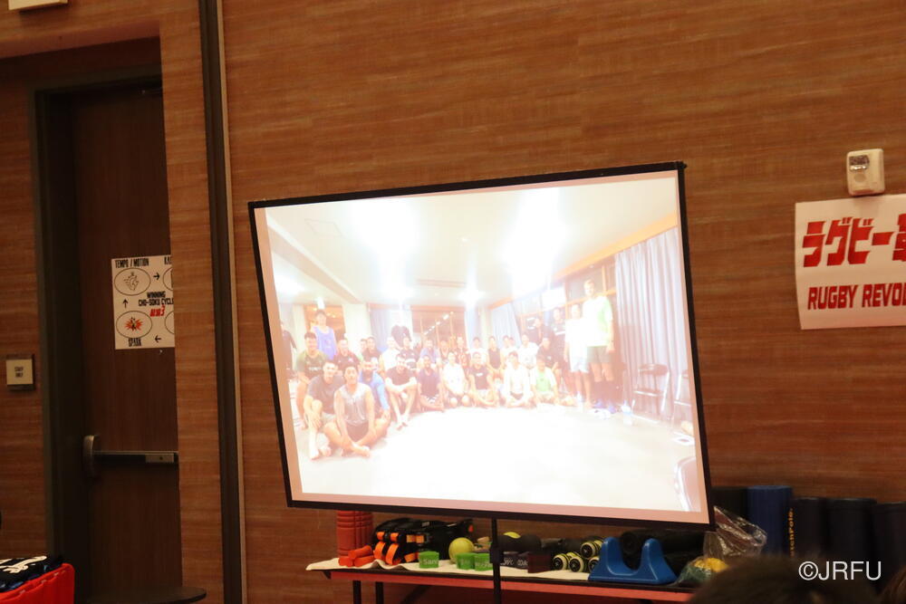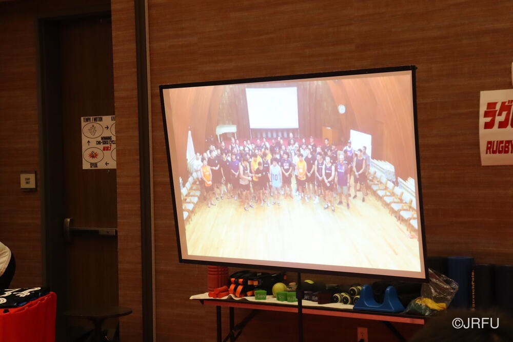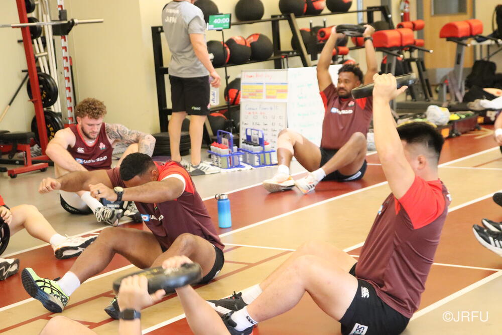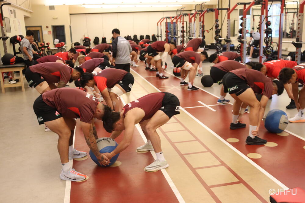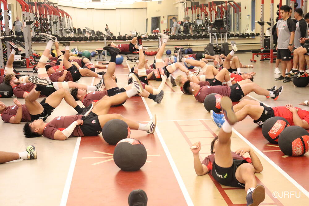 写真ではフォワードだけですが、バックスでも同様のトレーニングを別の部屋で行なっています。