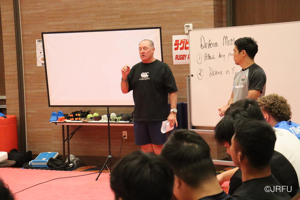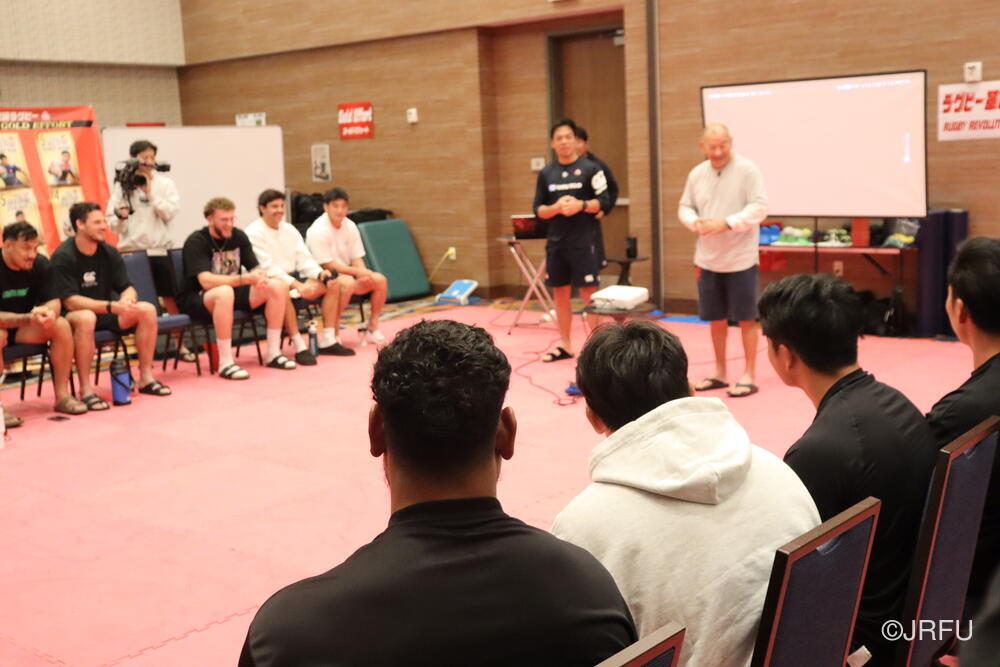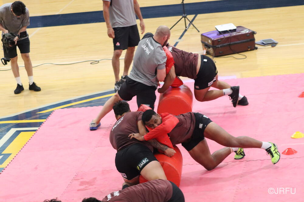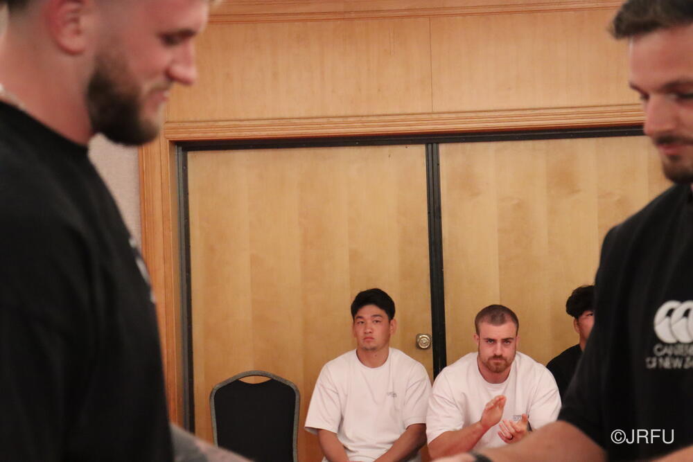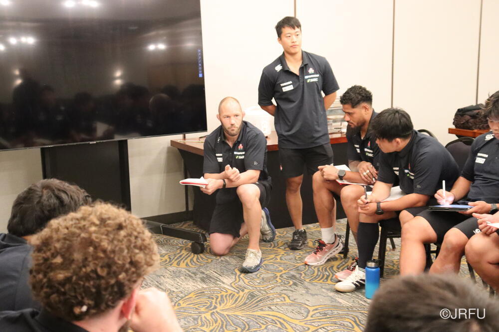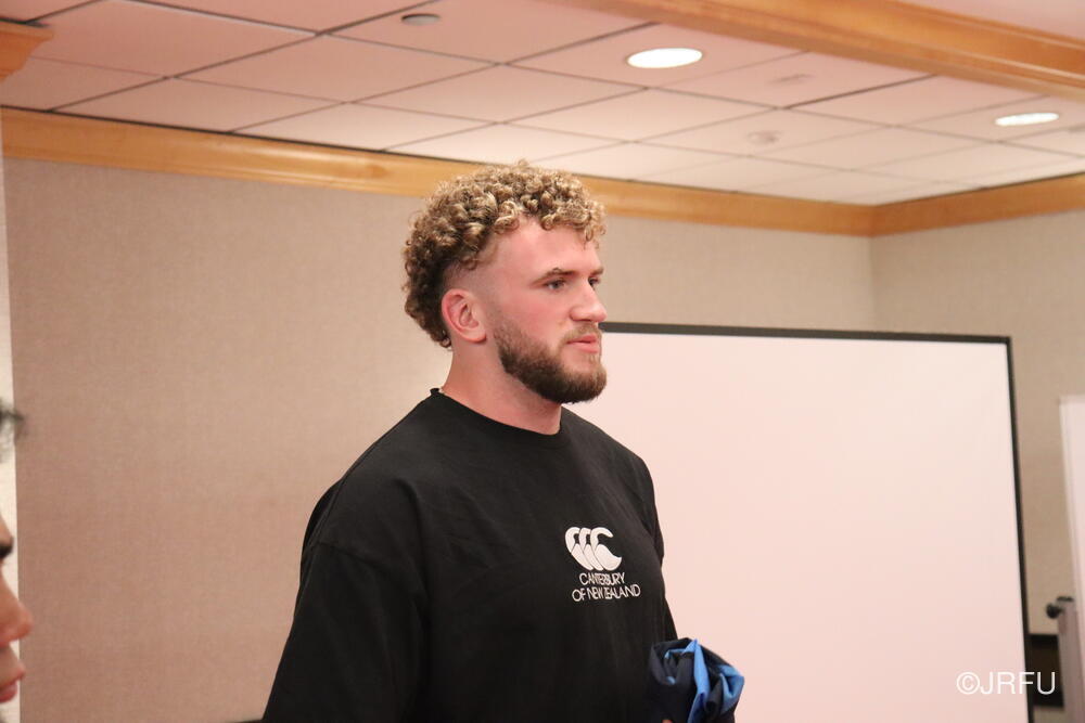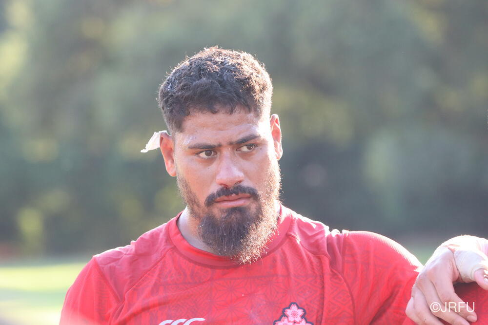 「ガンターは昨日の練習で頭を打ってしまってHIA(脳震盪の疑い)という風に診断されてしまったので、代わりにファウルアが先発に入ることになりました。彼はフィニッシャーで入ってきて、感心するプレーを見せてくれています。なので、ガンターの欠場を埋めるという意味では全く遜色ないと思っています。ガンターに関してはPNCで非常にいい活躍をしていて、インターナショナルキャリアを積み上げていたところだと思います。石田に関しては、膝を怪我して、百パーセントでプレーできないということなので、木田が代わりに入りました。新しい選手ですけれどもアグレッシブさがあって、フィジーに対しては欠かせない部分なので、このようなセクションになってます。中楠は、非常に良い練習を積み重ねていて、ラグビーに対するアグレッシブなアプローチを持ち始めています。彼はスキルは以前から持っていましたが、テストマッチで活躍するにはスキルだけではなくて、こうしたアグレッシブさが必要で、それが備わってきました。また、残念ながらサム・グリーンがトンガ戦で、ハムストリングを怪我してしまったということもあるので、このような選出になりました。」