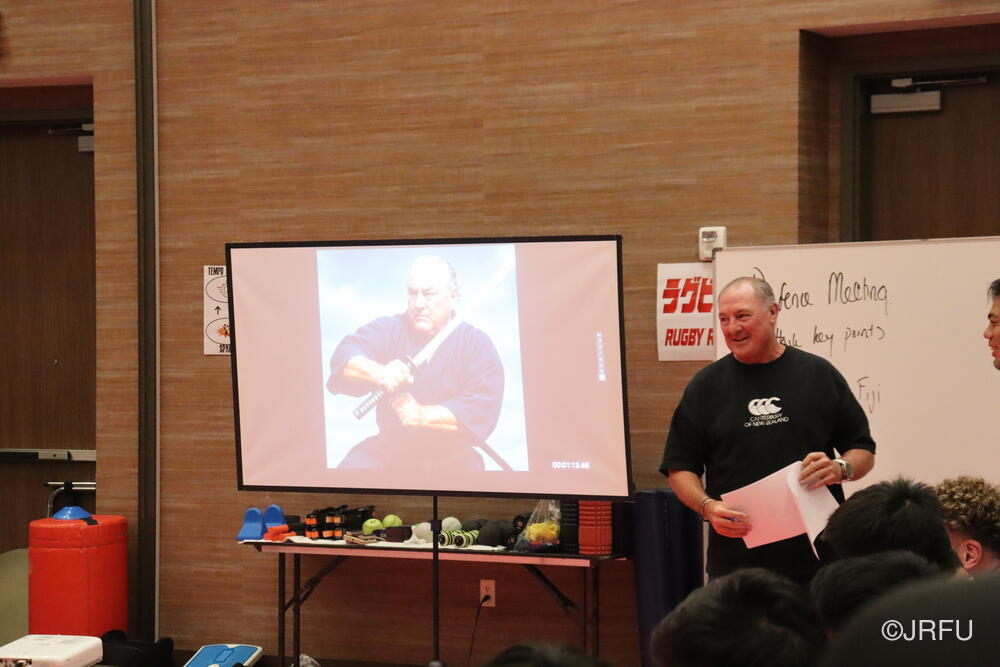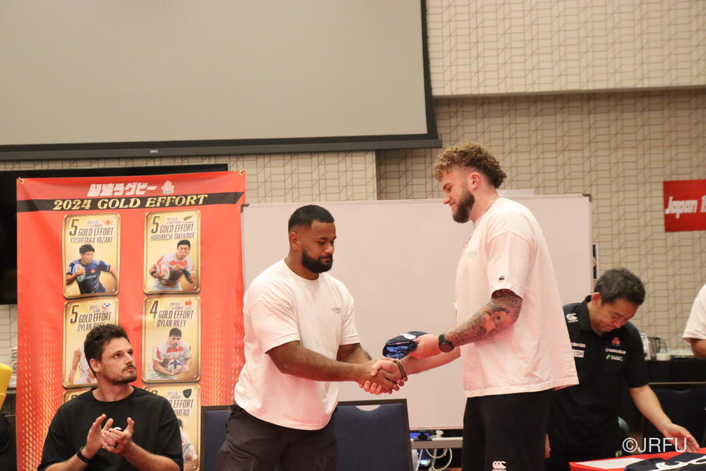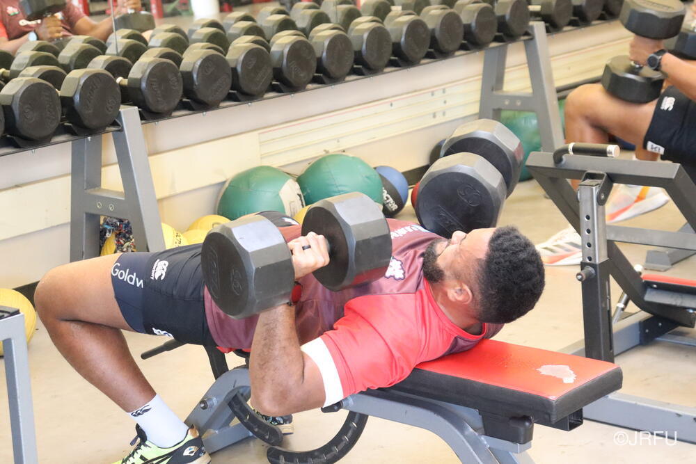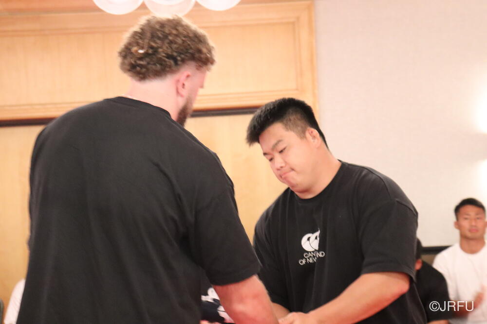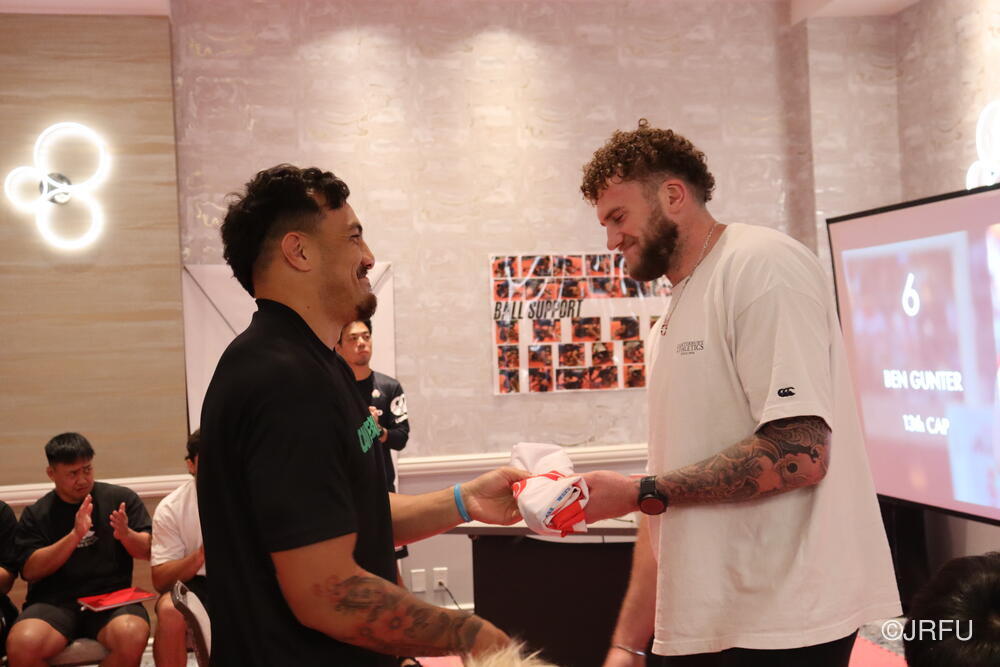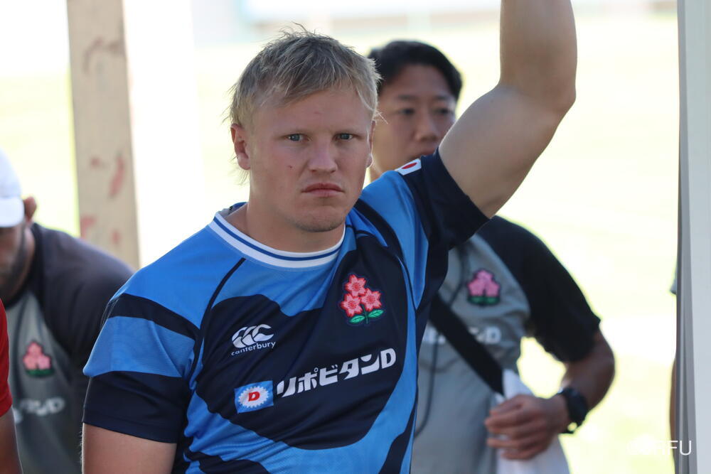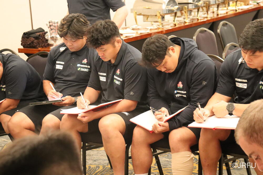 「ガンターは昨日の練習で頭を打ってしまってHIA(脳震盪の疑い)という風に診断されてしまったので、代わりにファウルアが先発に入ることになりました。彼はフィニッシャーで入ってきて、感心するプレーを見せてくれています。なので、ガンターの欠場を埋めるという意味では全く遜色ないと思っています。ガンターに関してはPNCで非常にいい活躍をしていて、インターナショナルキャリアを積み上げていたところだと思います。石田に関しては、膝を怪我して、百パーセントでプレーできないということなので、木田が代わりに入りました。新しい選手ですけれどもアグレッシブさがあって、フィジーに対しては欠かせない部分なので、このようなセクションになってます。中楠は、非常に良い練習を積み重ねていて、ラグビーに対するアグレッシブなアプローチを持ち始めています。彼はスキルは以前から持っていましたが、テストマッチで活躍するにはスキルだけではなくて、こうしたアグレッシブさが必要で、それが備わってきました。また、残念ながらサム・グリーンがトンガ戦で、ハムストリングを怪我してしまったということもあるので、このような選出になりました。」