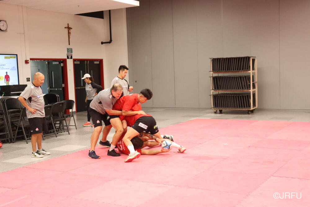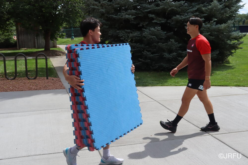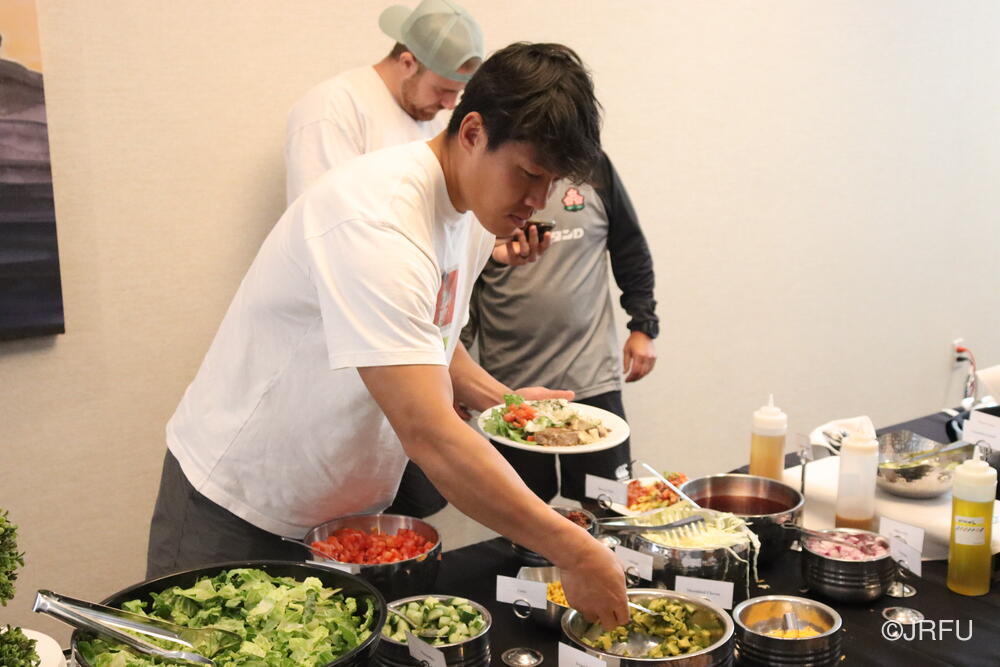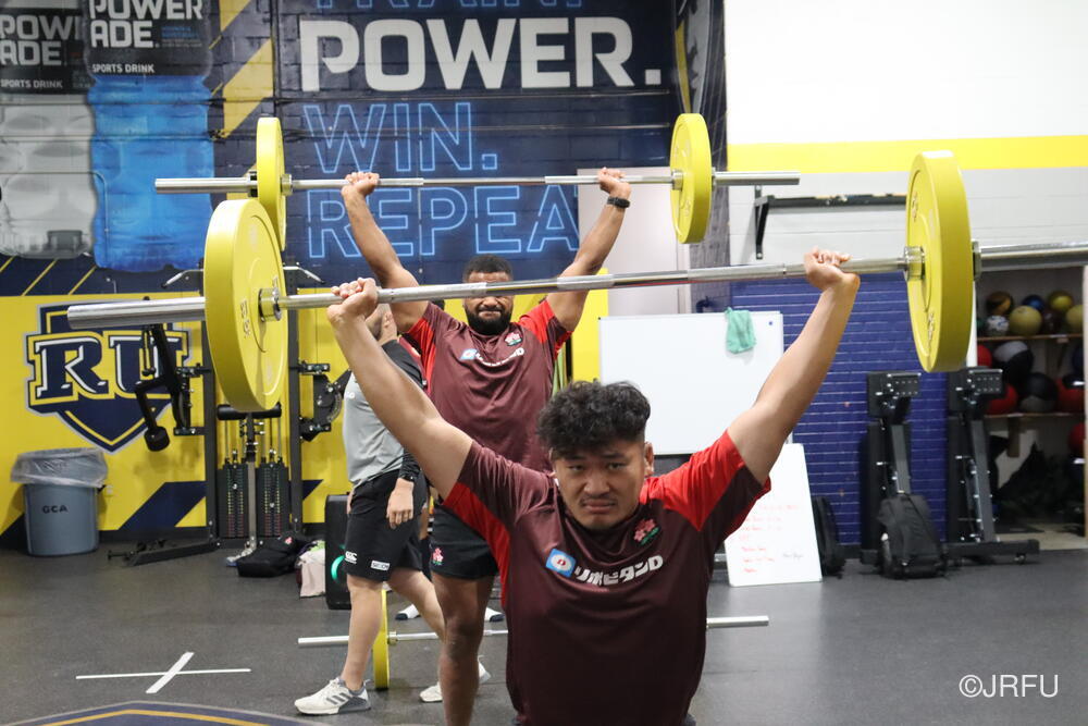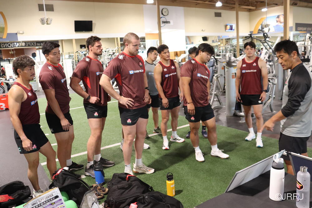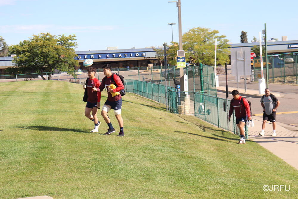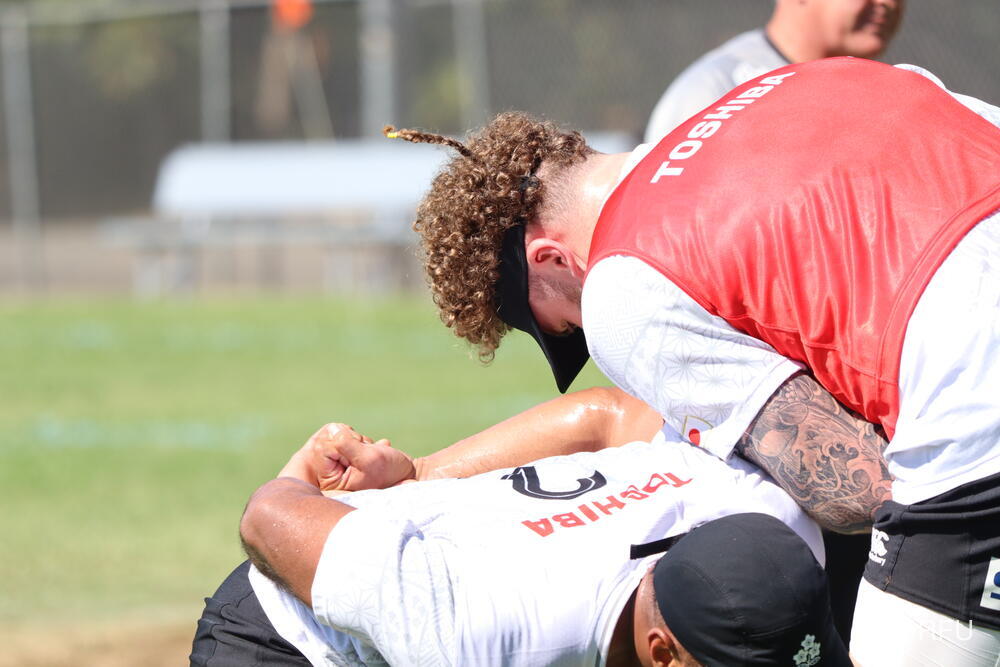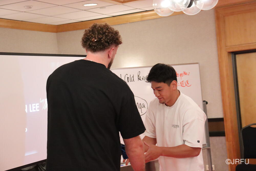 原田選手「メンバー外でもできることはいろいろあって、フロントローのメンバーやゲームリーダーと話したり、準備のところでフッカーの速さについて話したり、といった会話などをしています。アメリカに来て環境も変わりいつものことができない状態で、オンザフィールドだけではなく、オフザフィールドで整理整頓したりだとか、時間を守ったりとか、みんなに共有するようにしています」
