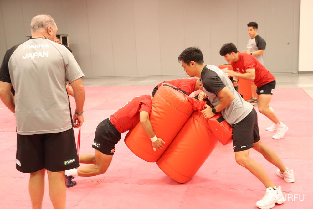 フォワードはやはりスクラム。毎日欠かせない練習の一つです。前の試合ではスクラムで何度かペナルティをとるなど終始優勢でしたが、オーウェンコーチからは、前回のスクラムは40%以上改善の余地がある、とアドバイスがあったということです。