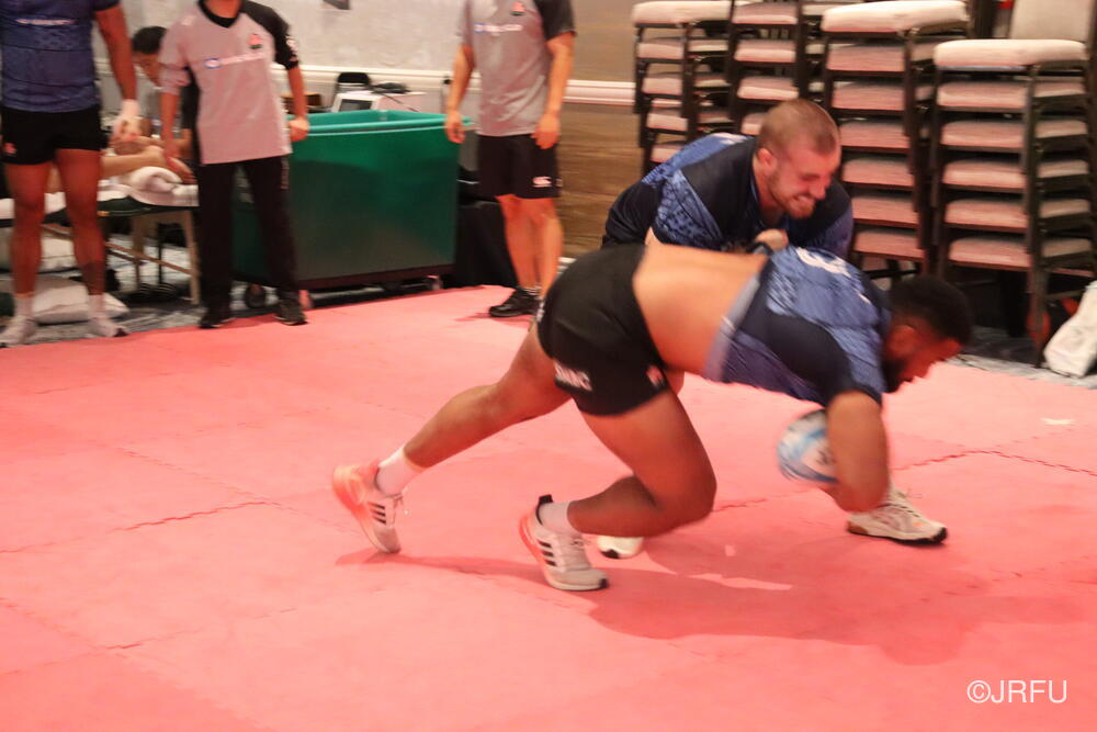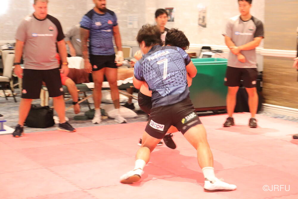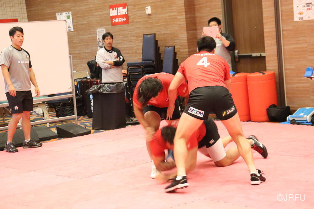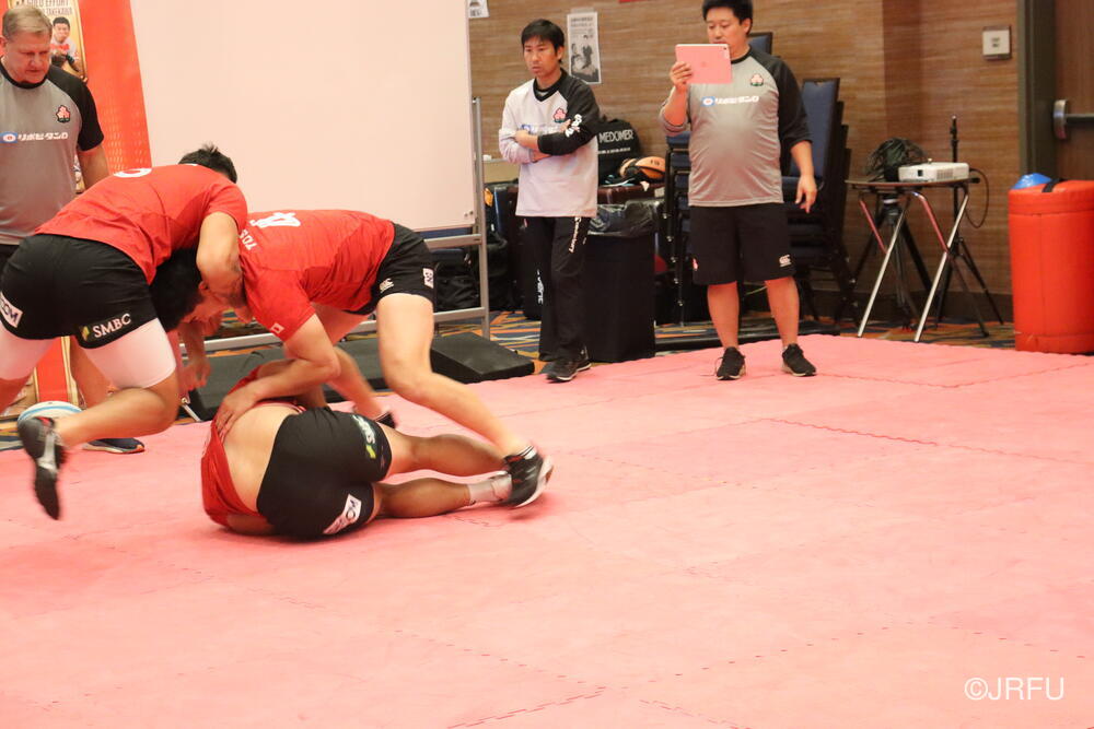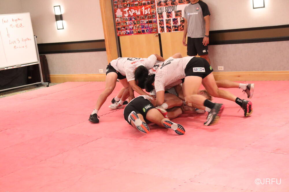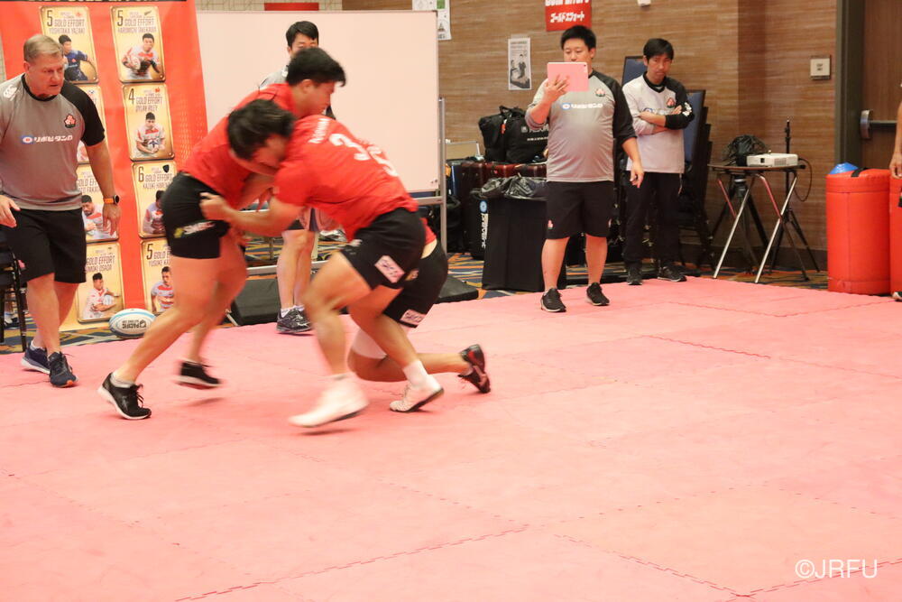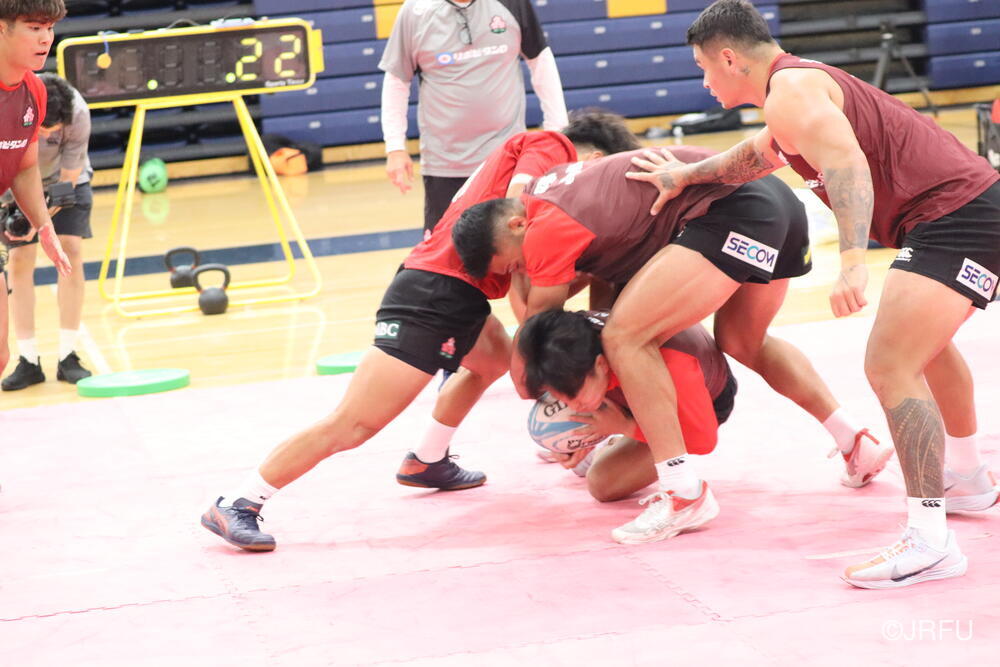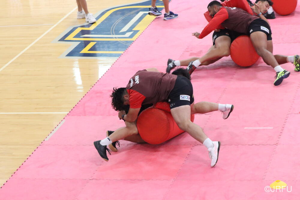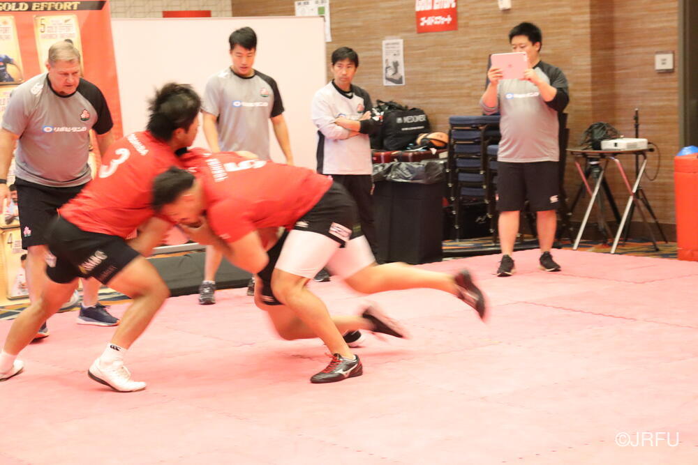 グラウンドでの練習の後も、トレーニングは続きます。こちらは今シーズン一貫して最重要強化項目となっているブレークダウンの練習です。