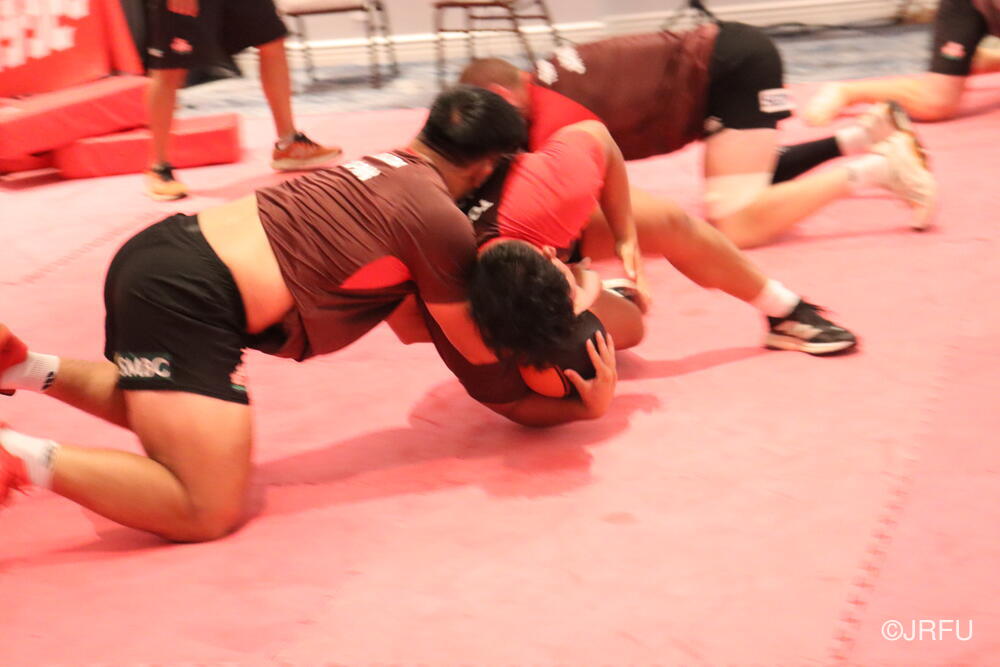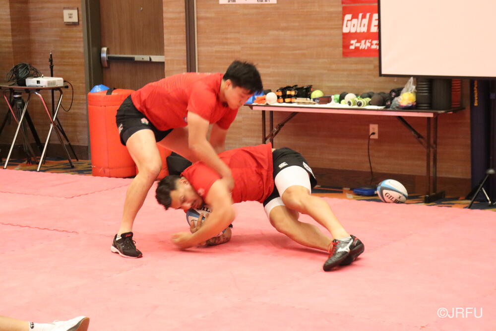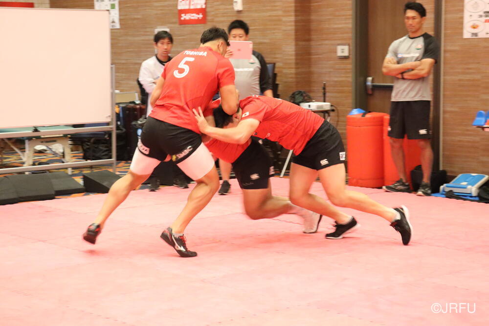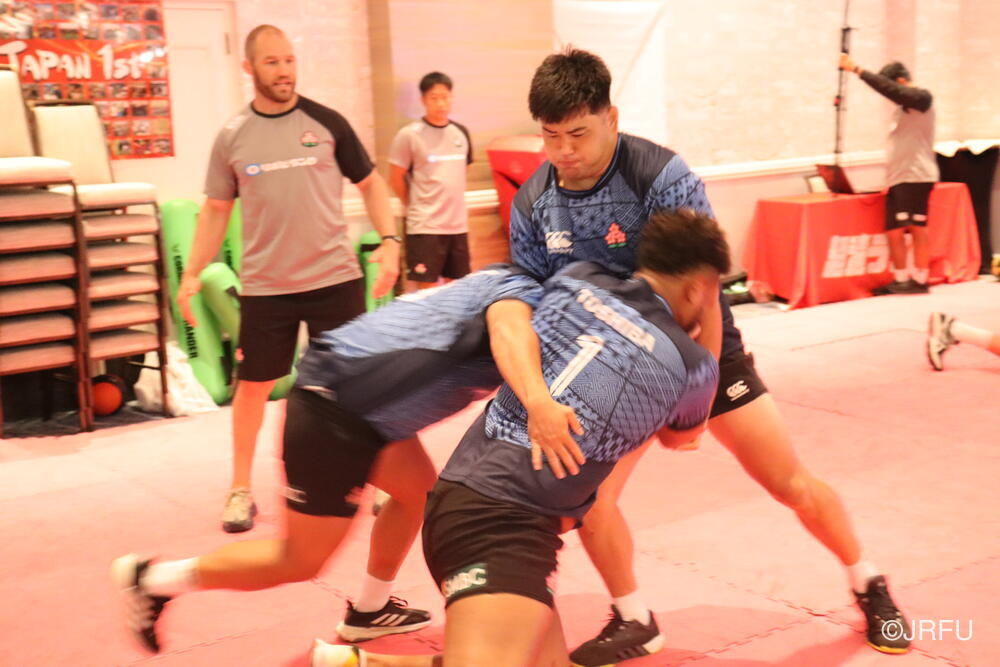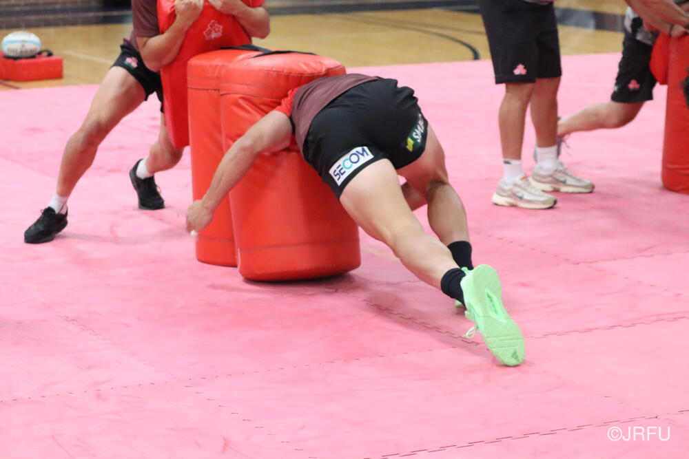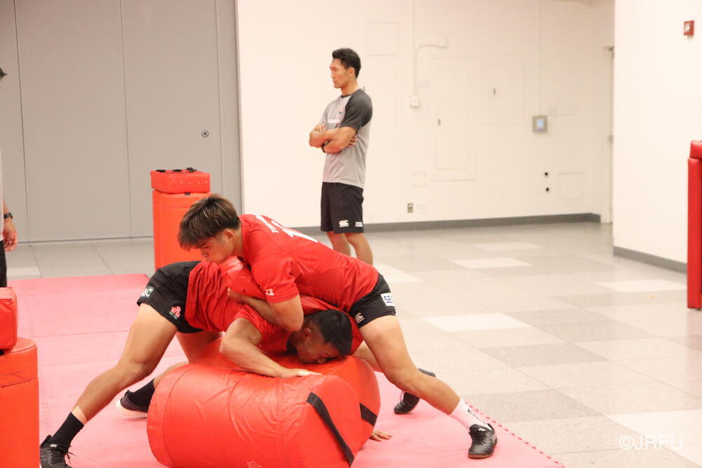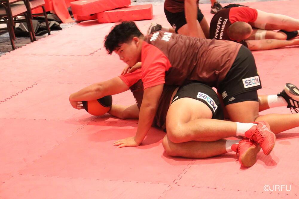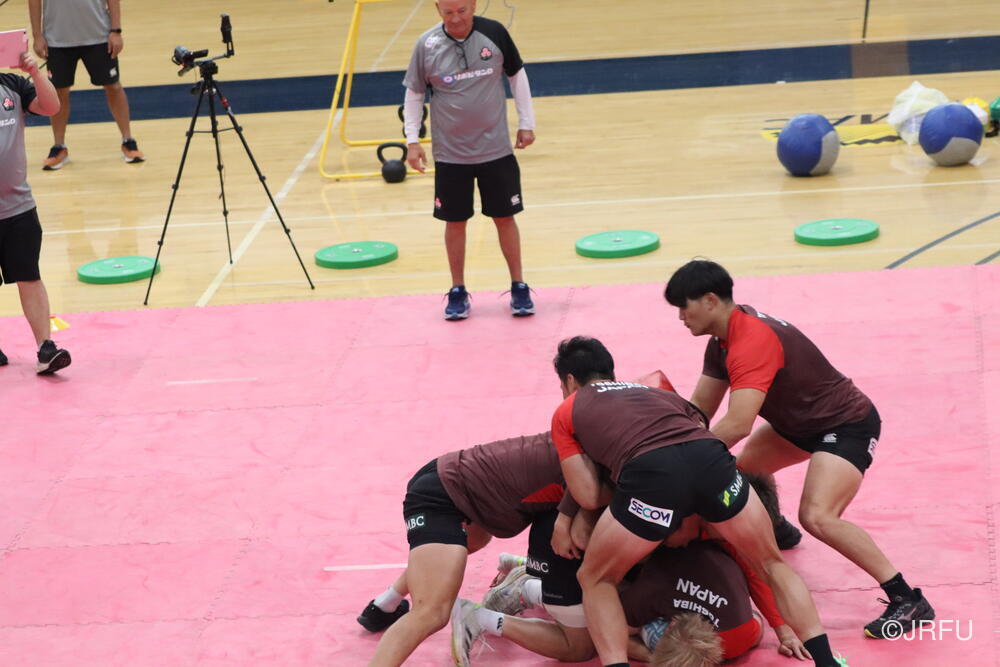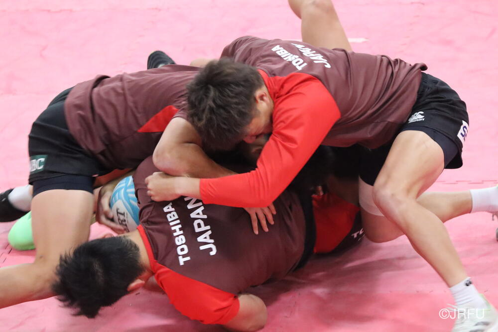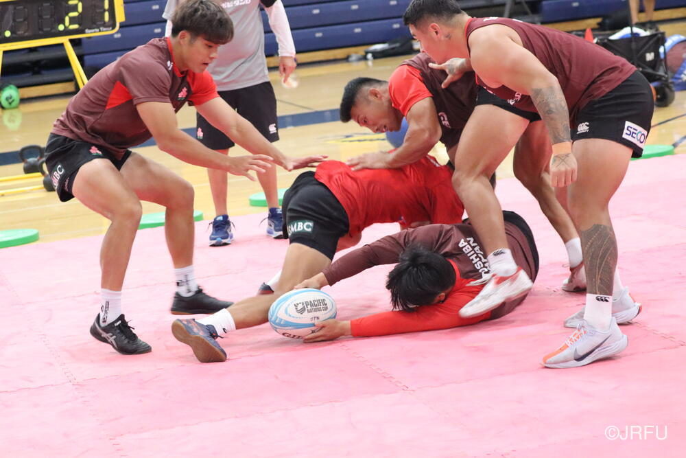 グラウンドでの練習の後も、トレーニングは続きます。こちらは今シーズン一貫して最重要強化項目となっているブレークダウンの練習です。