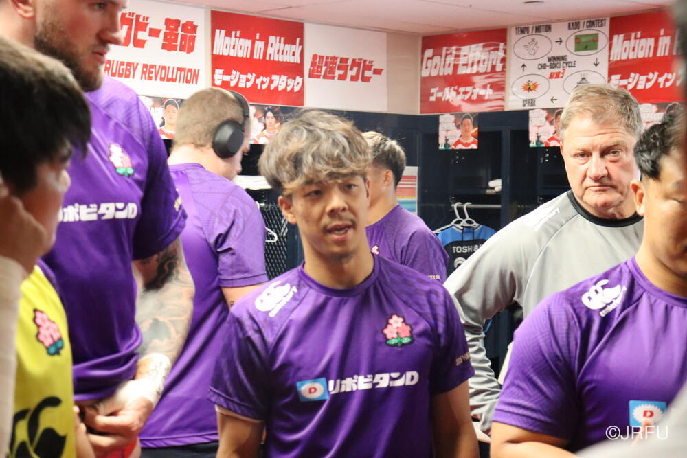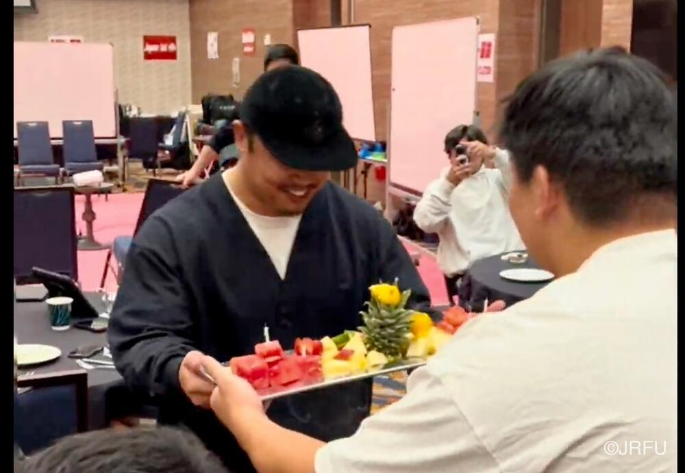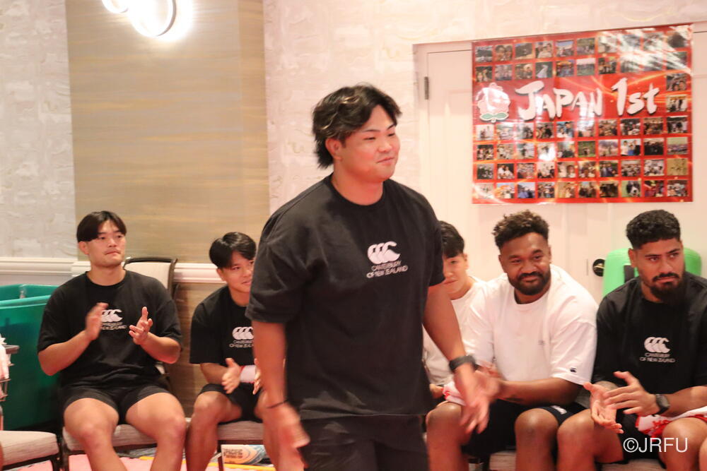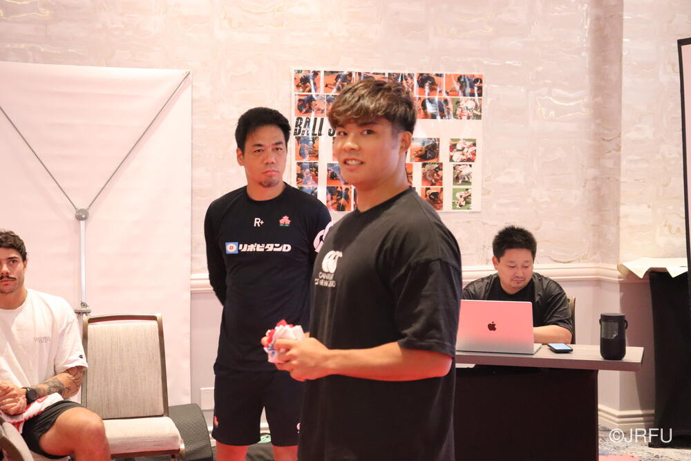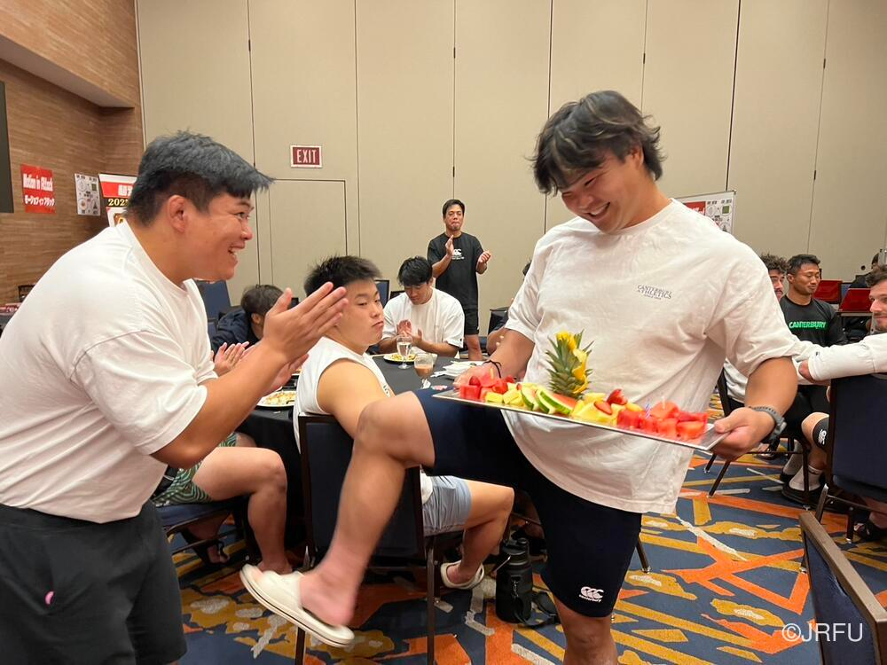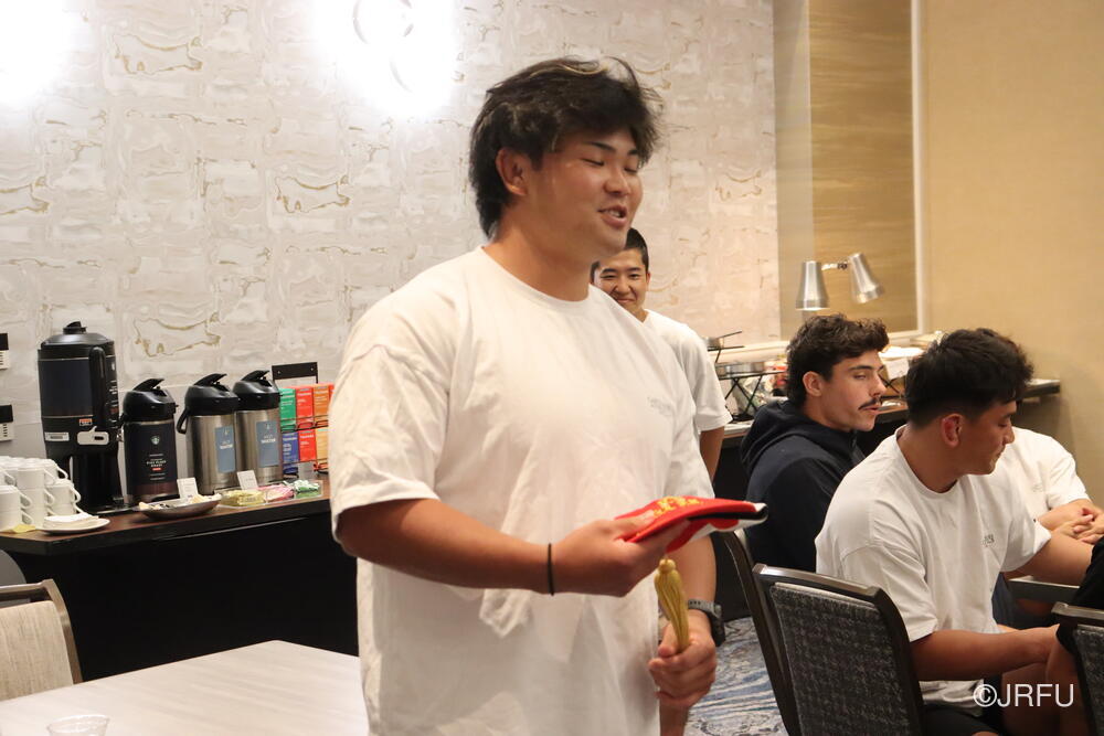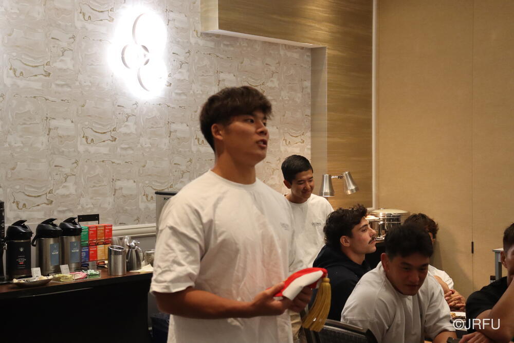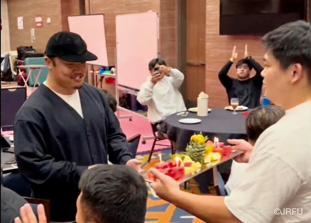 「24歳になりました。まだまだ若いのでエナジーを出して頑張っていきたいと思います。今週の試合(フィジー戦)は、全員で戦うべきだと思うので、フィジー戦に向けてもう一度一丸となって頑張っていきましょう!」とスピーチしました。