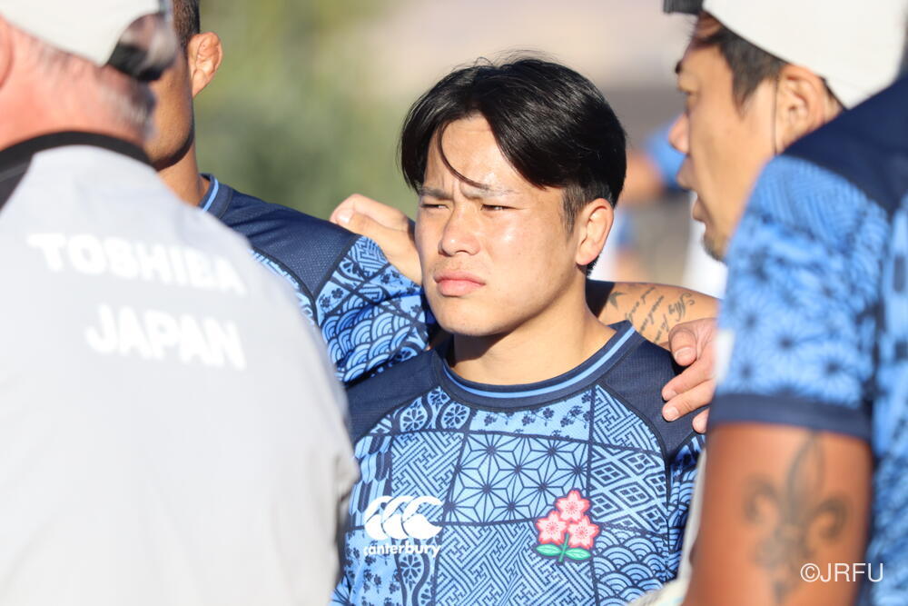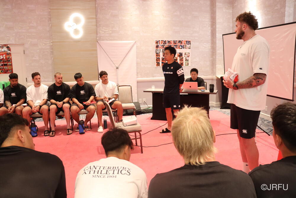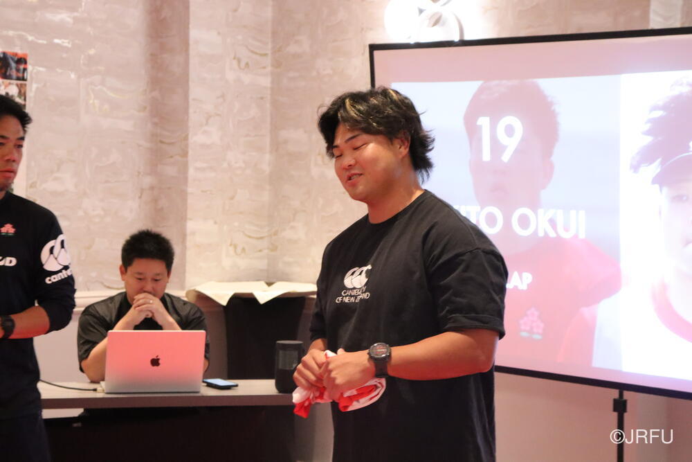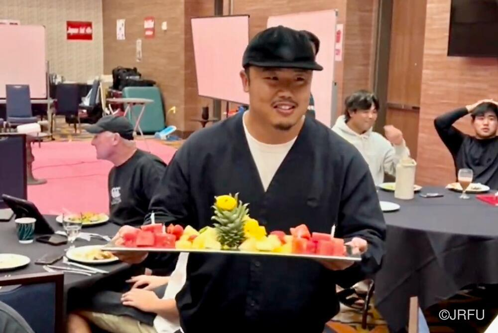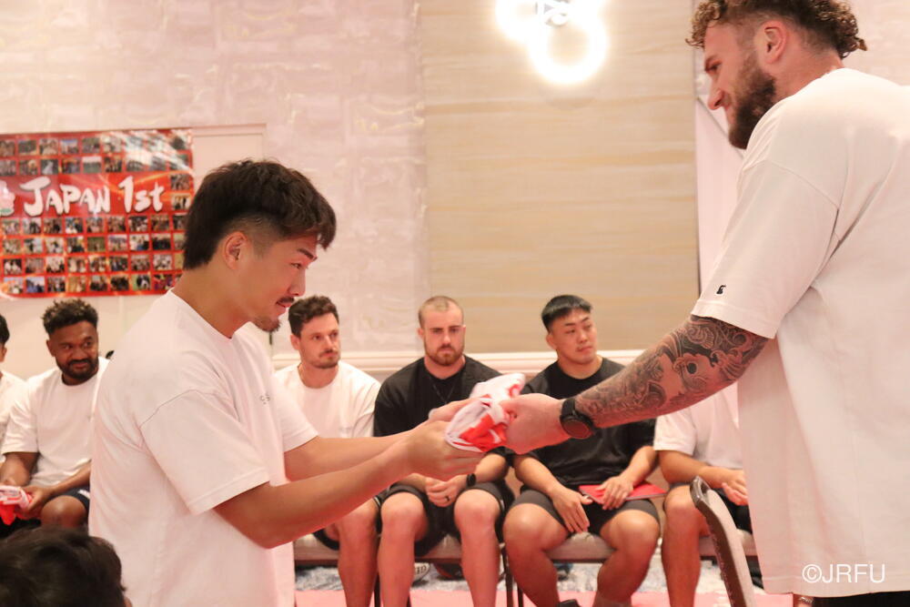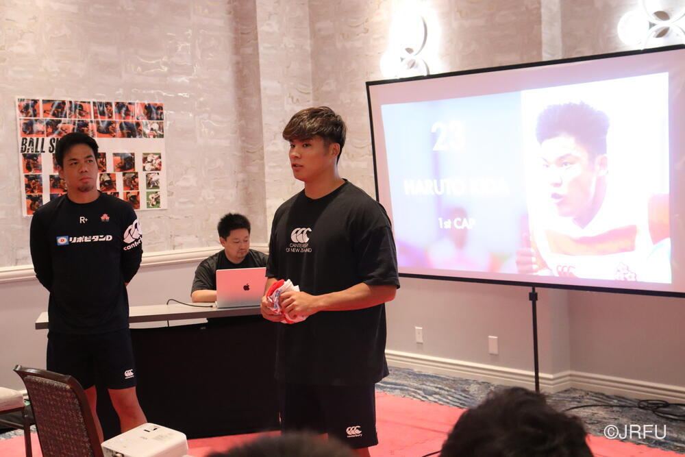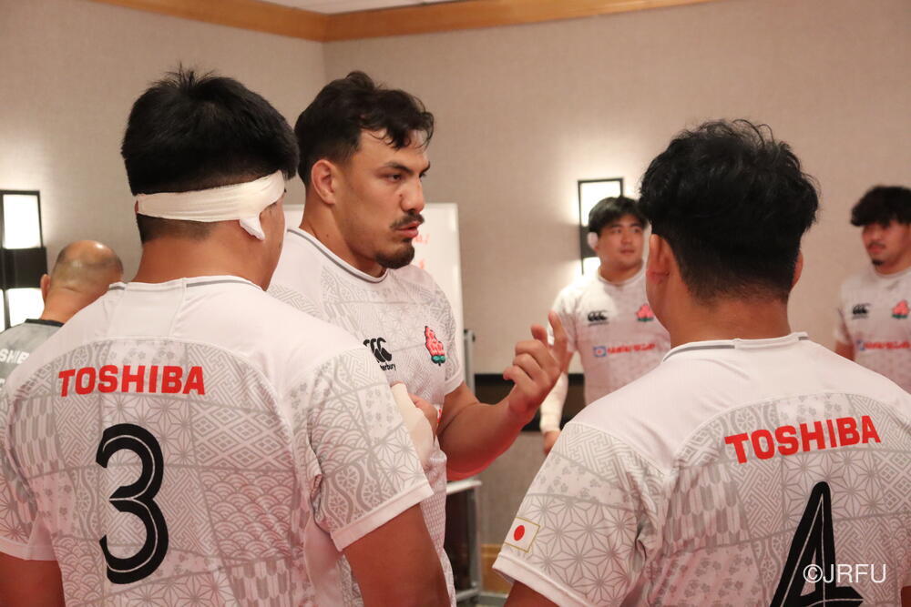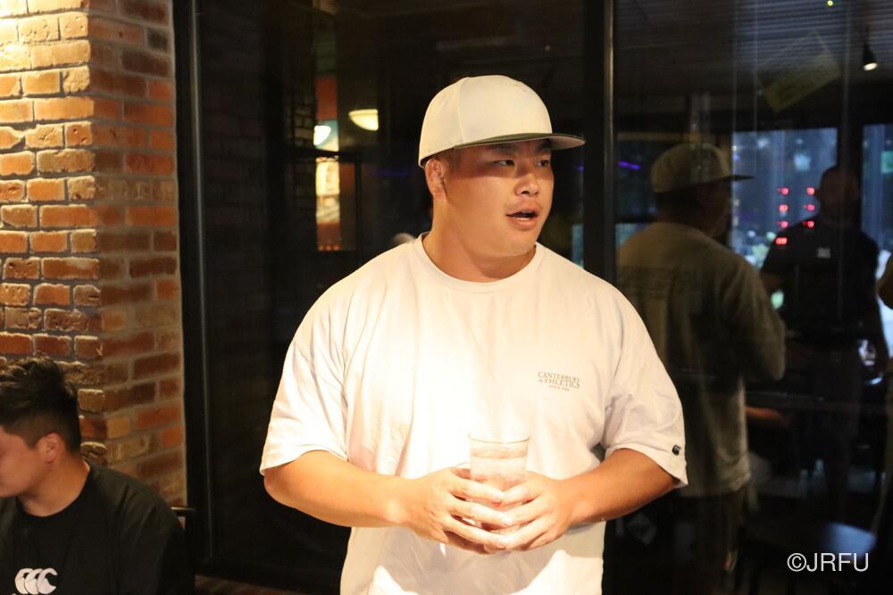 「24歳になりました。まだまだ若いのでエナジーを出して頑張っていきたいと思います。今週の試合(フィジー戦)は、全員で戦うべきだと思うので、フィジー戦に向けてもう一度一丸となって頑張っていきましょう!」とスピーチしました。