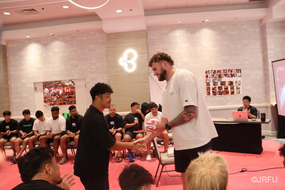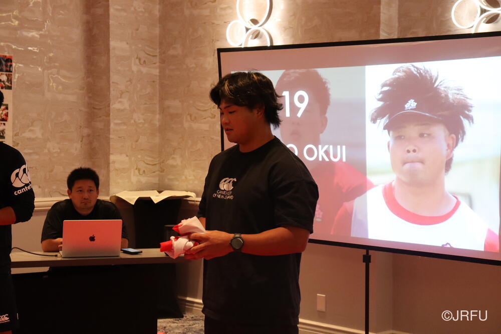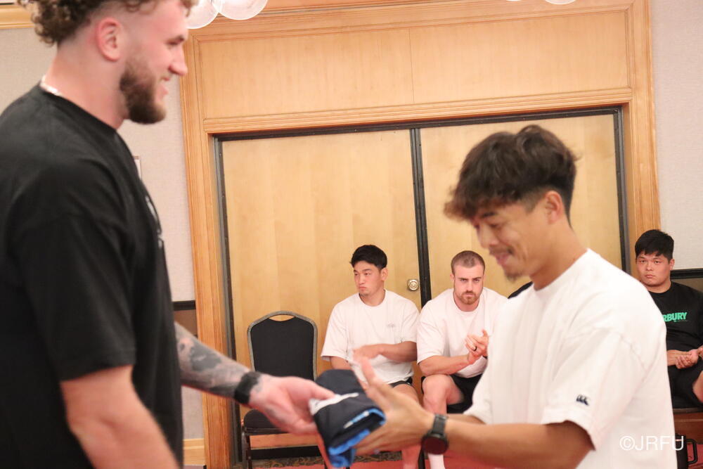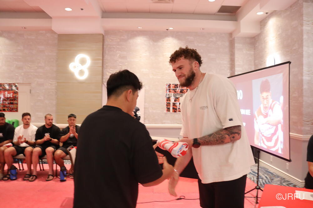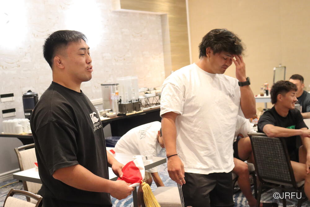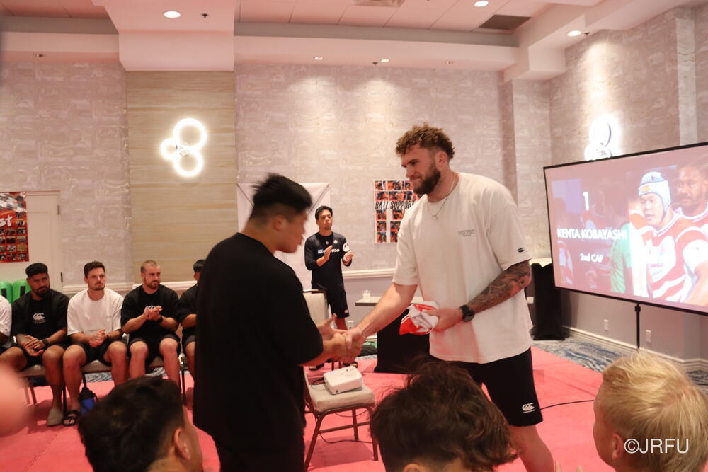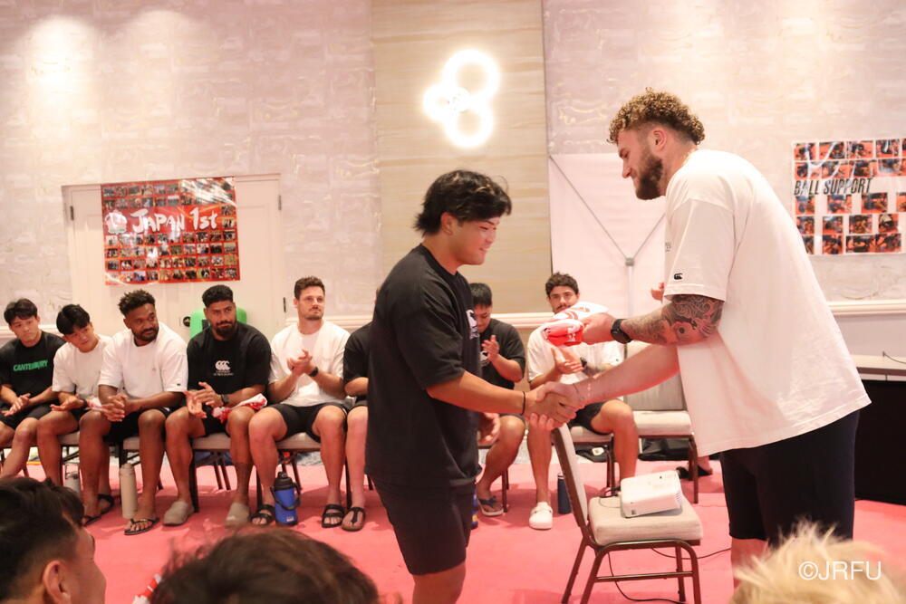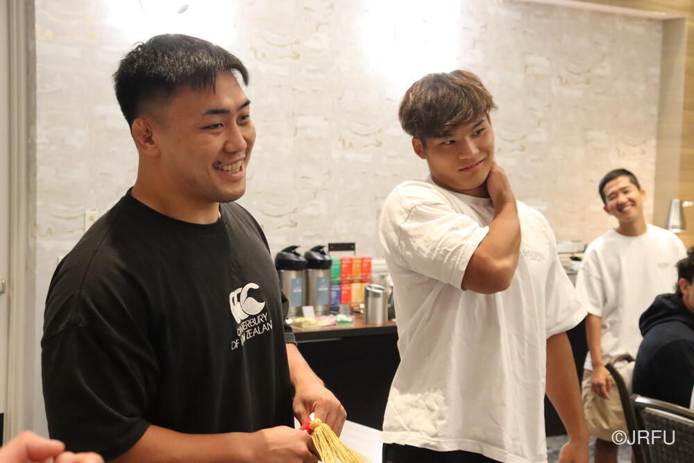 「24歳になりました。まだまだ若いのでエナジーを出して頑張っていきたいと思います。今週の試合(フィジー戦)は、全員で戦うべきだと思うので、フィジー戦に向けてもう一度一丸となって頑張っていきましょう!」とスピーチしました。