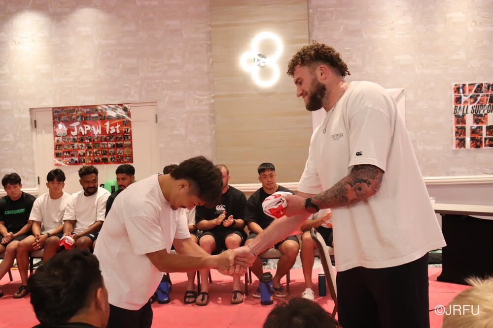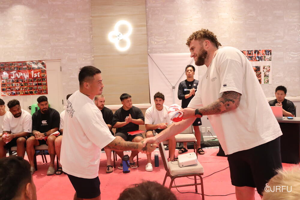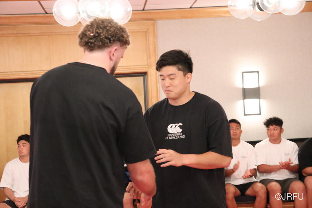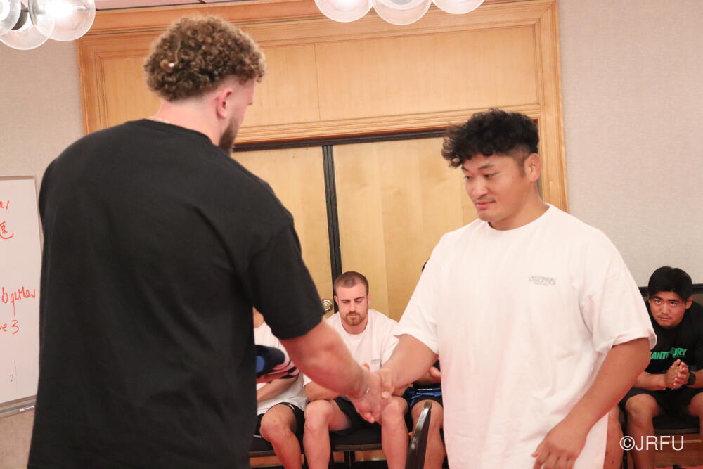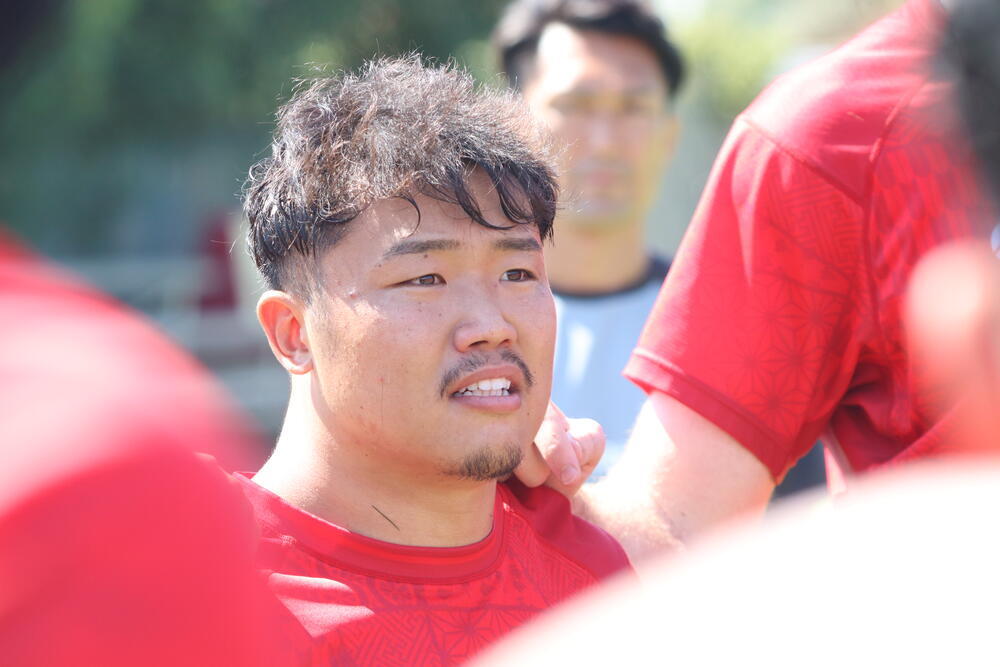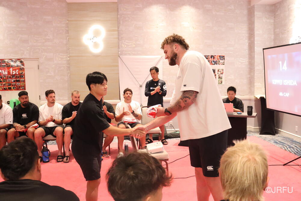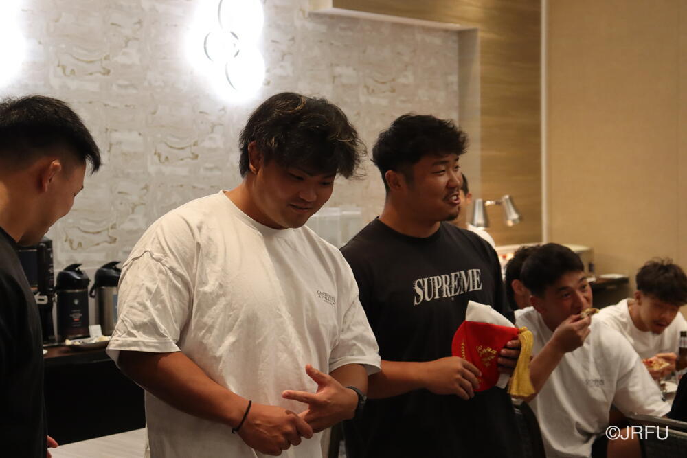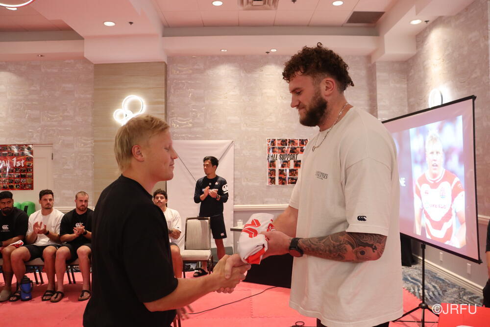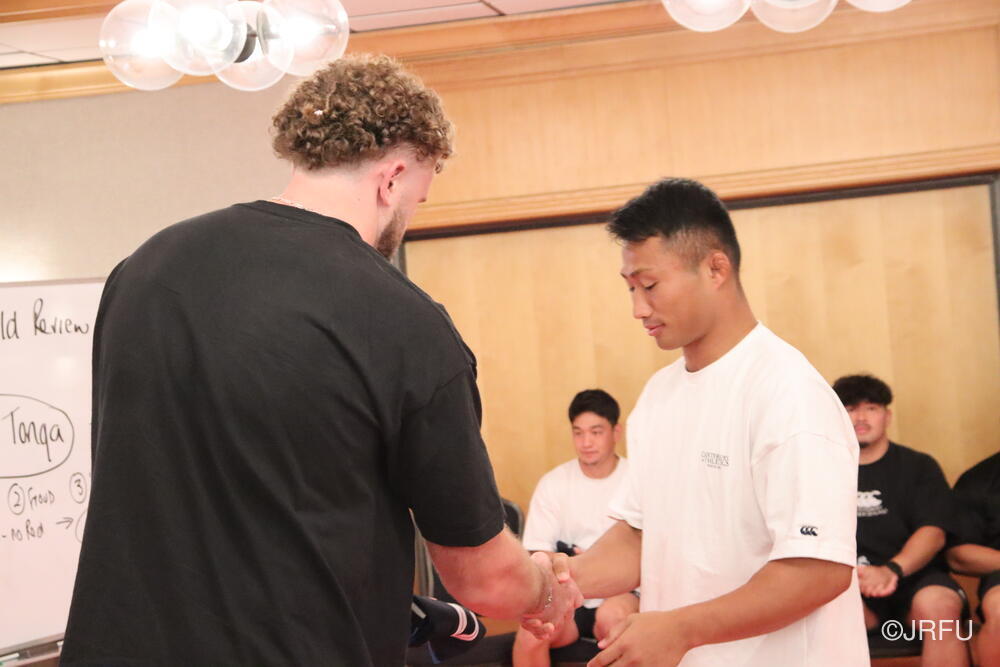 「24歳になりました。まだまだ若いのでエナジーを出して頑張っていきたいと思います。今週の試合(フィジー戦)は、全員で戦うべきだと思うので、フィジー戦に向けてもう一度一丸となって頑張っていきましょう!」とスピーチしました。