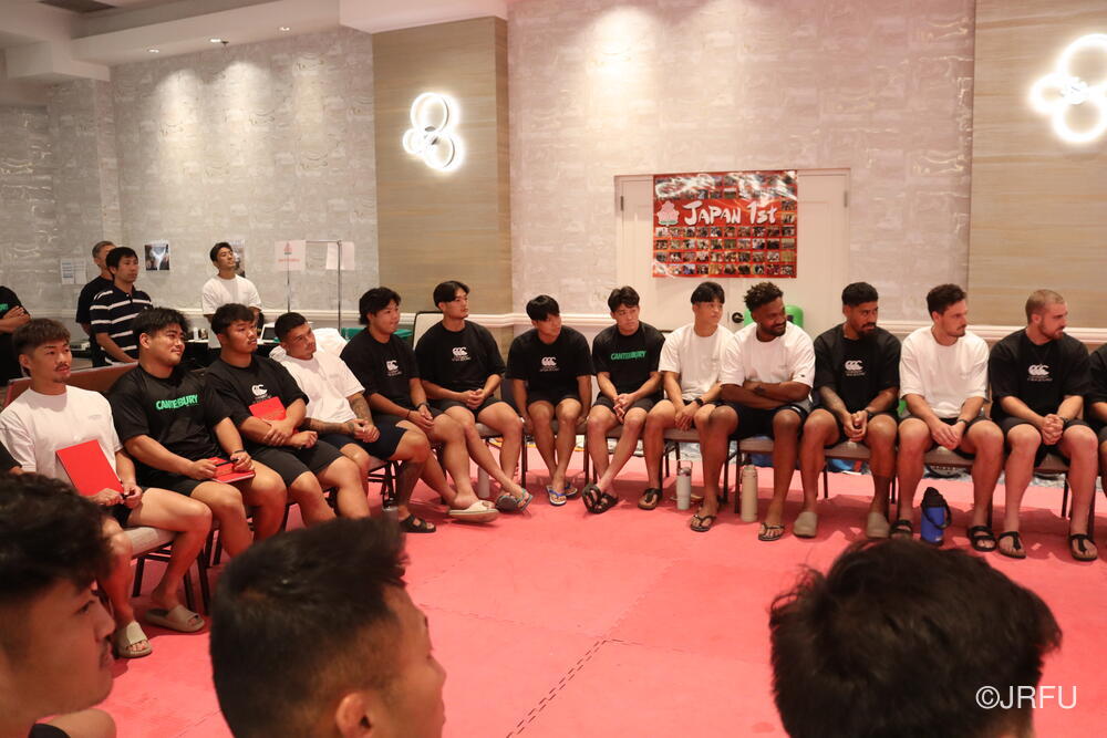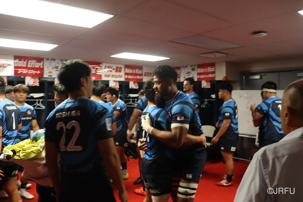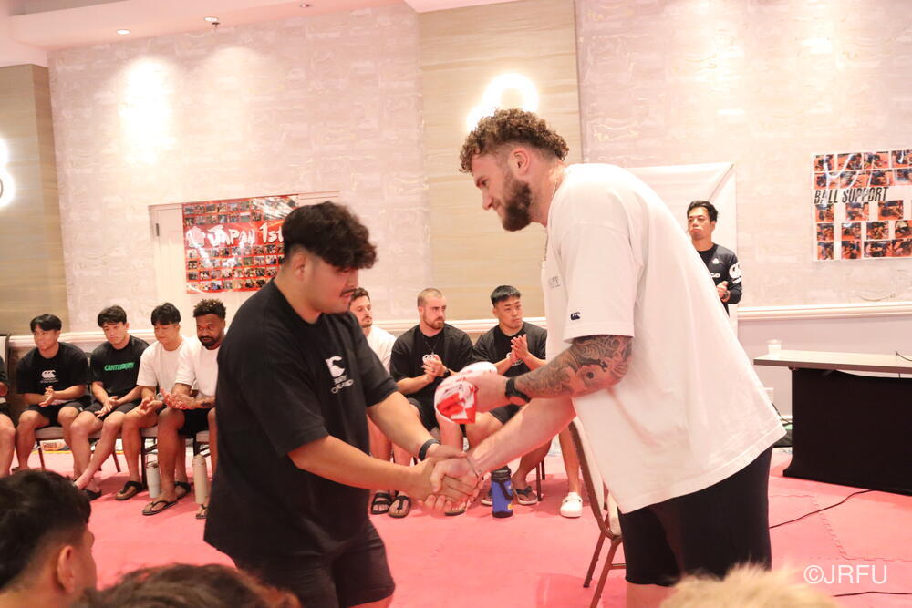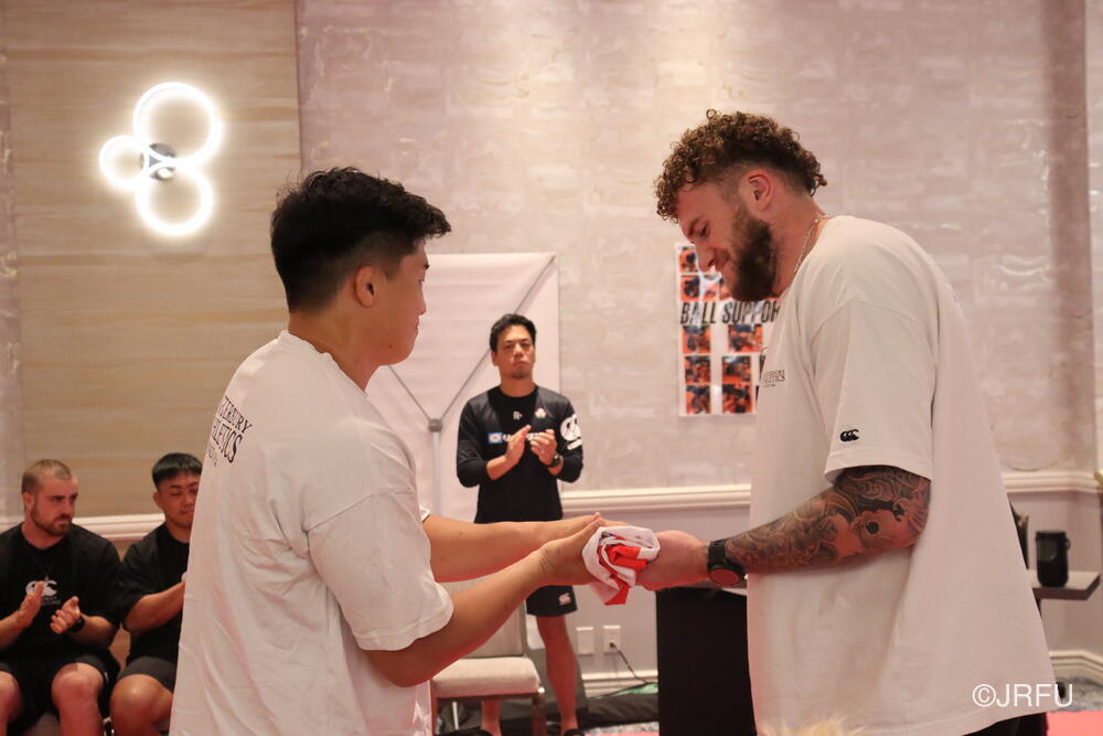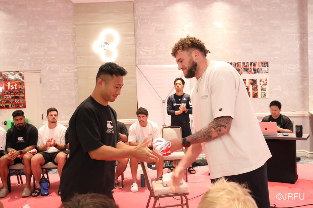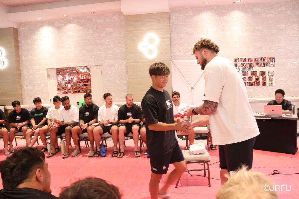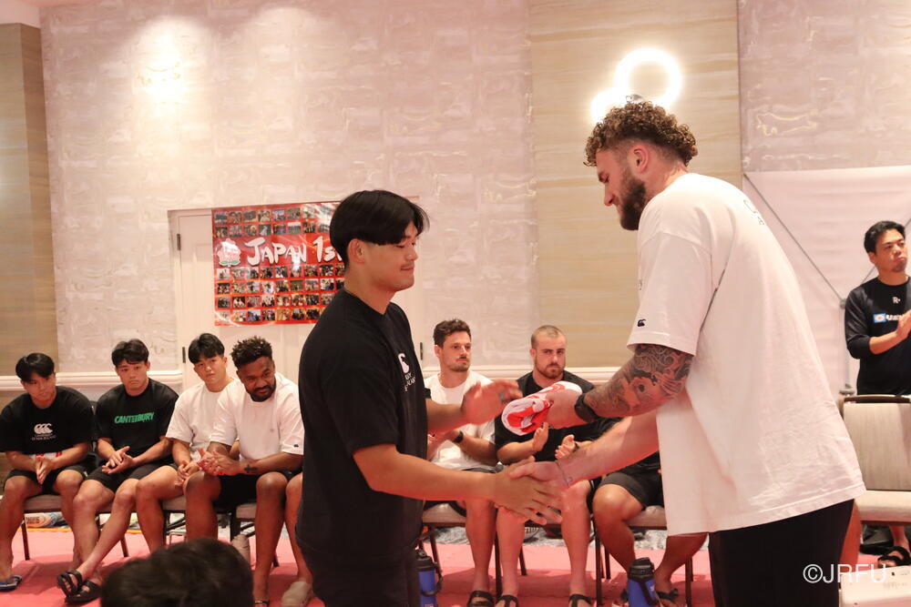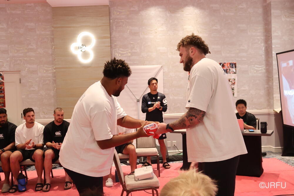 「24歳になりました。まだまだ若いのでエナジーを出して頑張っていきたいと思います。今週の試合(フィジー戦)は、全員で戦うべきだと思うので、フィジー戦に向けてもう一度一丸となって頑張っていきましょう!」とスピーチしました。