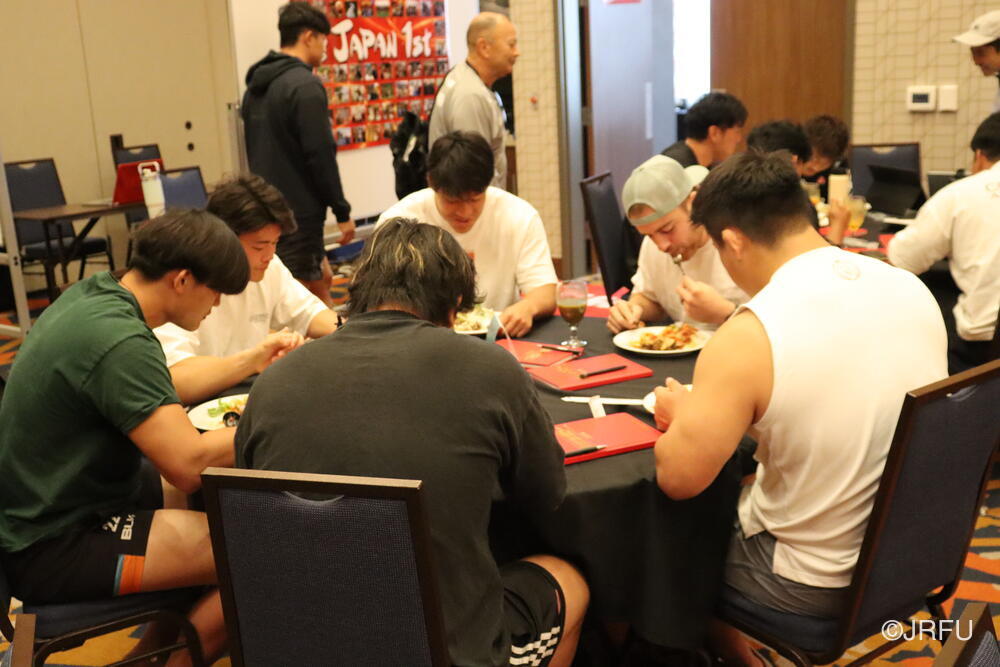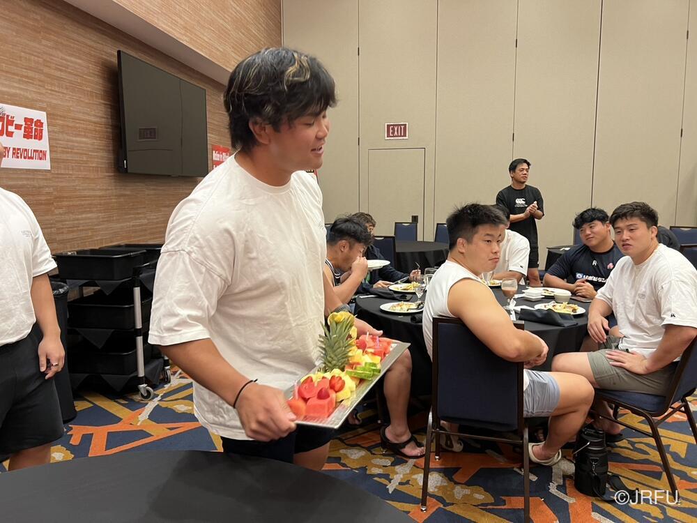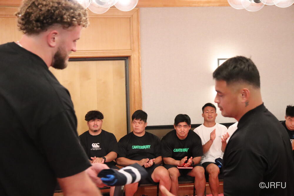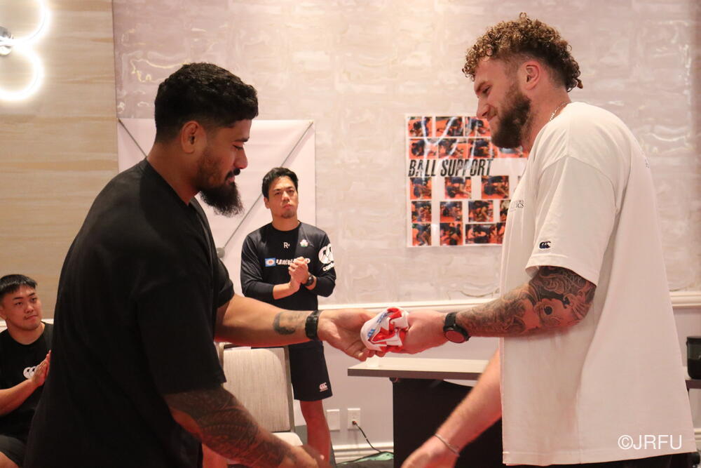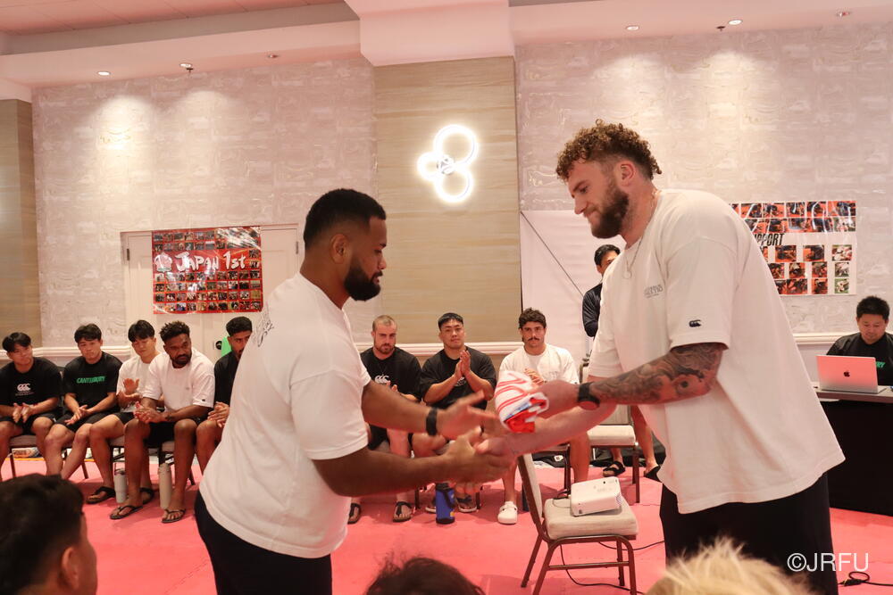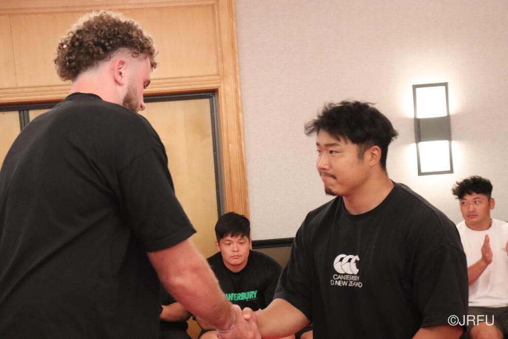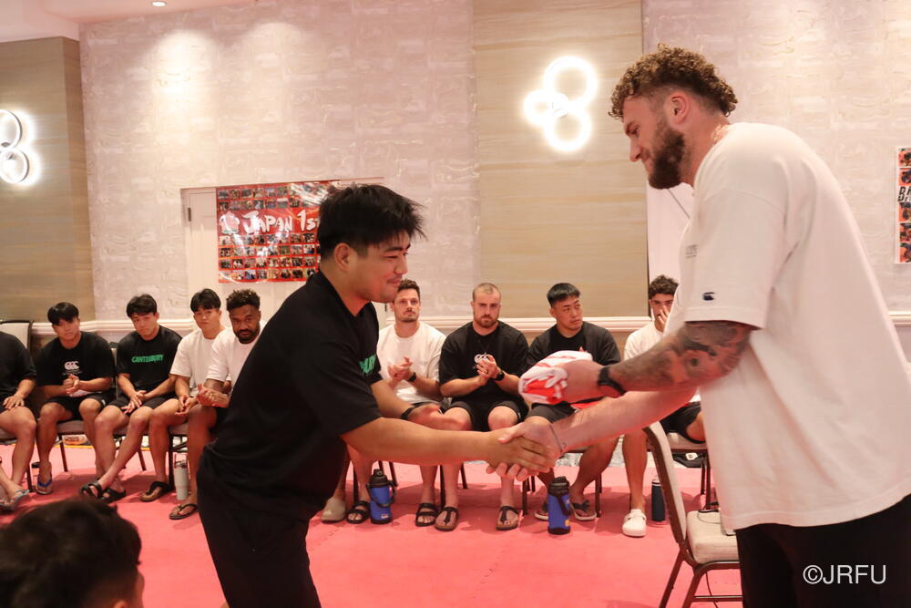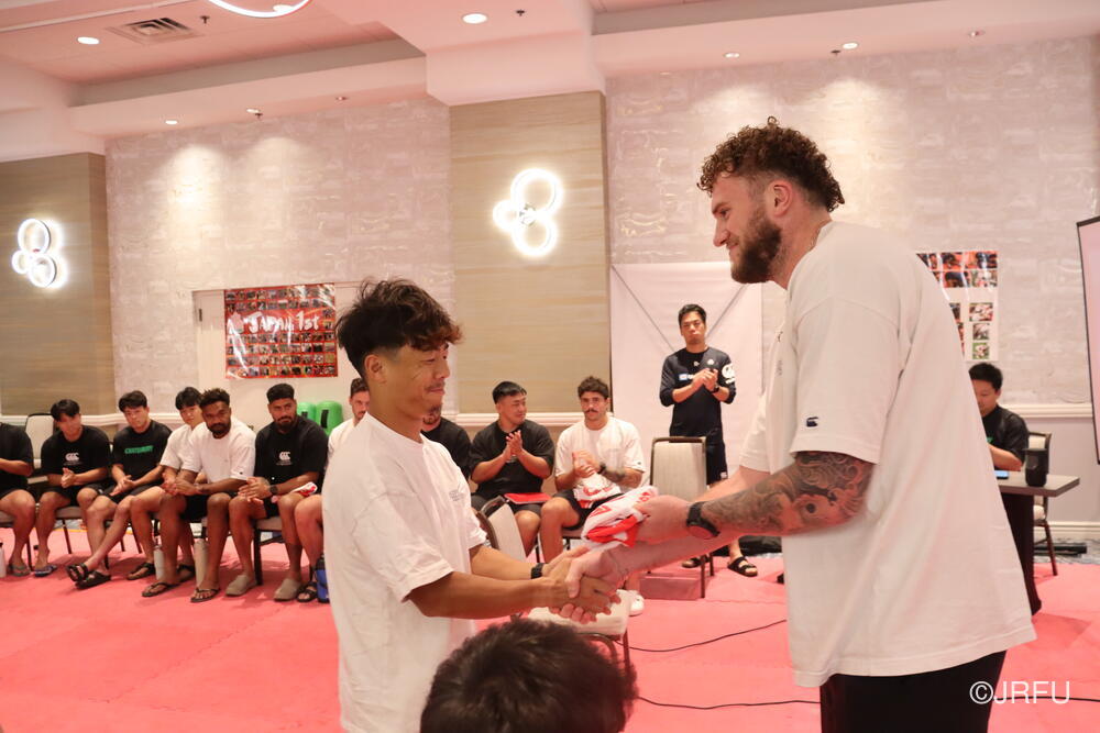 「24歳になりました。まだまだ若いのでエナジーを出して頑張っていきたいと思います。今週の試合(フィジー戦)は、全員で戦うべきだと思うので、フィジー戦に向けてもう一度一丸となって頑張っていきましょう!」とスピーチしました。
