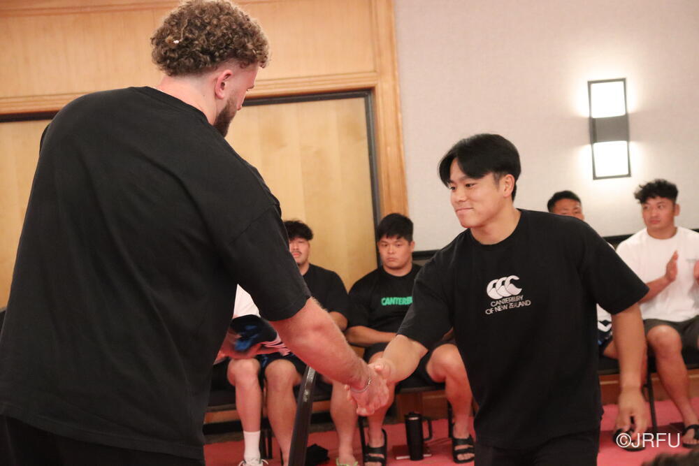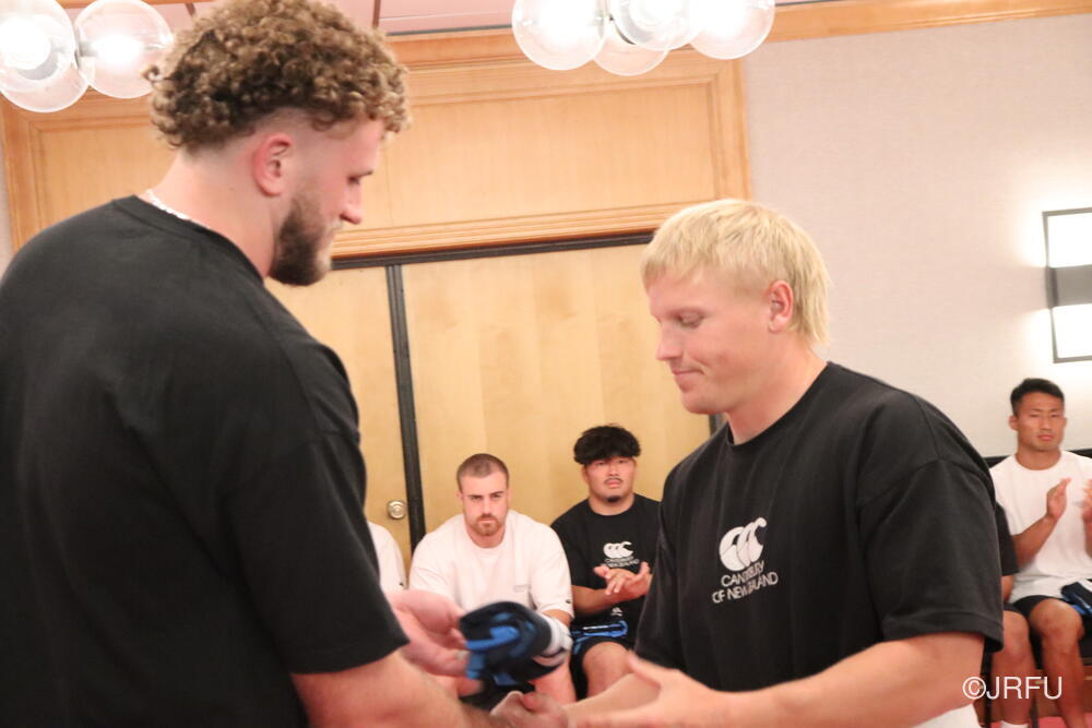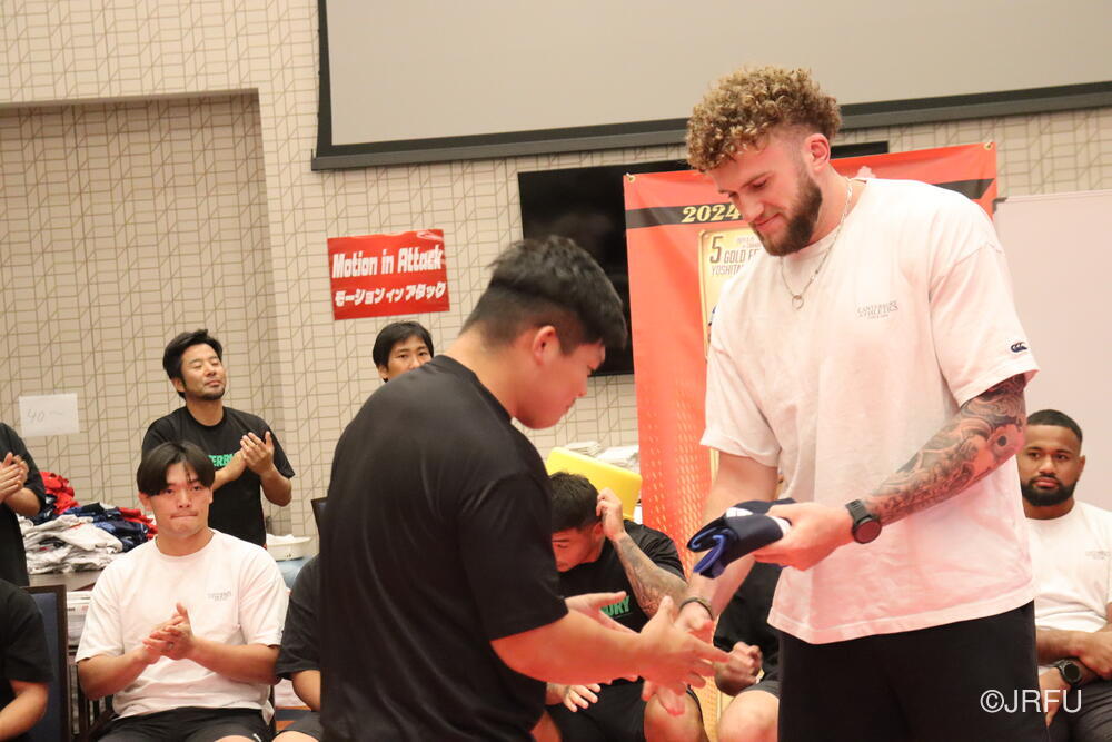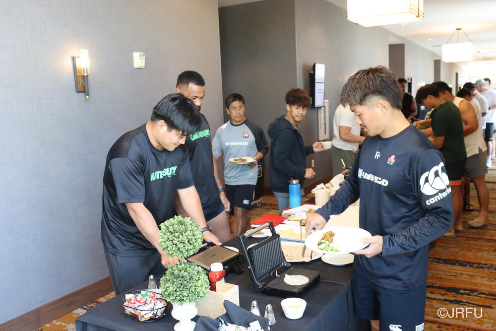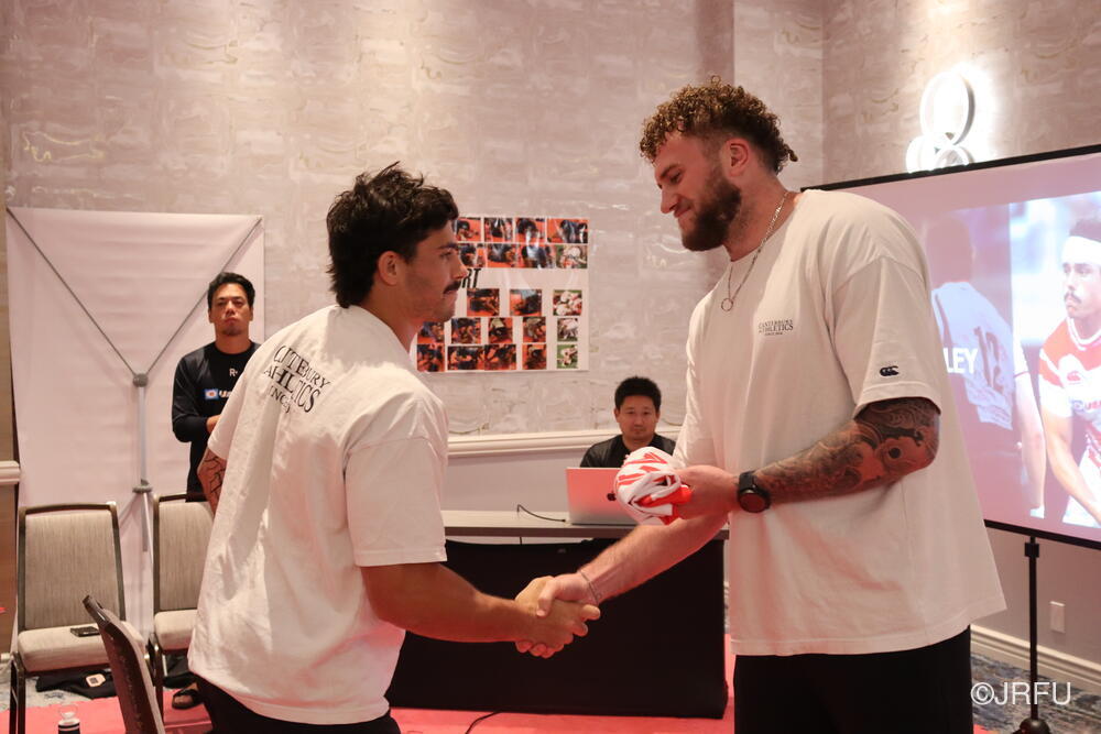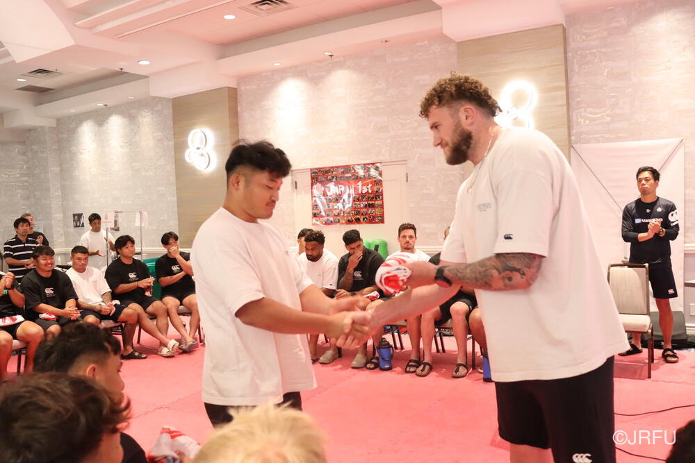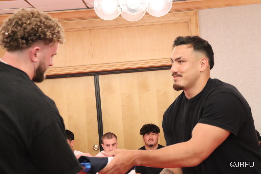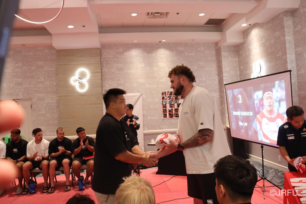 「24歳になりました。まだまだ若いのでエナジーを出して頑張っていきたいと思います。今週の試合(フィジー戦)は、全員で戦うべきだと思うので、フィジー戦に向けてもう一度一丸となって頑張っていきましょう!」とスピーチしました。