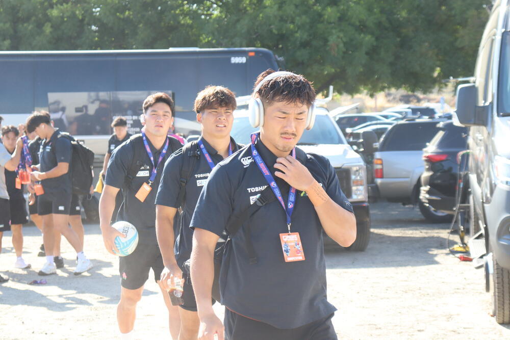休憩のため、バスから降りてきた選手たち。時差ボケで少し眠たそうです。
