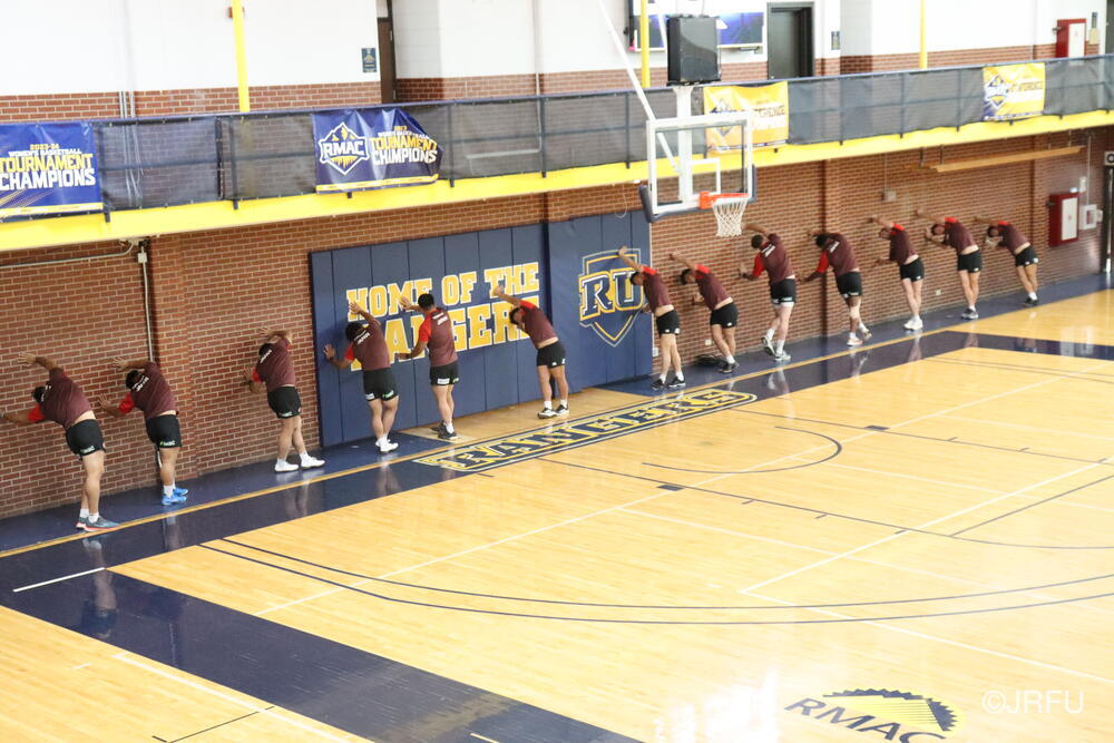 ここで選手たちは、体をほぐすストレッチを行いました。