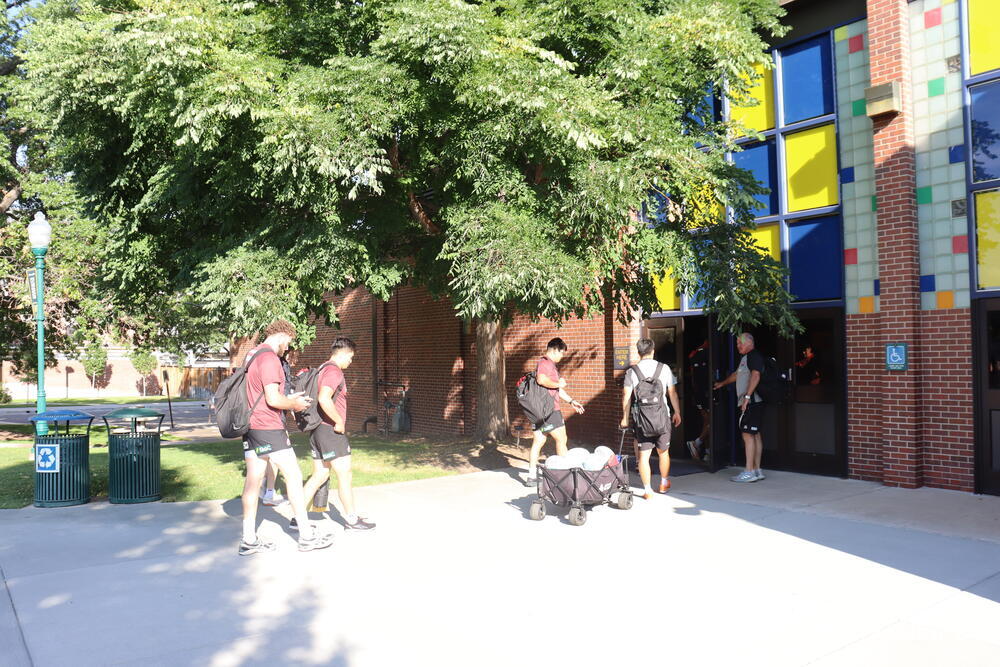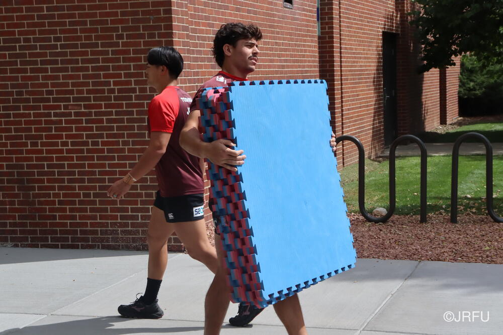 チームの用具を運ぶ選手達。スタッフだけではなく、選手自身も用具の運搬を手伝っています。