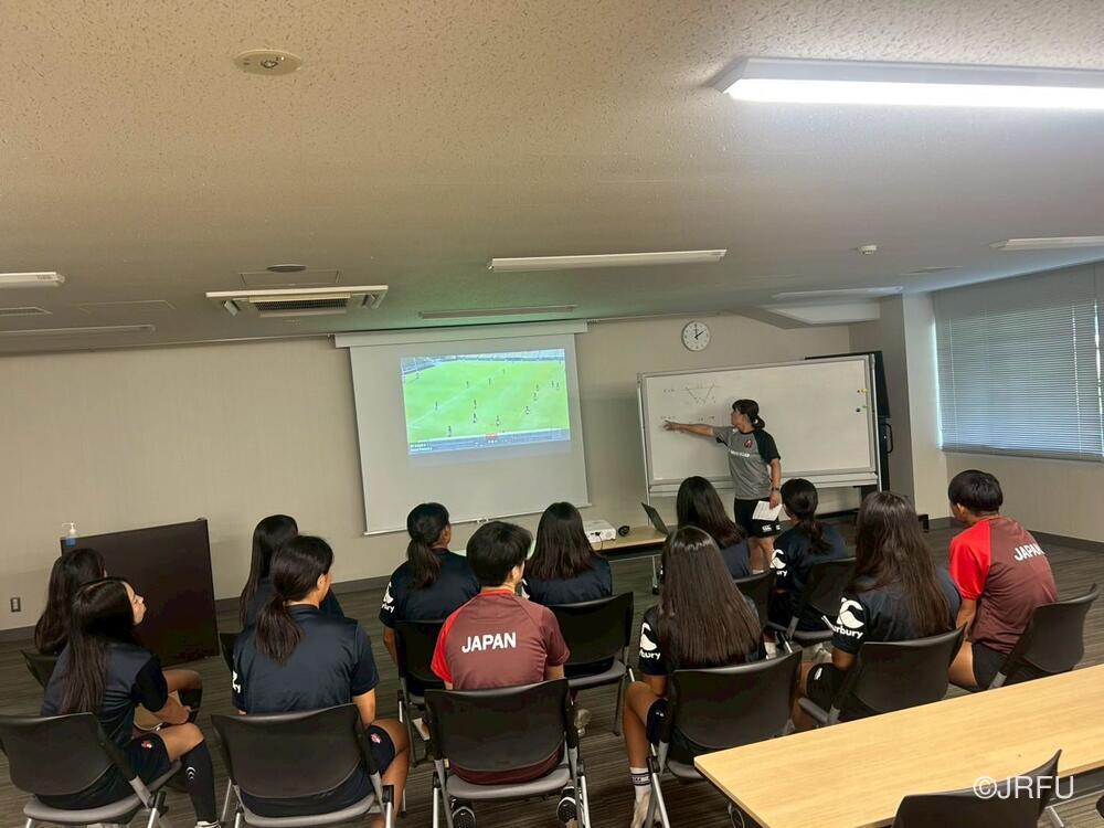 鈴木陽子コーチから事前に頂いていた課題の「何のために勝つのか」「何を成し遂げたいか」をみんなで共有しあいました。その後、女子ラグビーワールドカップ2025で戦った日本代表選手のコメントを紹介いただきながら、選手たちの表情は、同じ桜を胸に戦う覚悟へと変わっていきました。