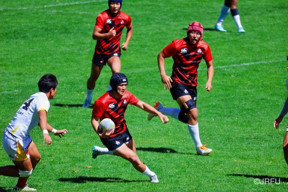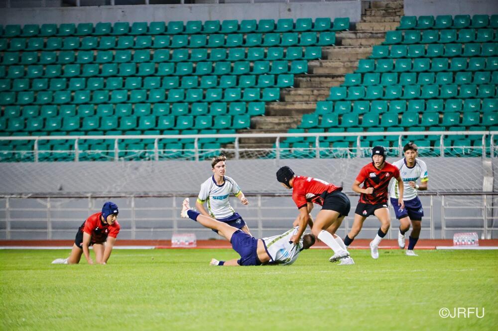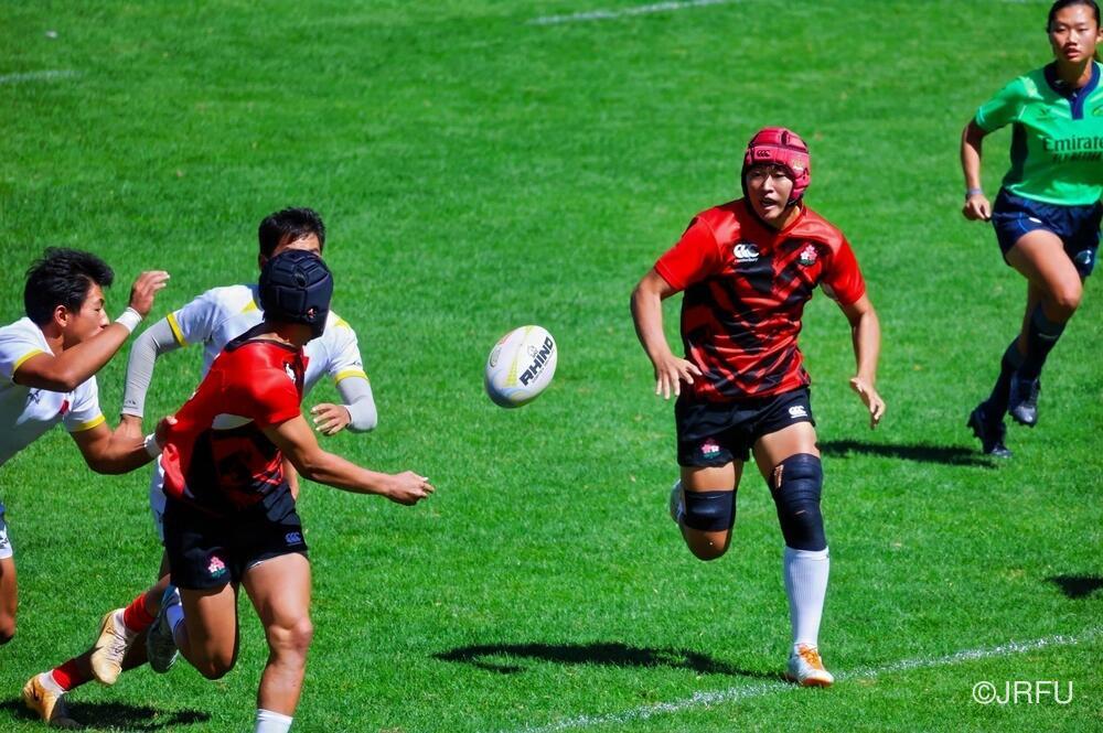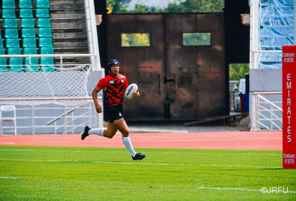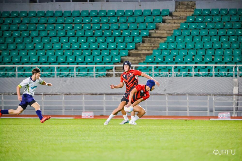 初戦のチャイニーズ・タイペイ代表戦は、初戦の堅さはあったものの、池田 健心選手のハットトリックなどもあり、31-5で快勝。2戦目のマレーシア代表戦は、前半序盤は相手のプレッシャーに手こずるものの、3分に宮下 隼選手がトライを取ると、そこから立て続けに2トライを奪い、前半を折り返します。後半は、山本 愛翔選手の2トライを含む4トライを奪い、47-7で快勝!3戦目のカザフスタン代表戦は、前半・後半ともに5トライずつ奪い、相手も無失点に抑えることができ、64-0と3連勝でプール戦を1位で終えました。
