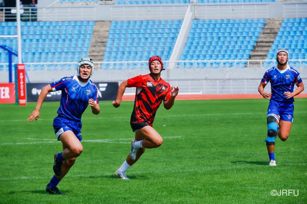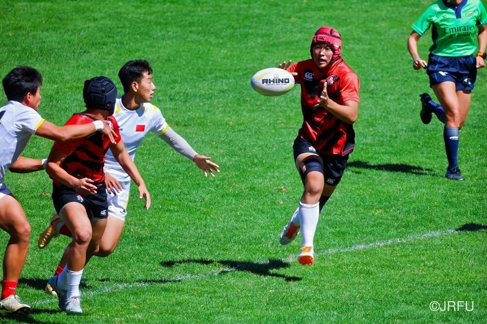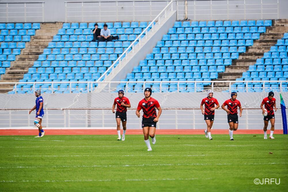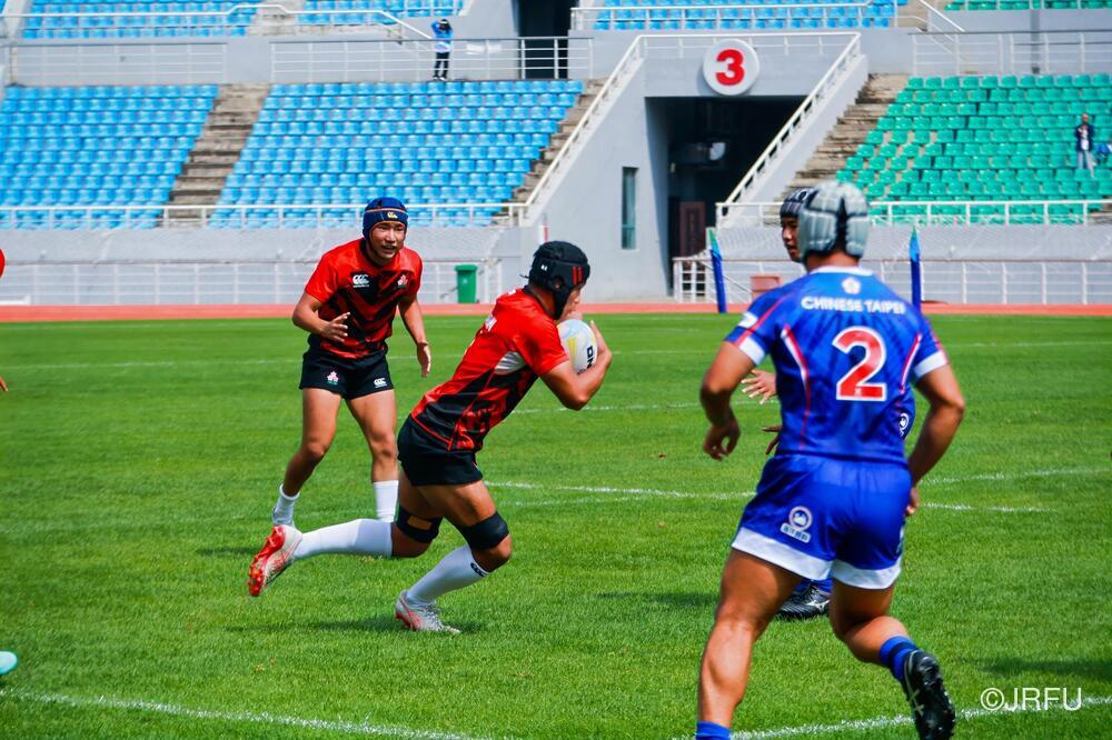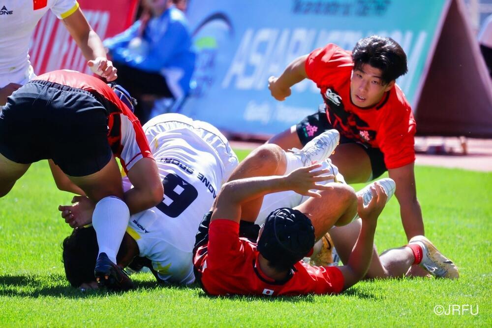 初戦のチャイニーズ・タイペイ代表戦は、初戦の堅さはあったものの、池田 健心選手のハットトリックなどもあり、31-5で快勝。2戦目のマレーシア代表戦は、前半序盤は相手のプレッシャーに手こずるものの、3分に宮下 隼選手がトライを取ると、そこから立て続けに2トライを奪い、前半を折り返します。後半は、山本 愛翔選手の2トライを含む4トライを奪い、47-7で快勝!3戦目のカザフスタン代表戦は、前半・後半ともに5トライずつ奪い、相手も無失点に抑えることができ、64-0と3連勝でプール戦を1位で終えました。