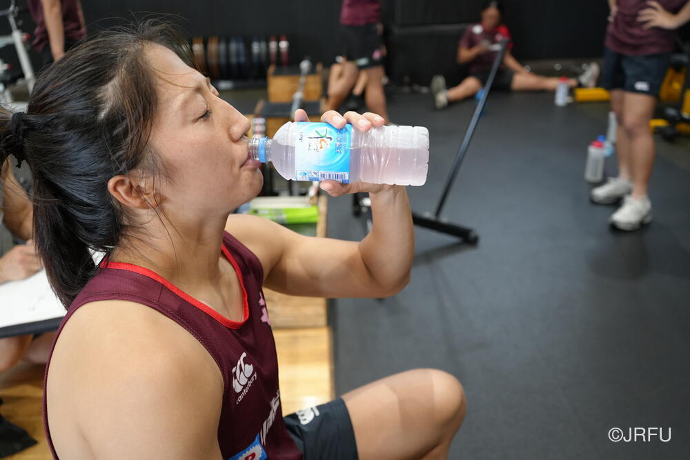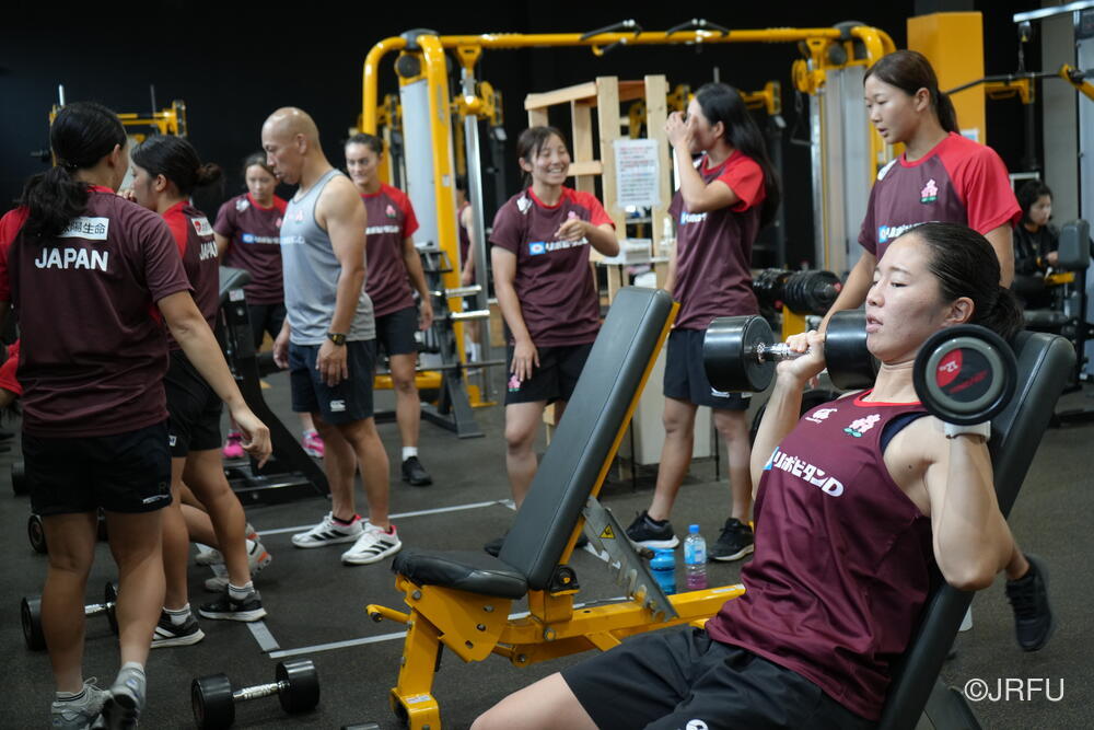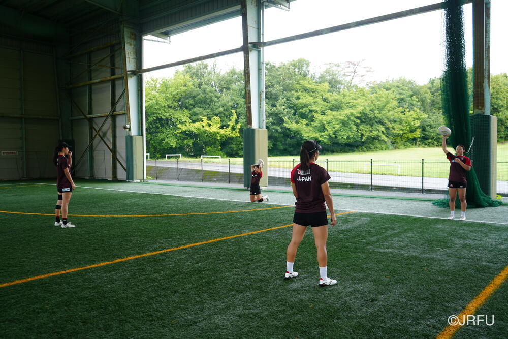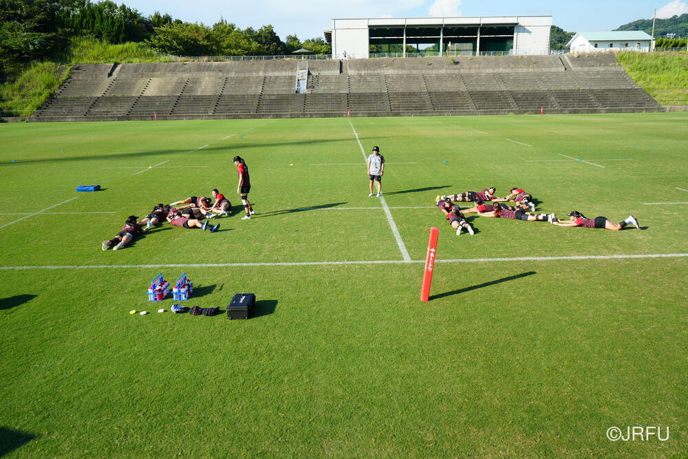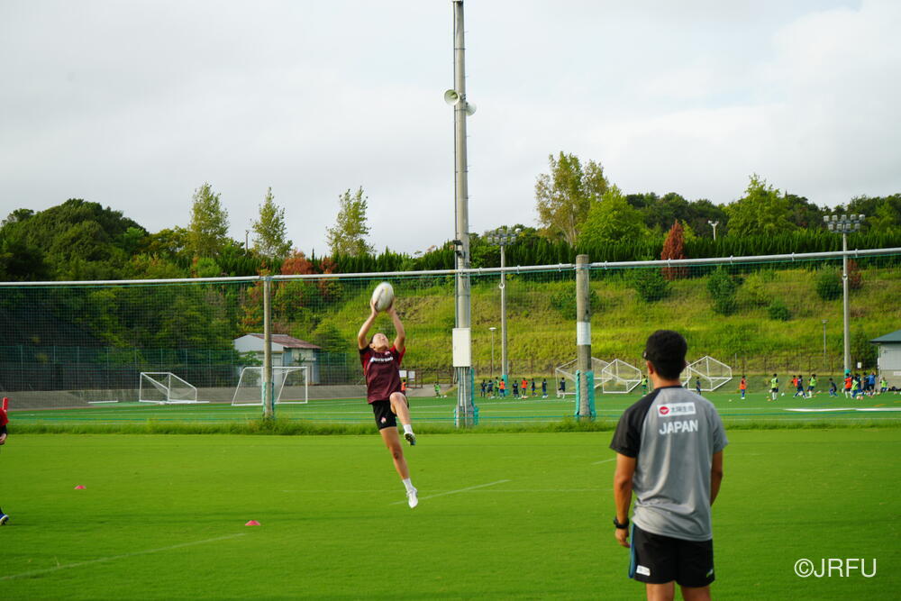今日も午前・午後のフィールドトレーニングとジムセッションを行いました。昨日までと違い、日中お天気が良く、蒸し暑い1日でした。日曜日だったこともあり、近くの高校の男子ラグビー部の学生や親子の見学者がたくさんいらっしゃいました。